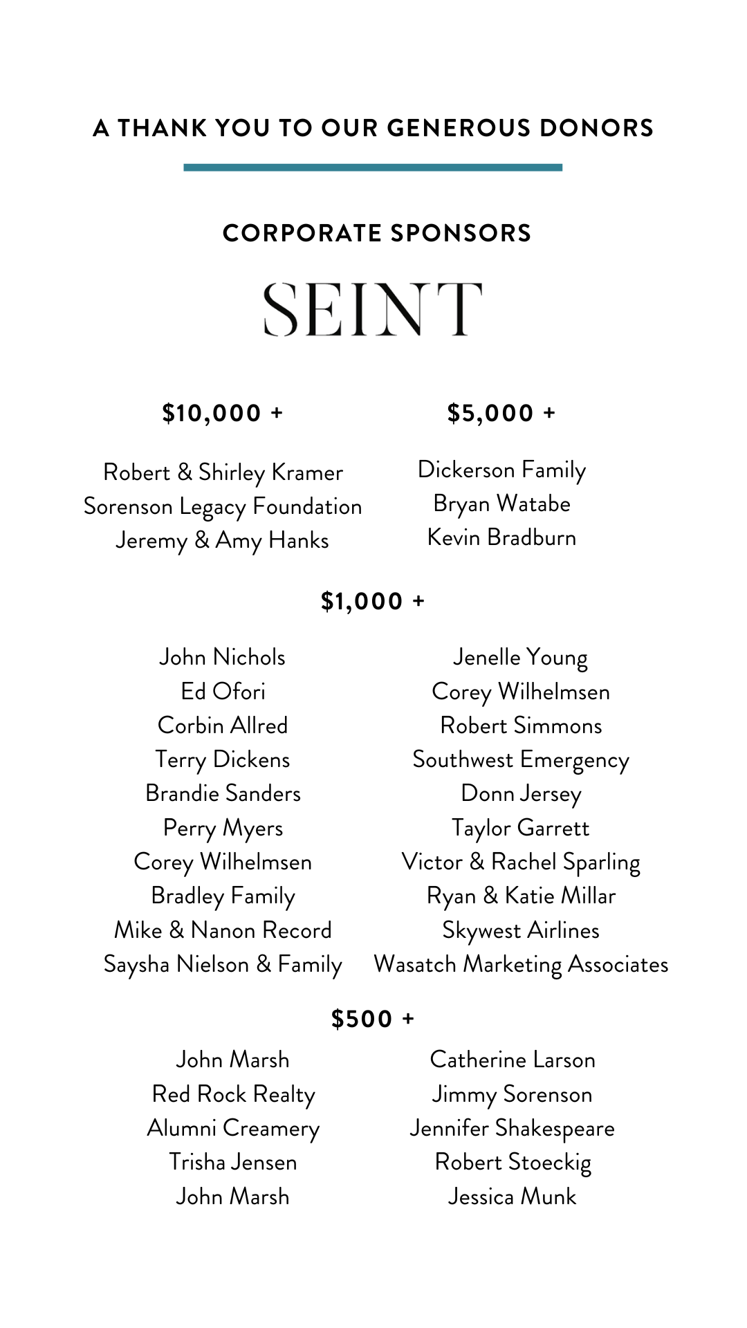 List of donors for an event, divided into 'Legacy Donors' and 'More Gracious Donors,' with a message to support arts in Southern Utah and a QR code at the bottom.