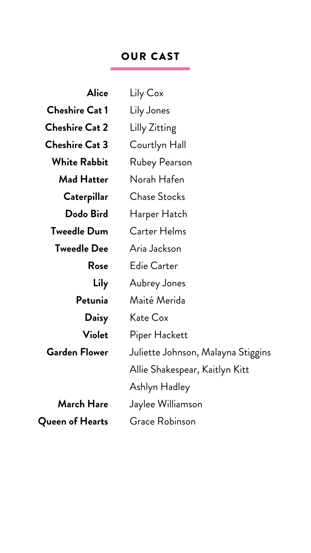 Cast list with names and roles, including Lily Cox, Lily Jones, Lily Zitting, Courtnly Hall, Rubey Pearson, Norah Hafen, Chase Stocks, Harper Hatch, Carter Helms, Aria Jackson, Edie Carter, Aubrey Jones, Maité Merida, Kate Cox, Piper Hackett, Juliett
