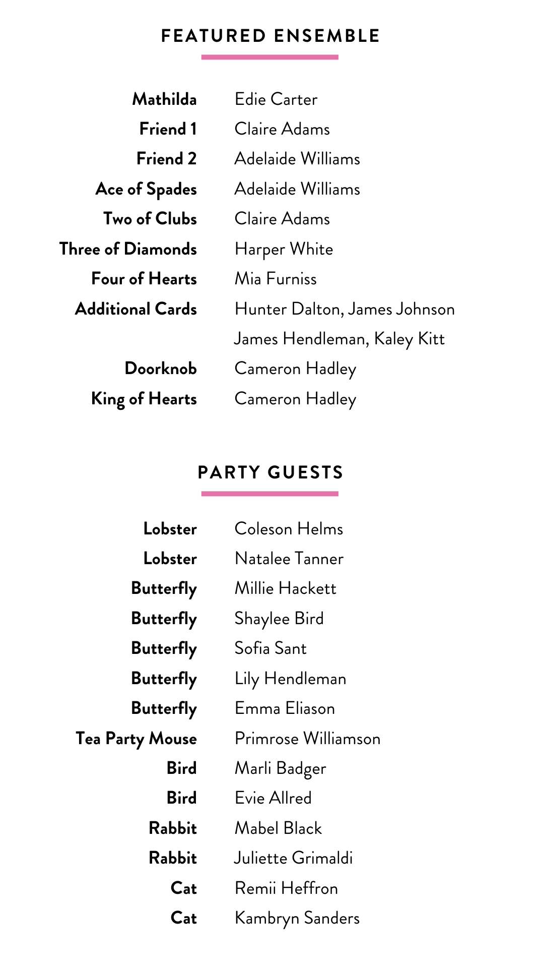 List of names divided into two sections: Featured Ensemble and Party Guests, with pink underlines above section headings.