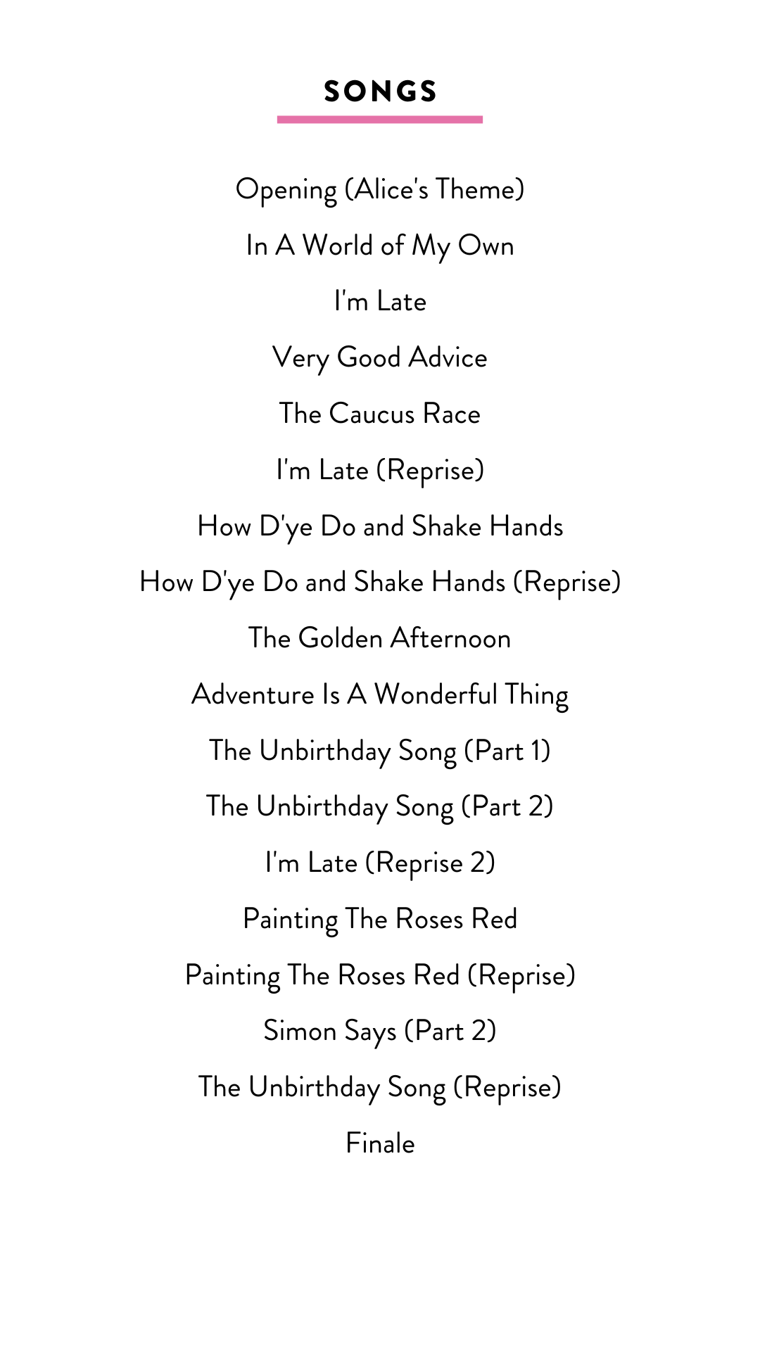 List of song titles from a play or musical, including 'Opening (Alice's Theme)', 'In A World of My Own', 'I'm Late', 'Very Good Advice', 'The Caucus Race', 'I'm Late (Reprise)', 'How D'ye Do and Shake Hands', 'The Golden Afternoon', 'Adventure Is A W