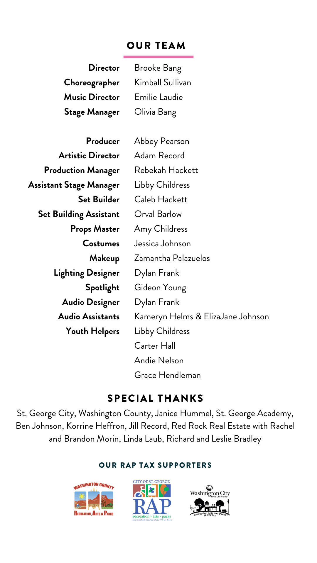A list of team members and credits for a production, including roles such as Director, Choreographer, Music Director, Stage Manager, and others, with their names. Also includes special thanks and logos for Washington County Recreation, City of St. Ge