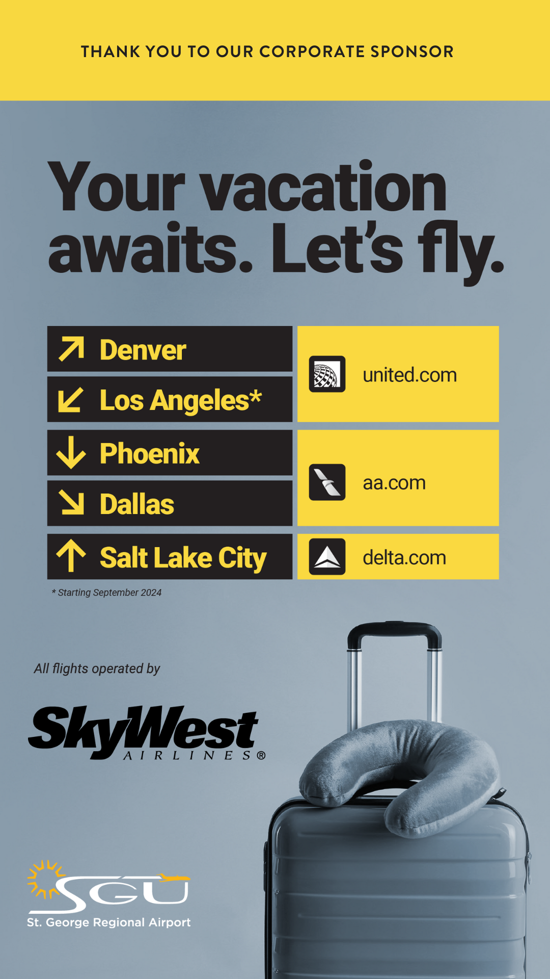 A promotional poster for SkyWest Airlines at St. George Regional Airport displaying flight information to various destinations, including Denver, Los Angeles, Phoenix, Dallas, and Salt Lake City, with the airline's logo and an image of a suitcase wit