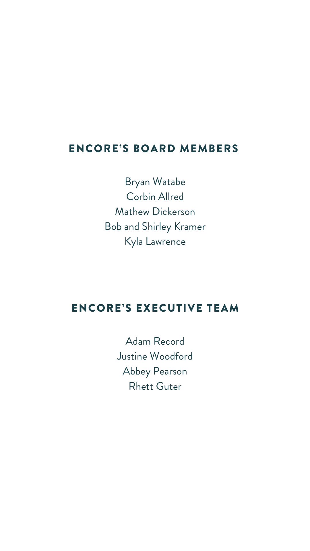 Encore Performing Arts mission statement on a blue background, with a logo featuring a teal circle and a white letter 'e!'.