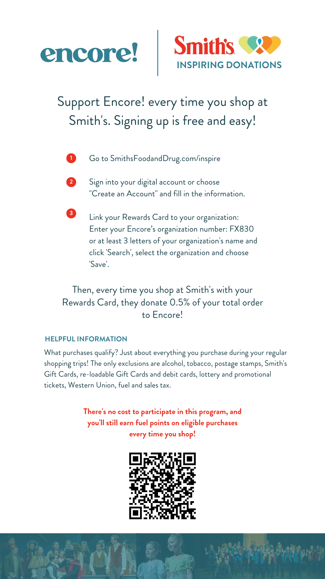 Informational flyer for Smith's donation program supporting Encore! with instructions for signing up through Smith's website, linking Rewards Card, and earning donations on eligible purchases. Includes a QR code and a group of children at the bottom.