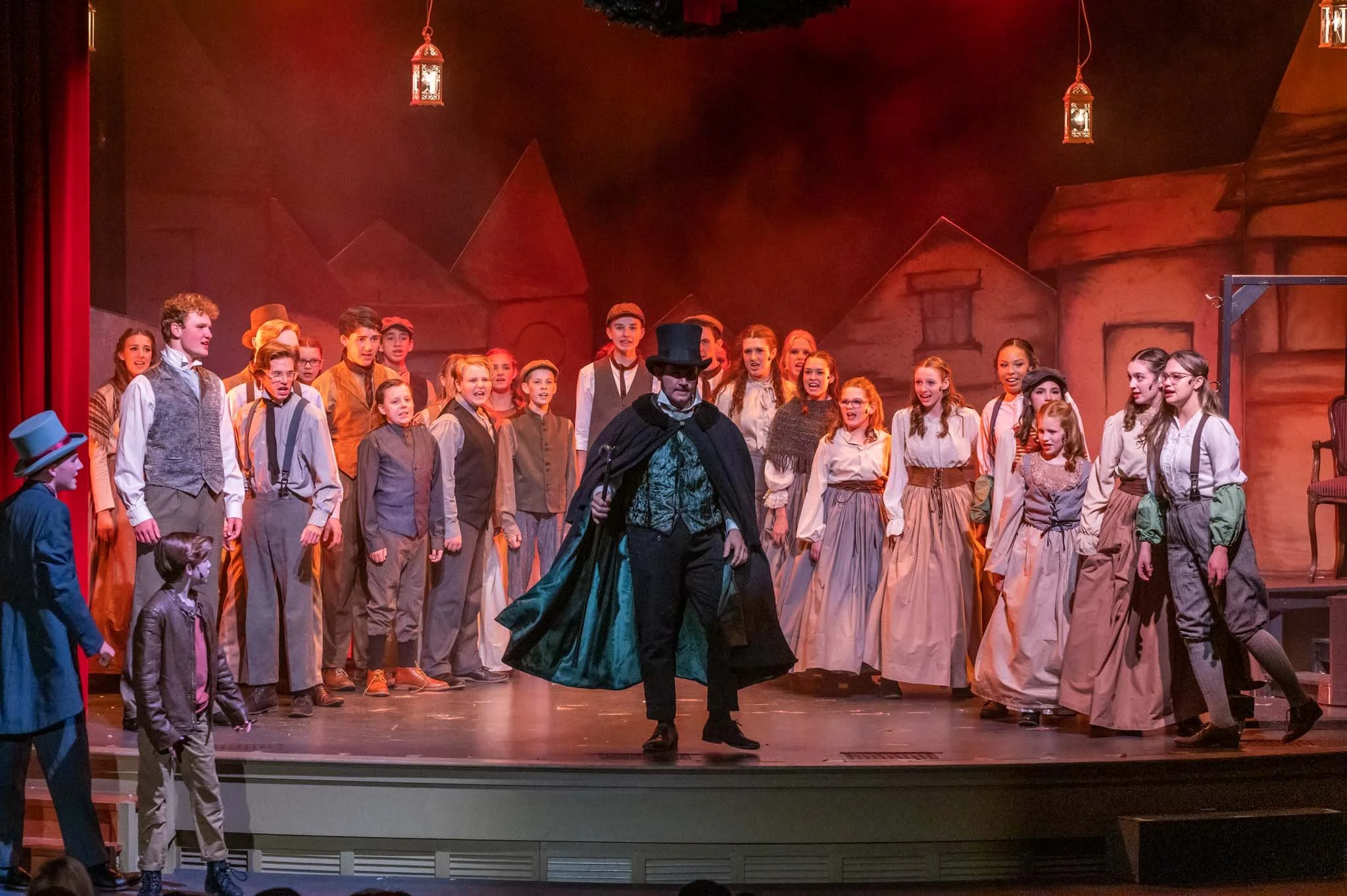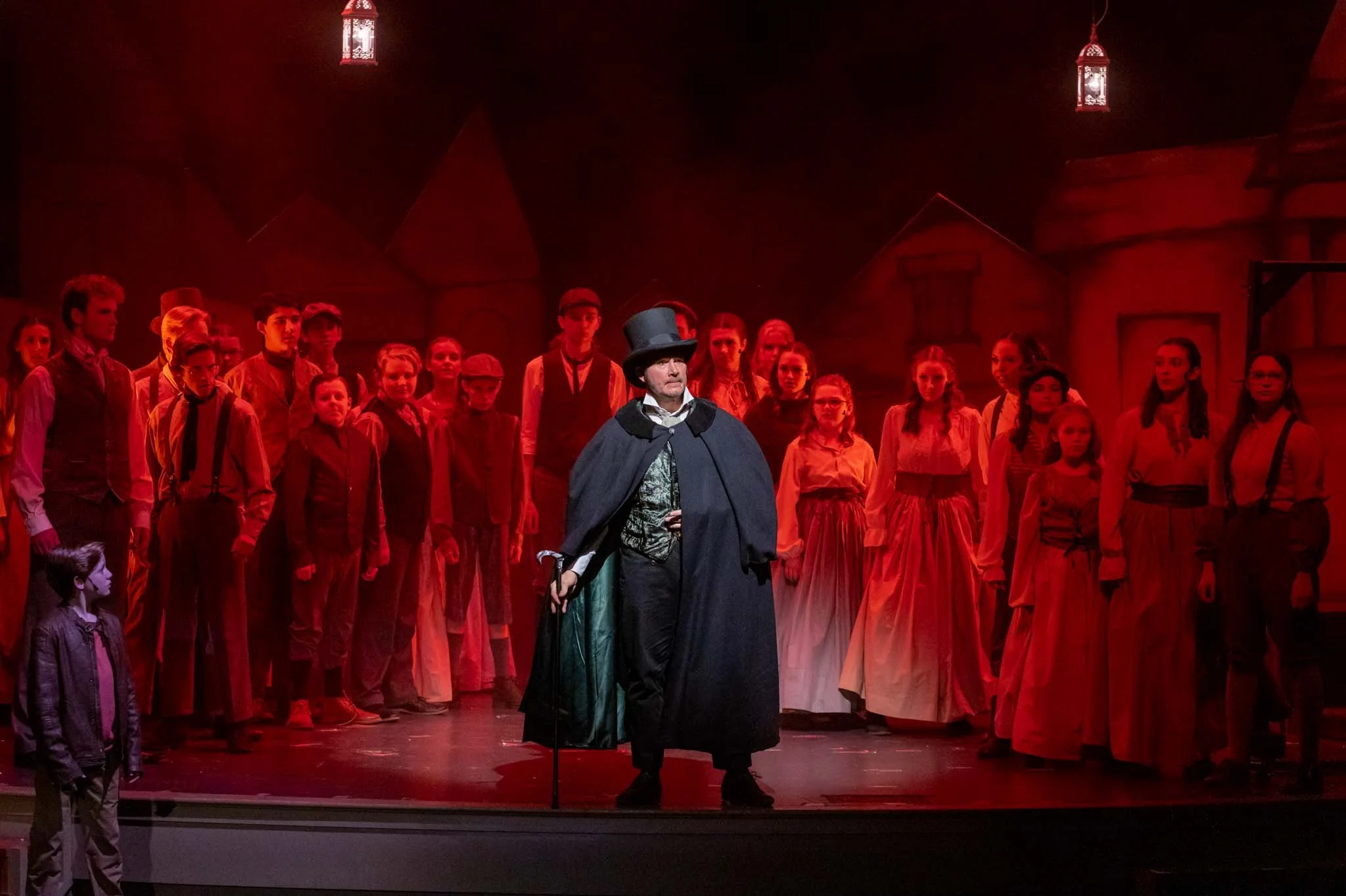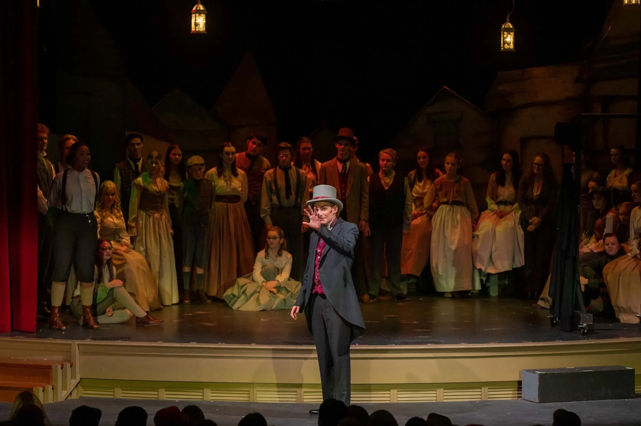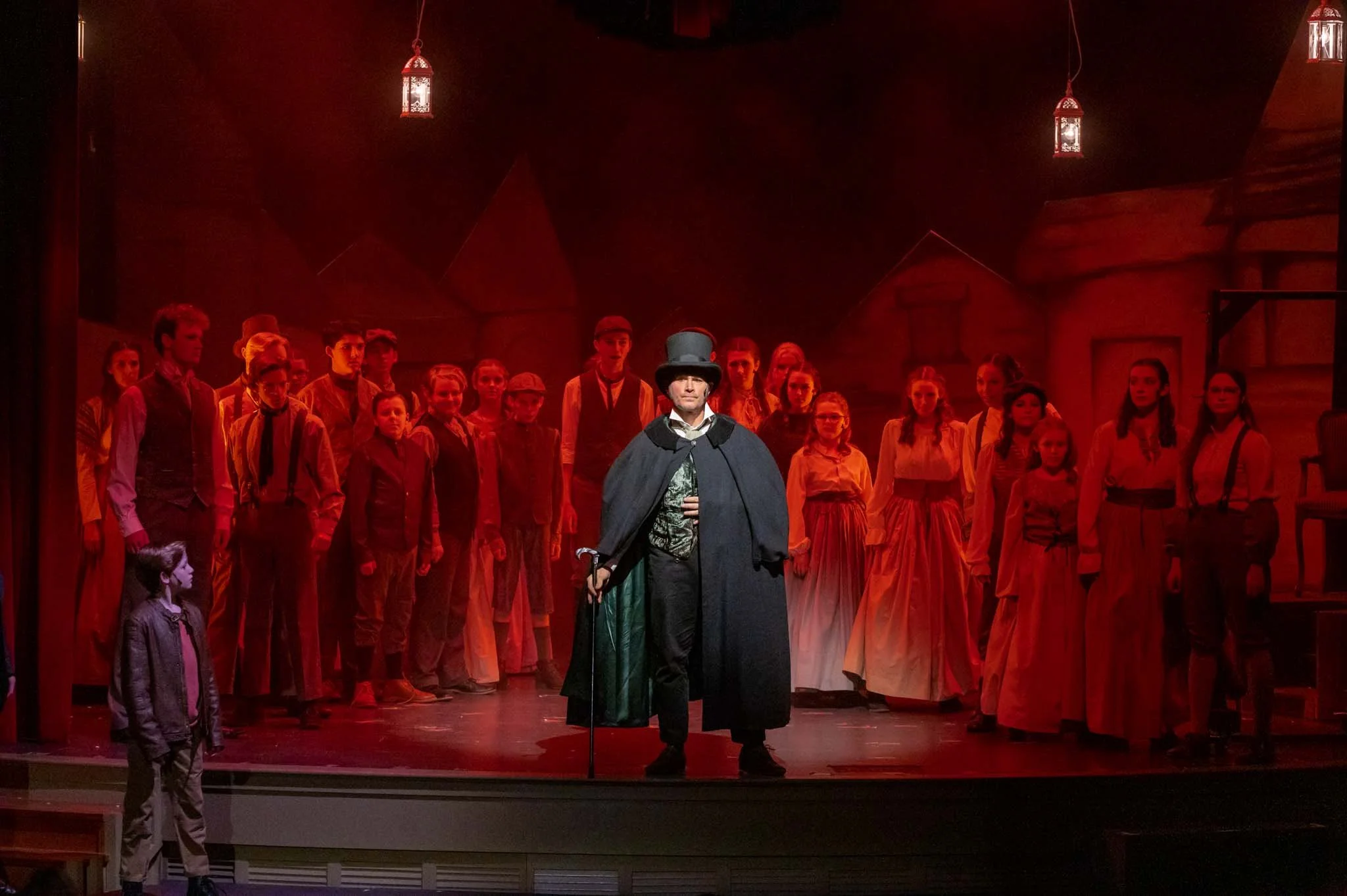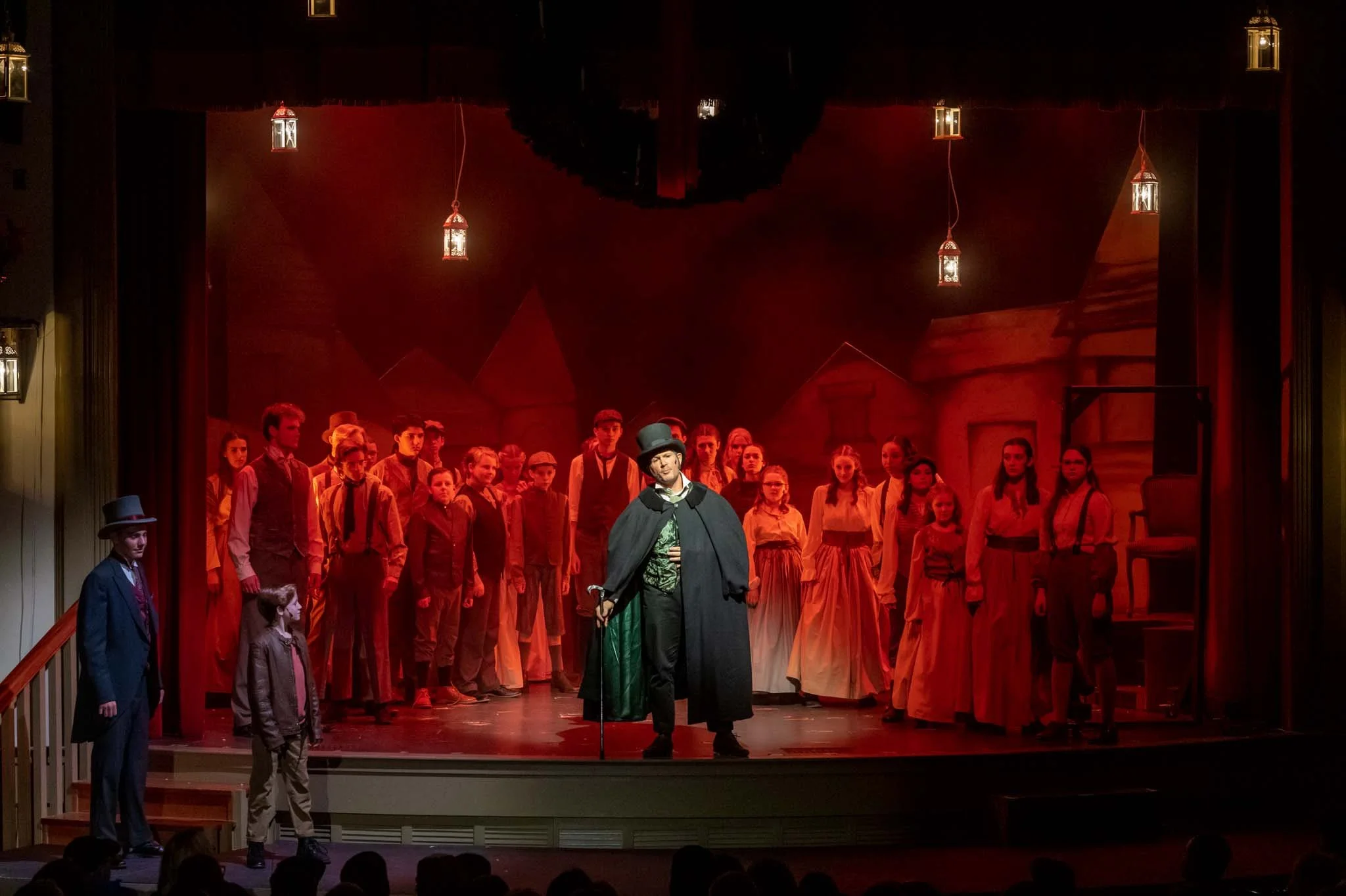 Scene from a theatrical production with a man dressed as Ebenezer Scrooge in the foreground, wearing a top hat, a dark cape, and holding a cane. Behind him, a group of performers, mostly young people, dressed in period costumes, stand on stage in a d