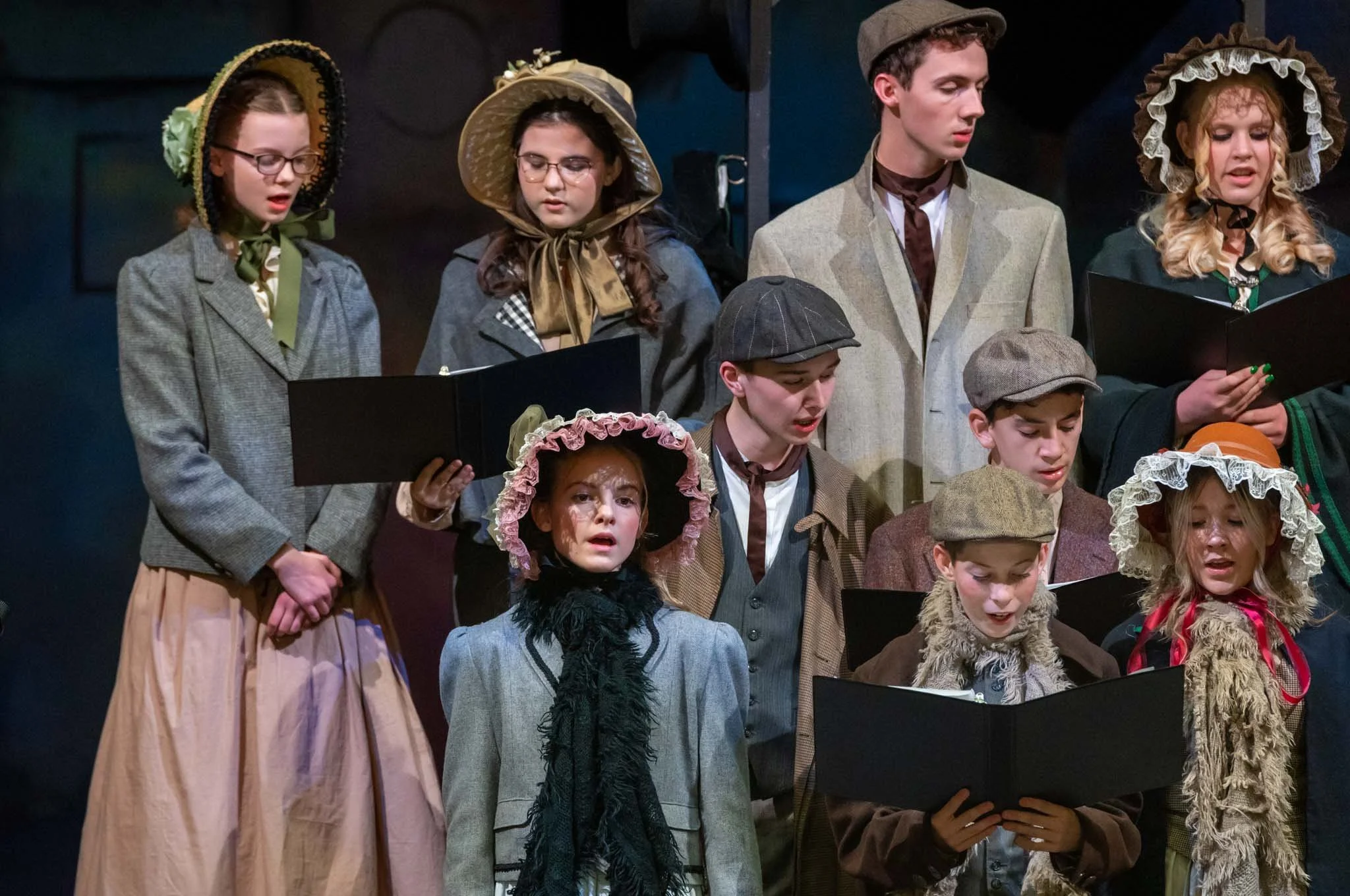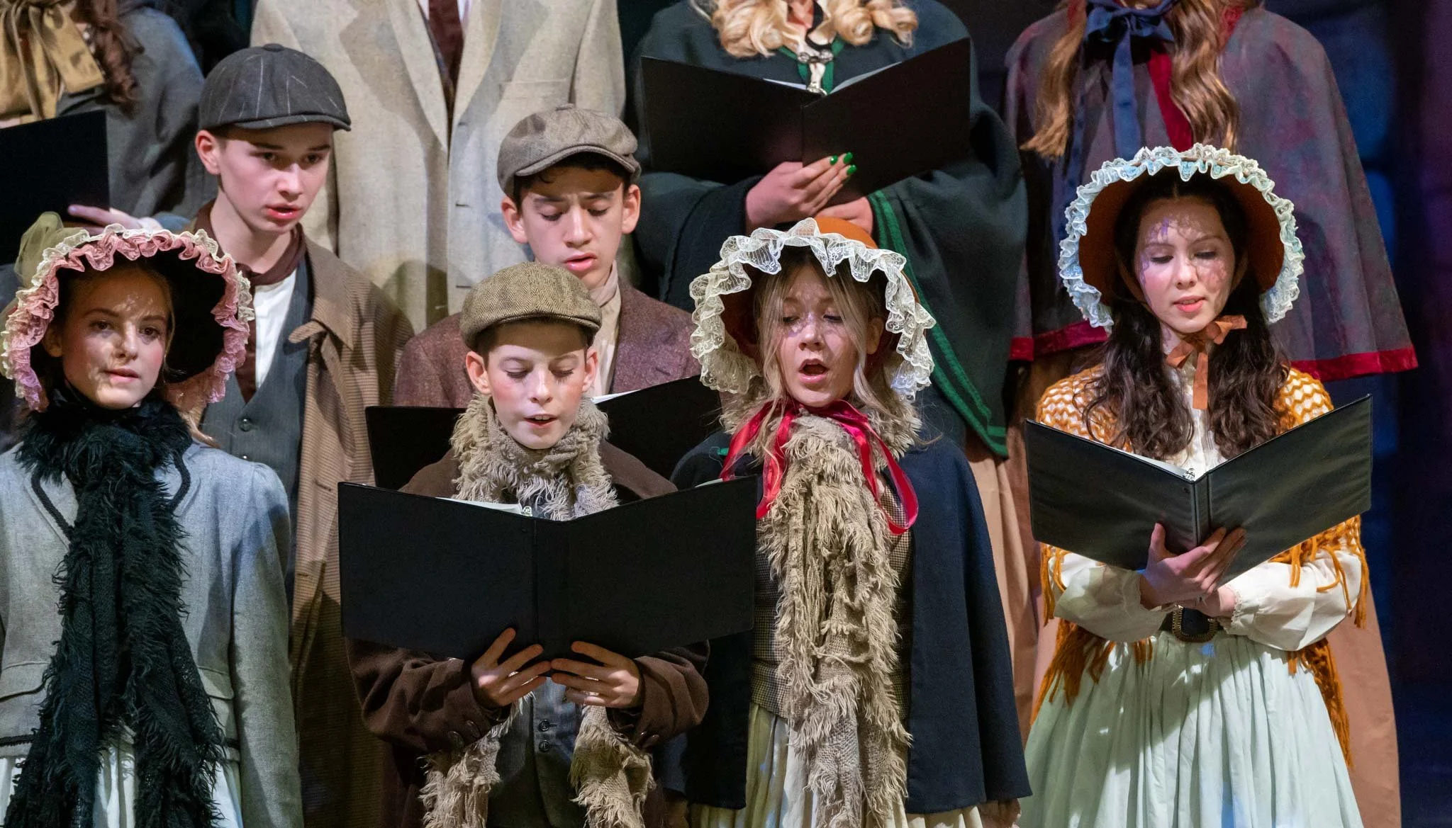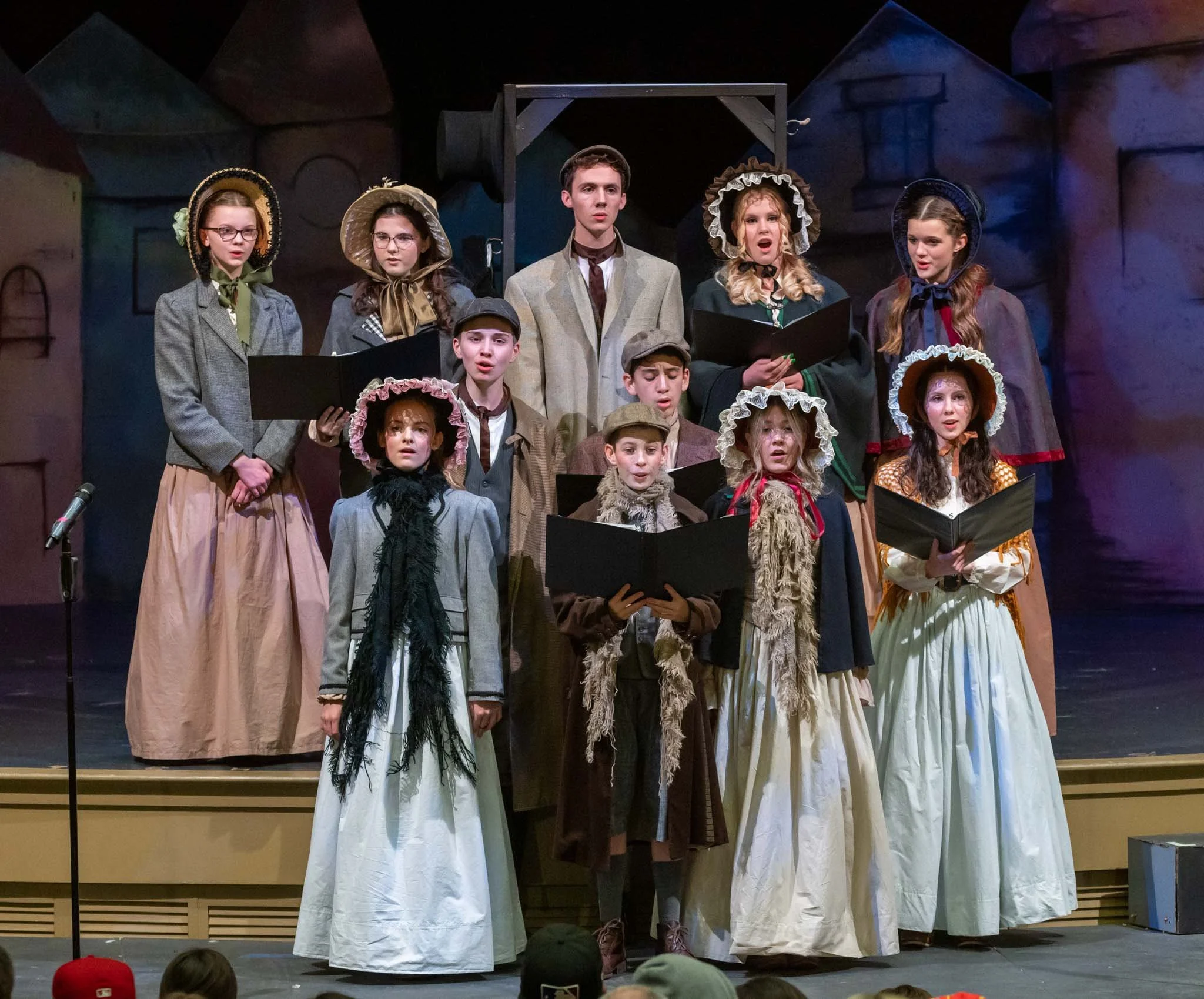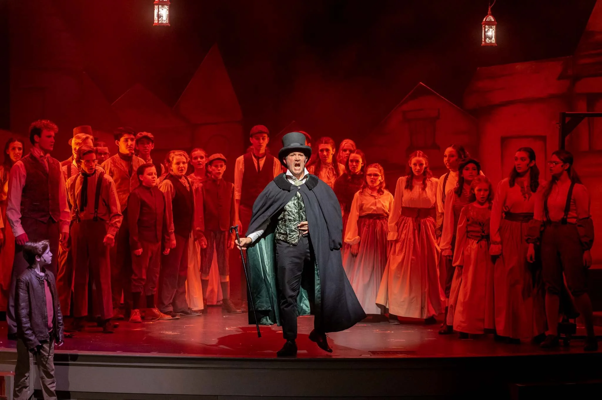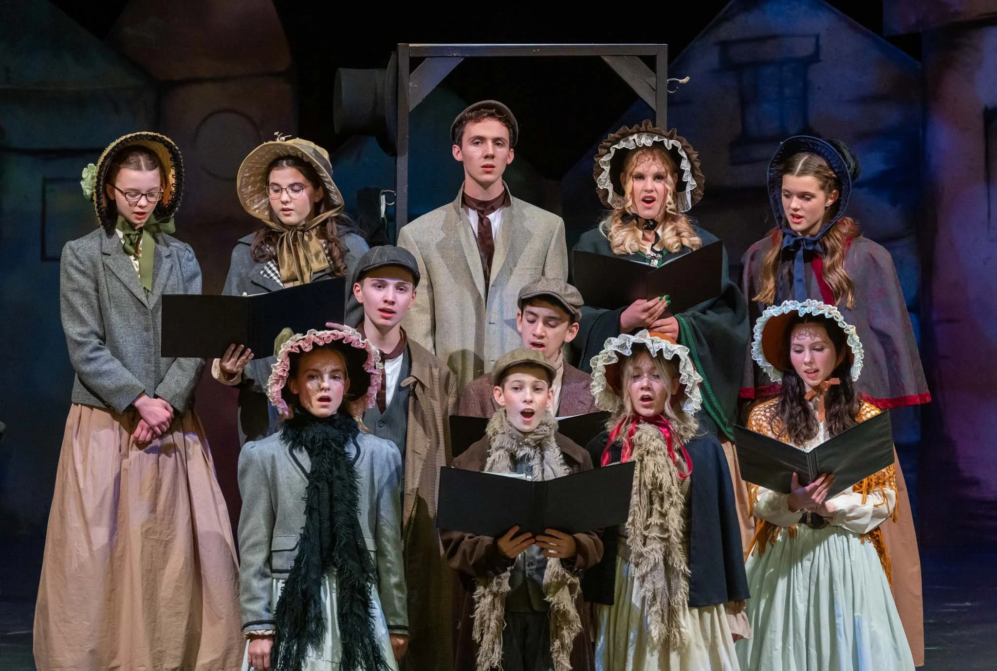 Scene from a theatrical production with a man dressed as Ebenezer Scrooge in the foreground, wearing a top hat, a dark cape, and holding a cane. Behind him, a group of performers, mostly young people, dressed in period costumes, stand on stage in a d