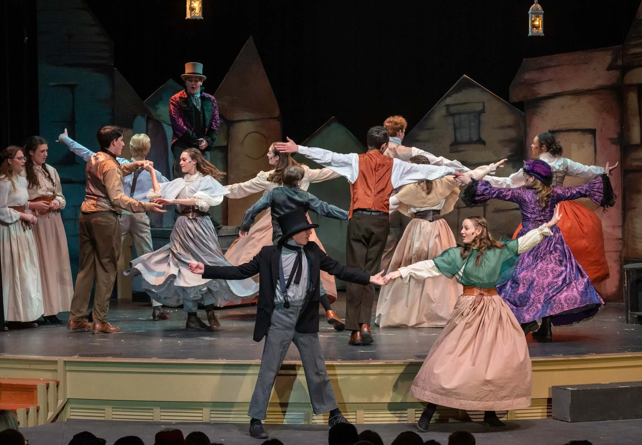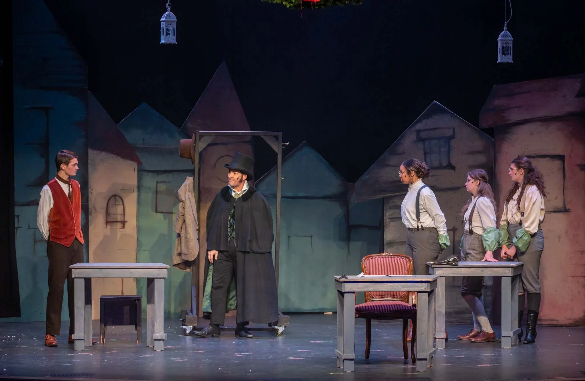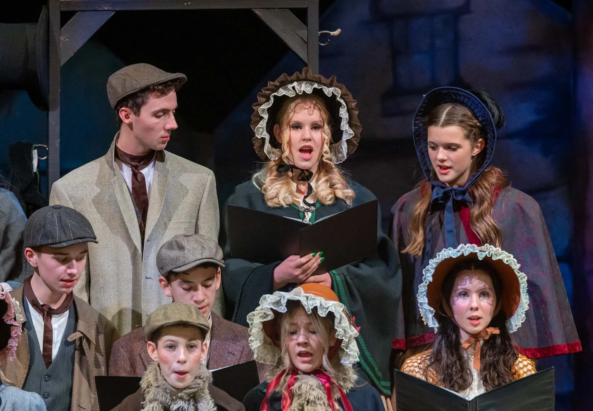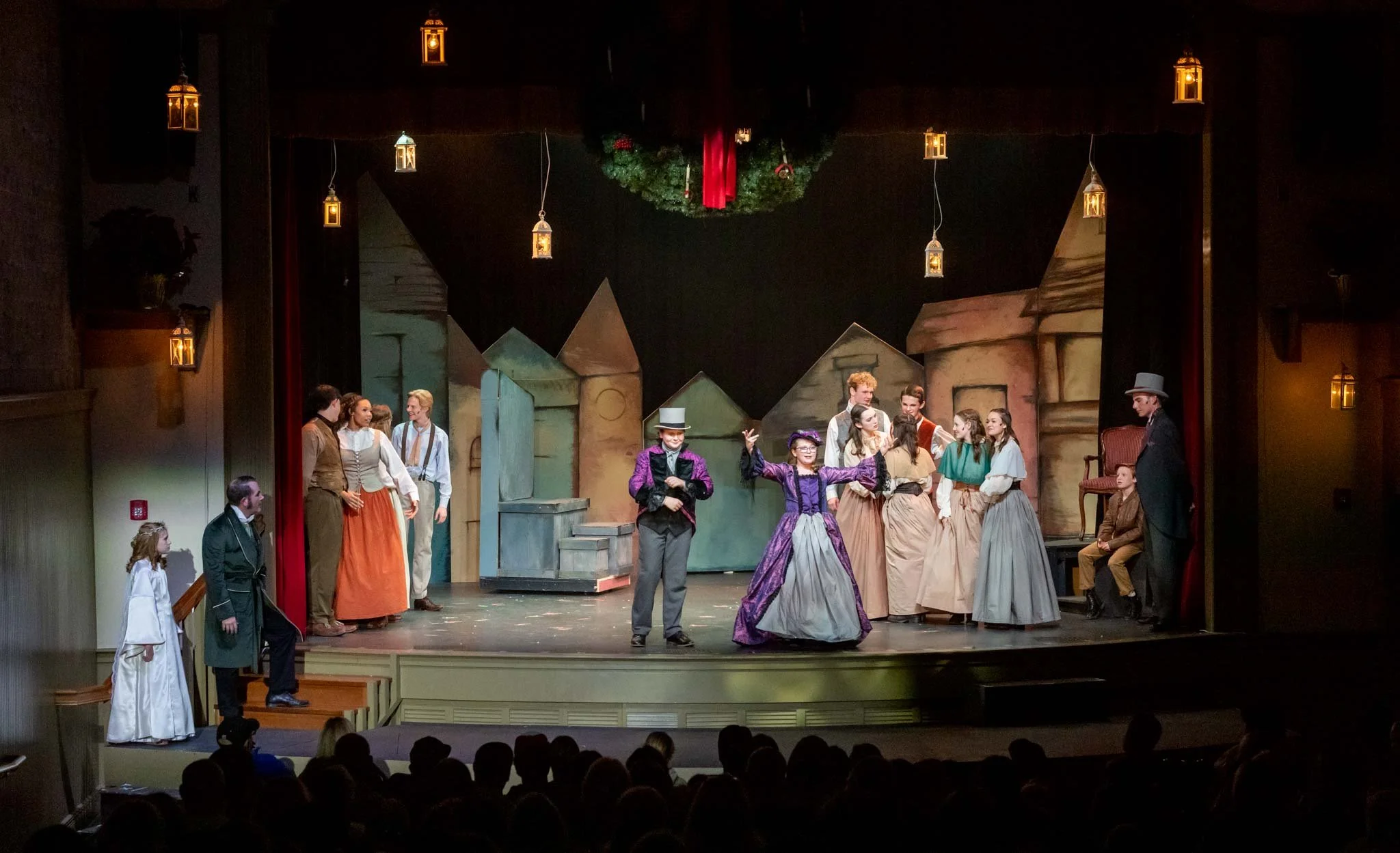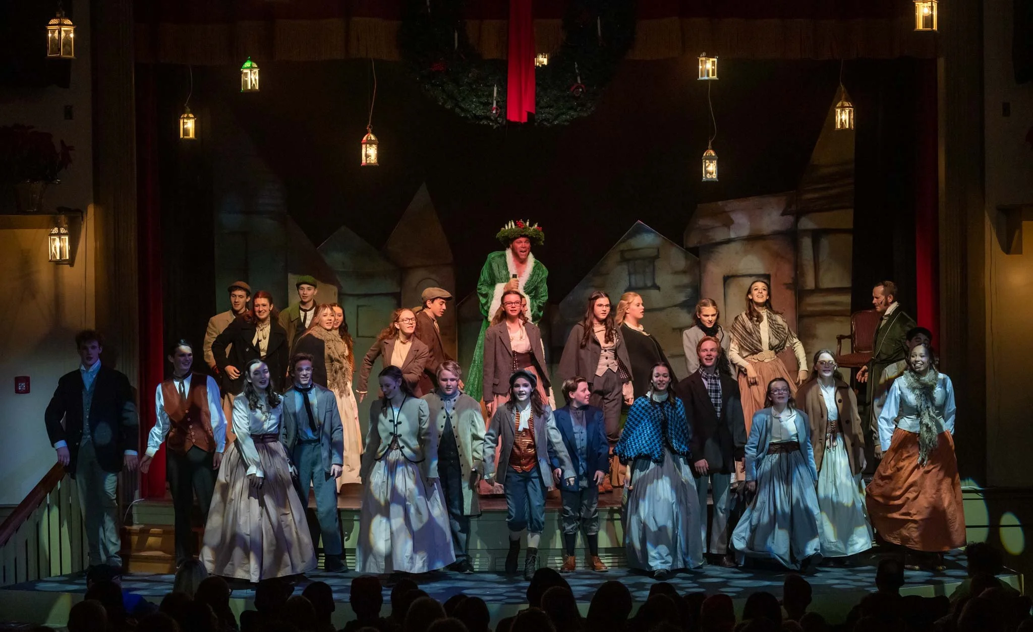 Scene from a theatrical production with a man dressed as Ebenezer Scrooge in the foreground, wearing a top hat, a dark cape, and holding a cane. Behind him, a group of performers, mostly young people, dressed in period costumes, stand on stage in a d