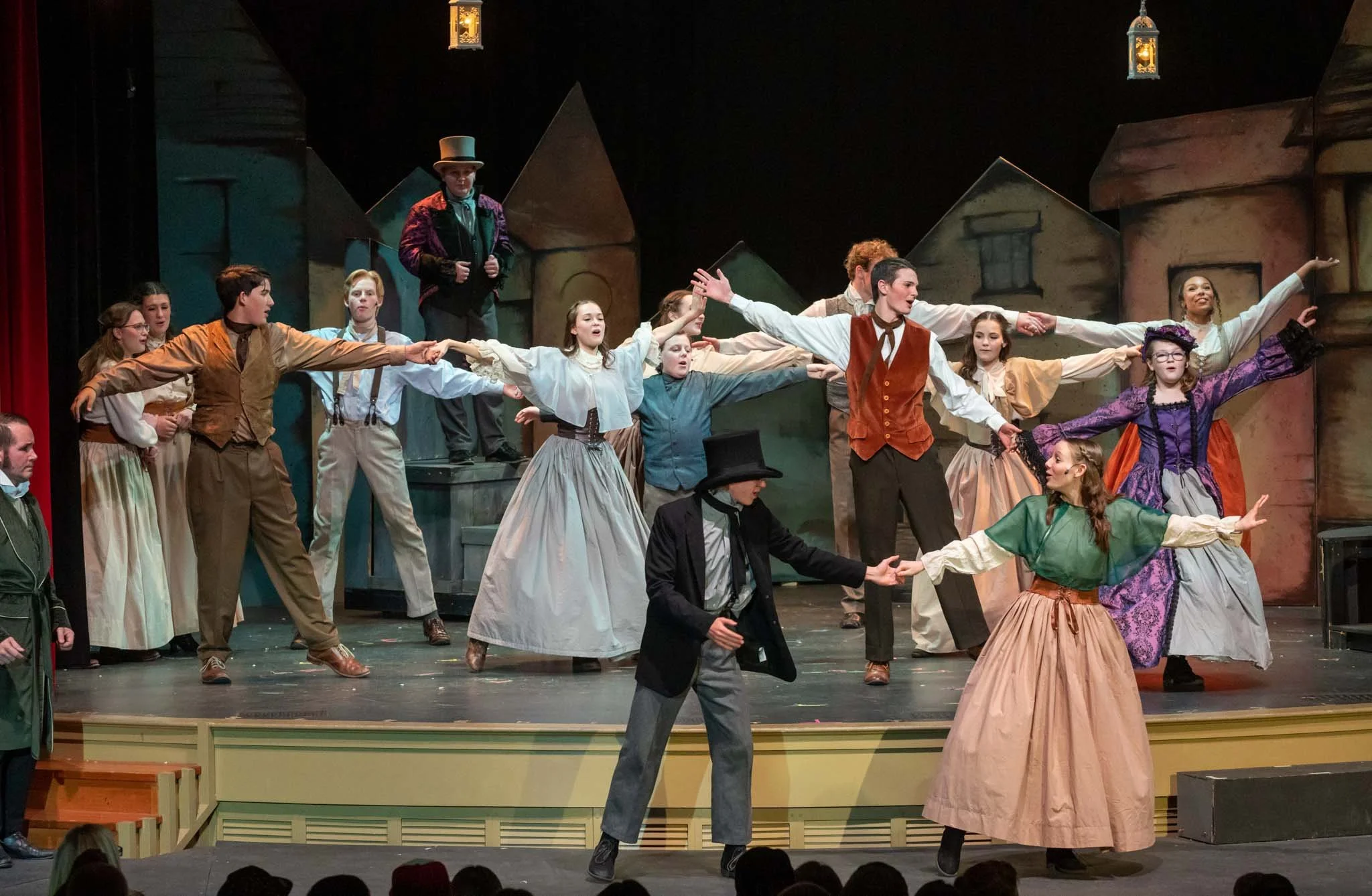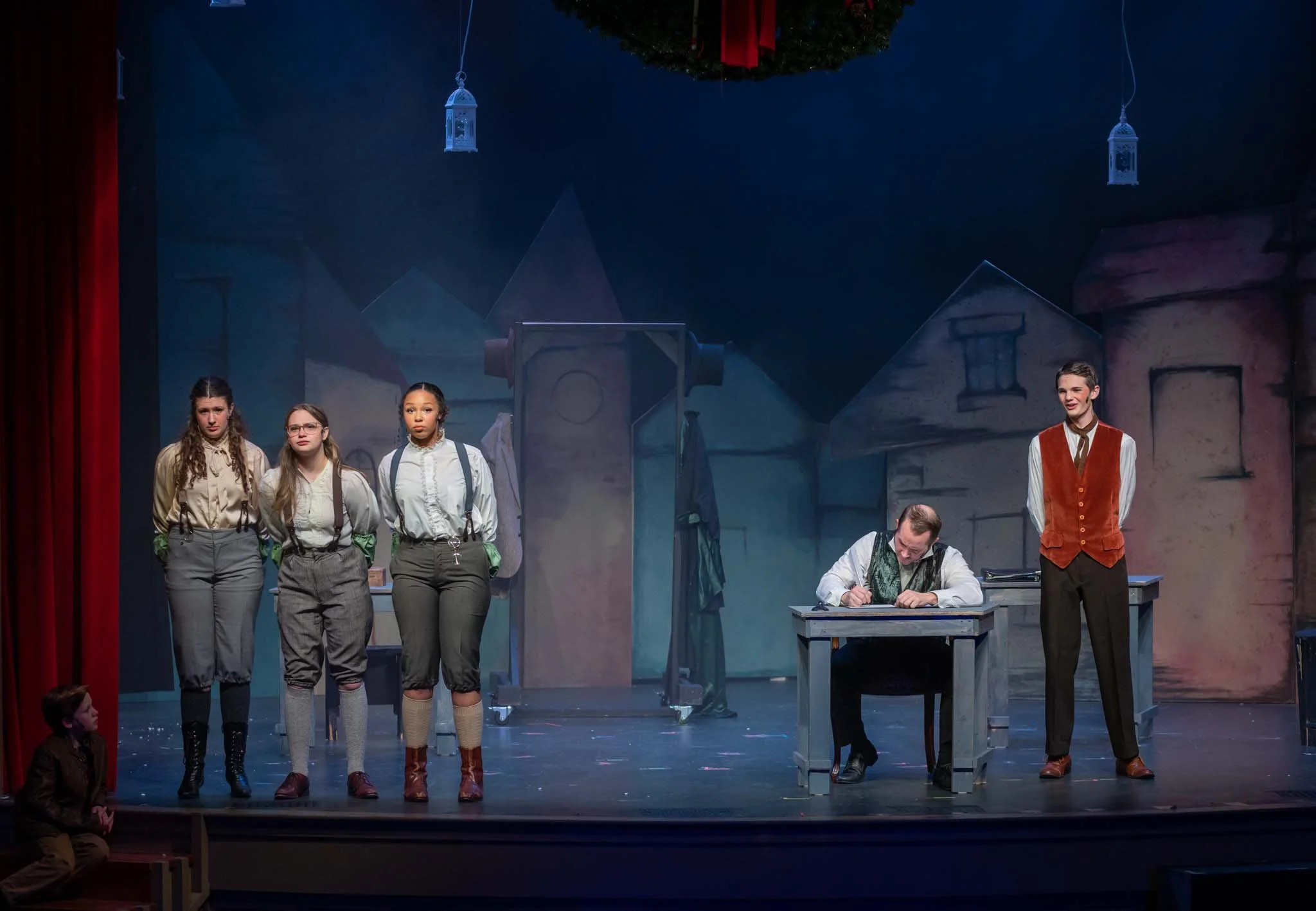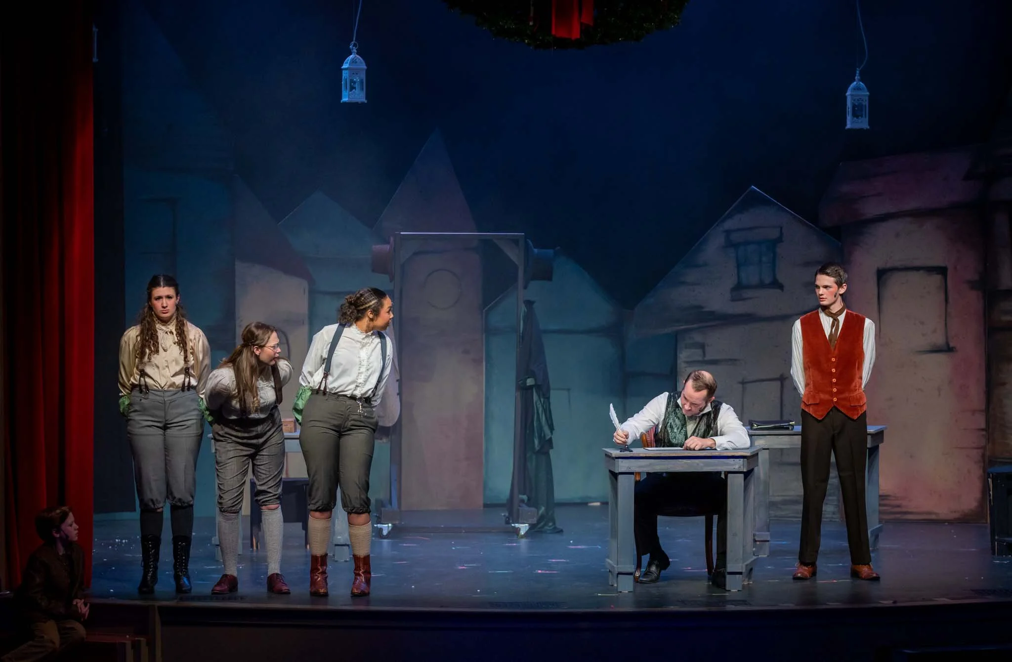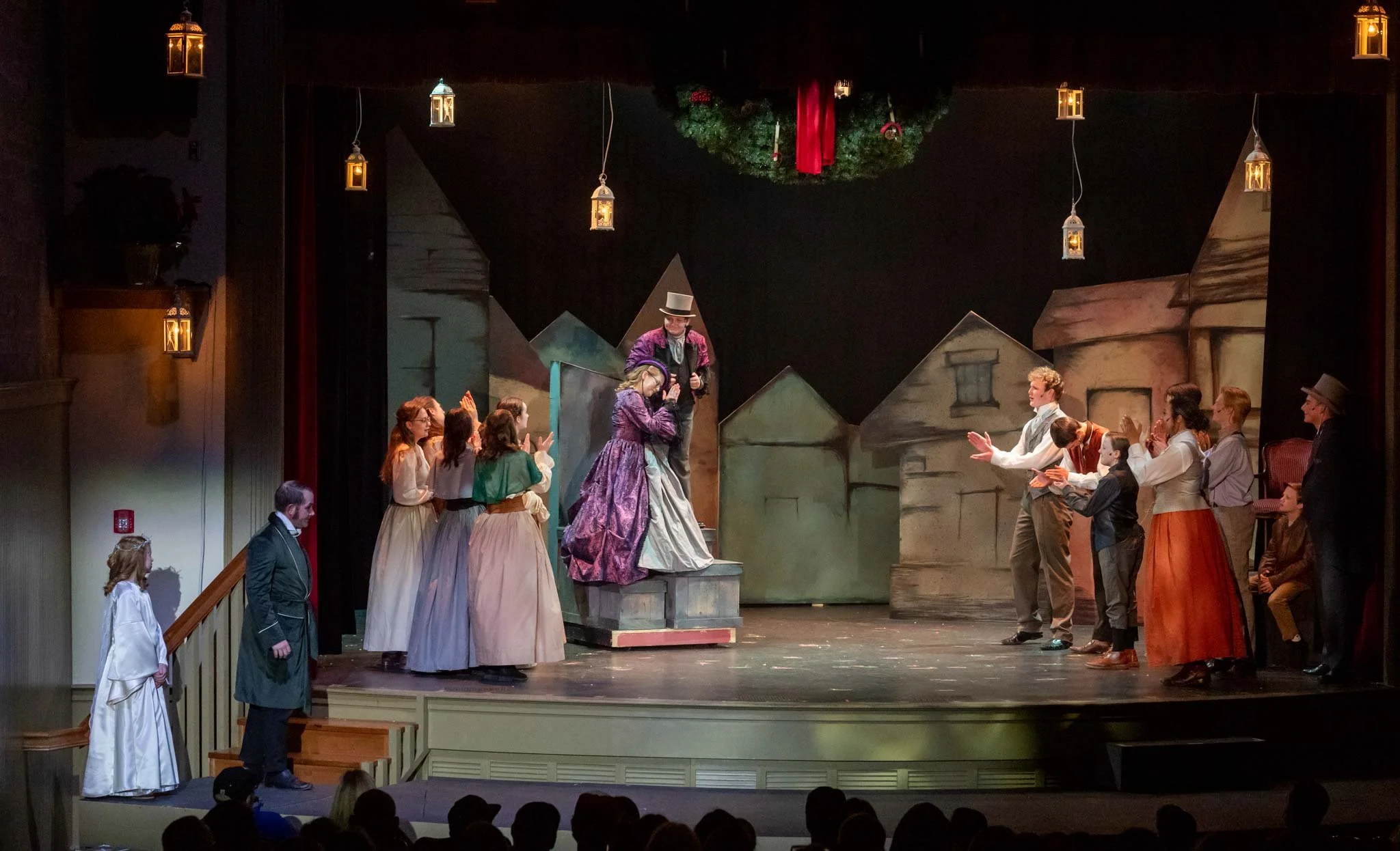 Scene from a theatrical production with a man dressed as Ebenezer Scrooge in the foreground, wearing a top hat, a dark cape, and holding a cane. Behind him, a group of performers, mostly young people, dressed in period costumes, stand on stage in a d