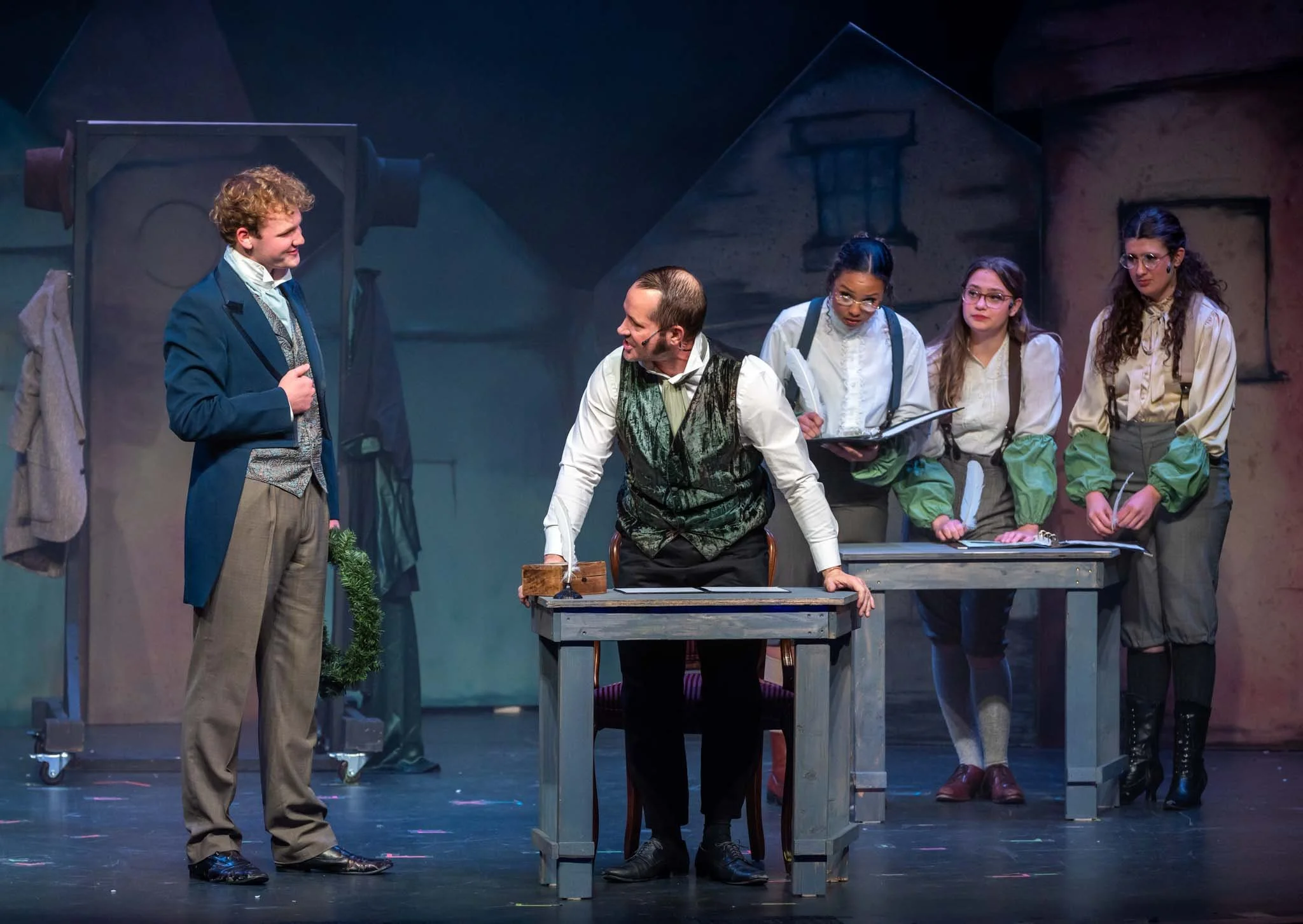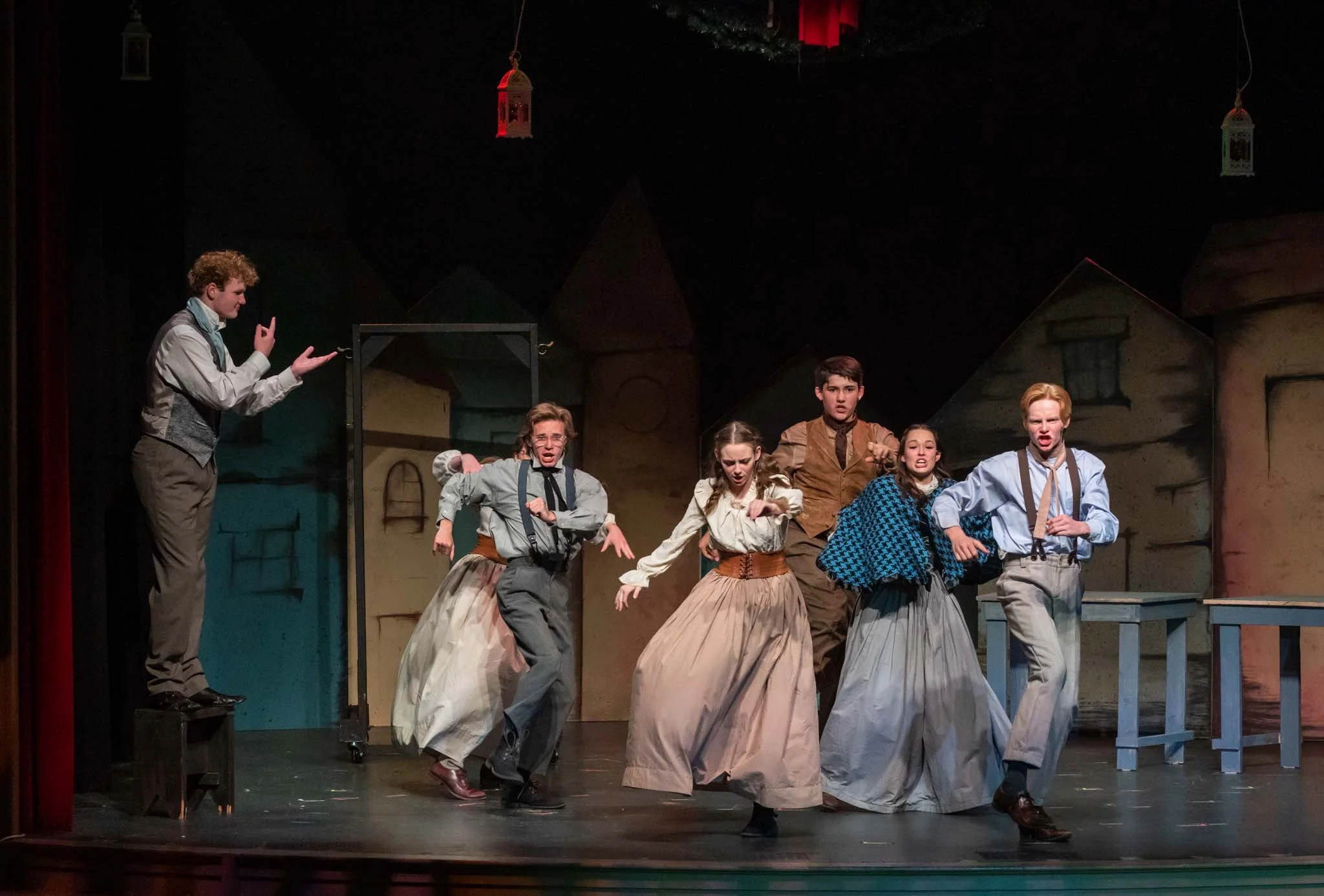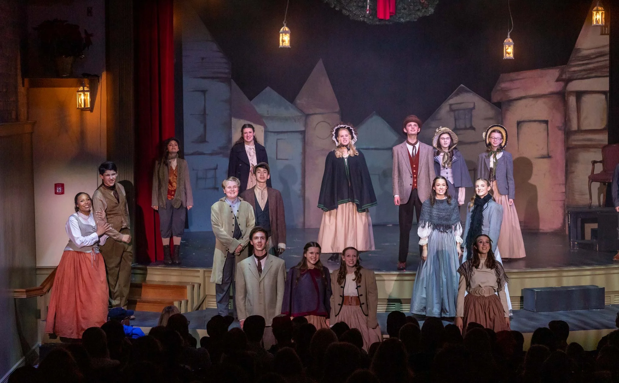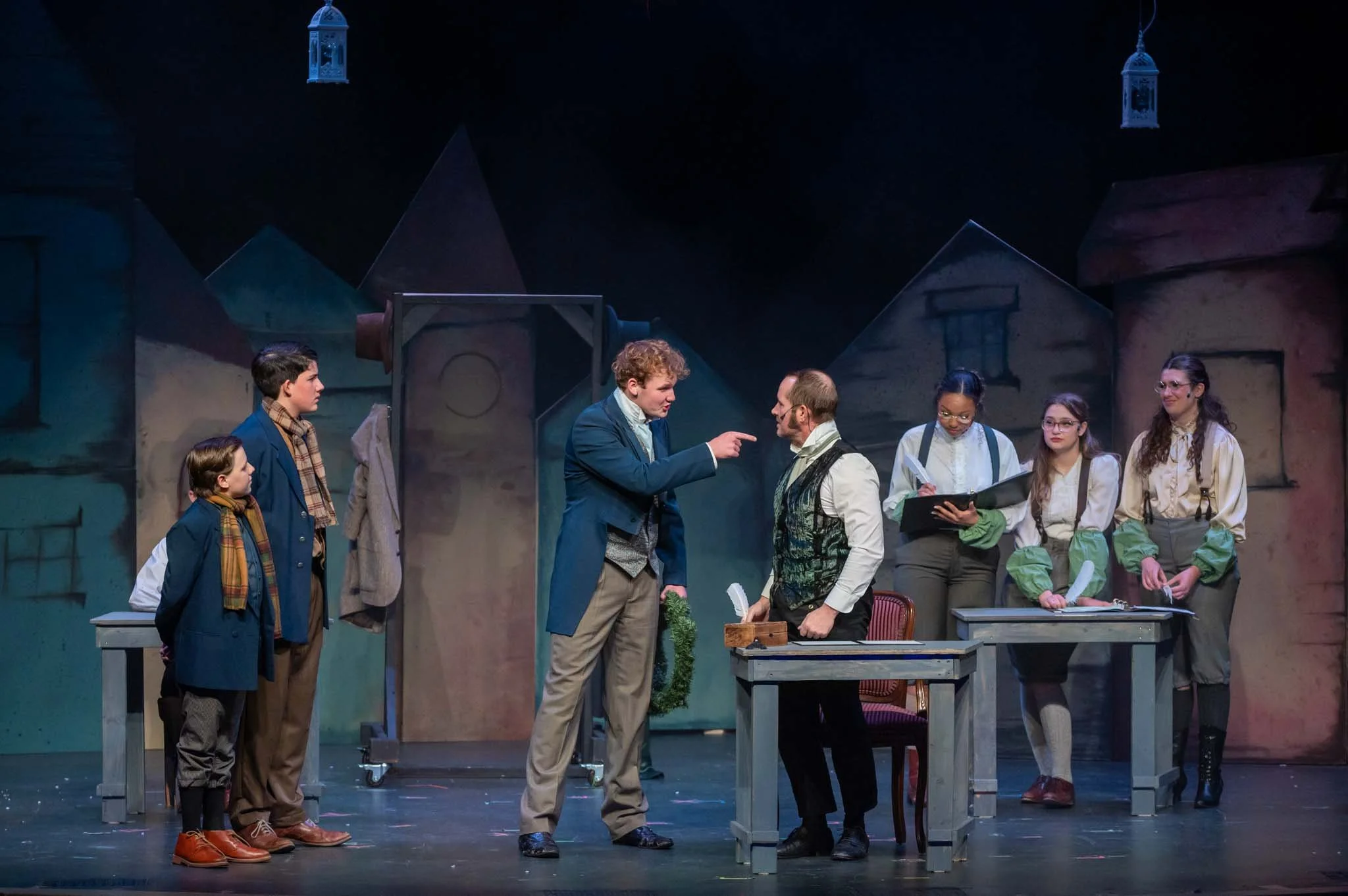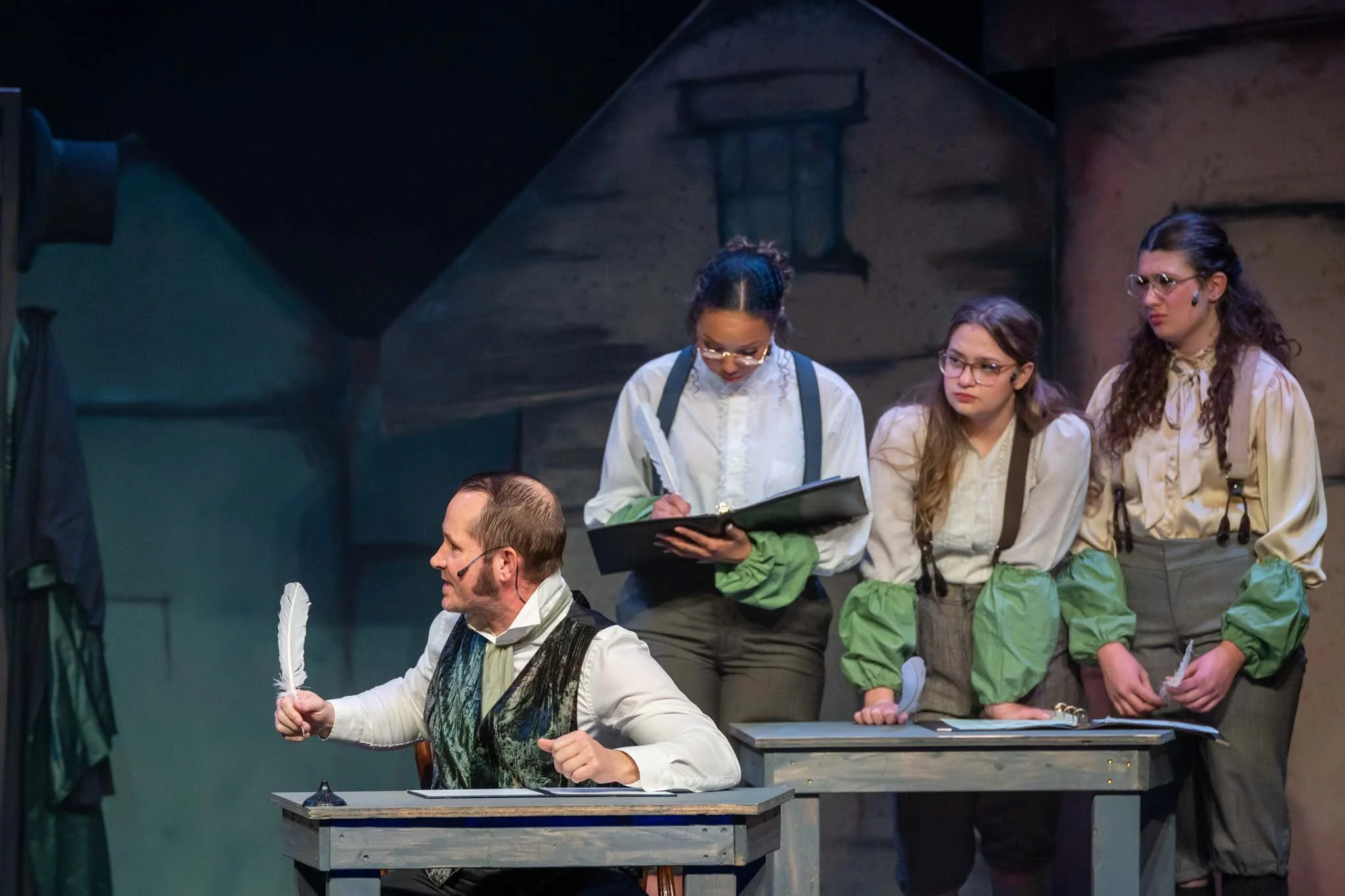 Scene from a theatrical production with a man dressed as Ebenezer Scrooge in the foreground, wearing a top hat, a dark cape, and holding a cane. Behind him, a group of performers, mostly young people, dressed in period costumes, stand on stage in a d