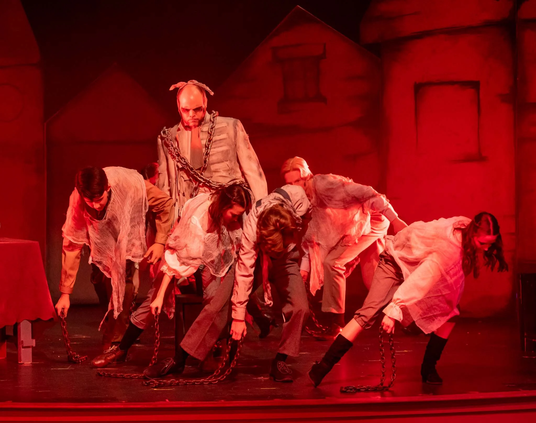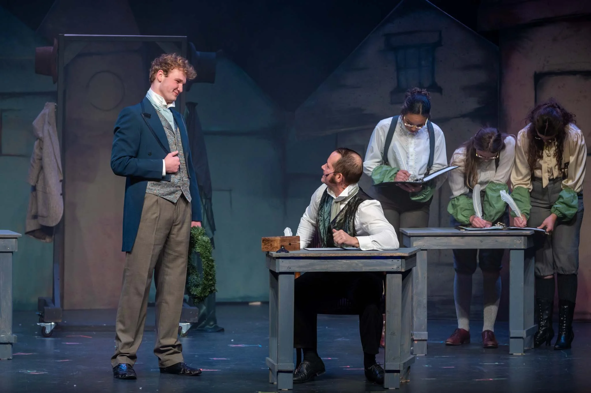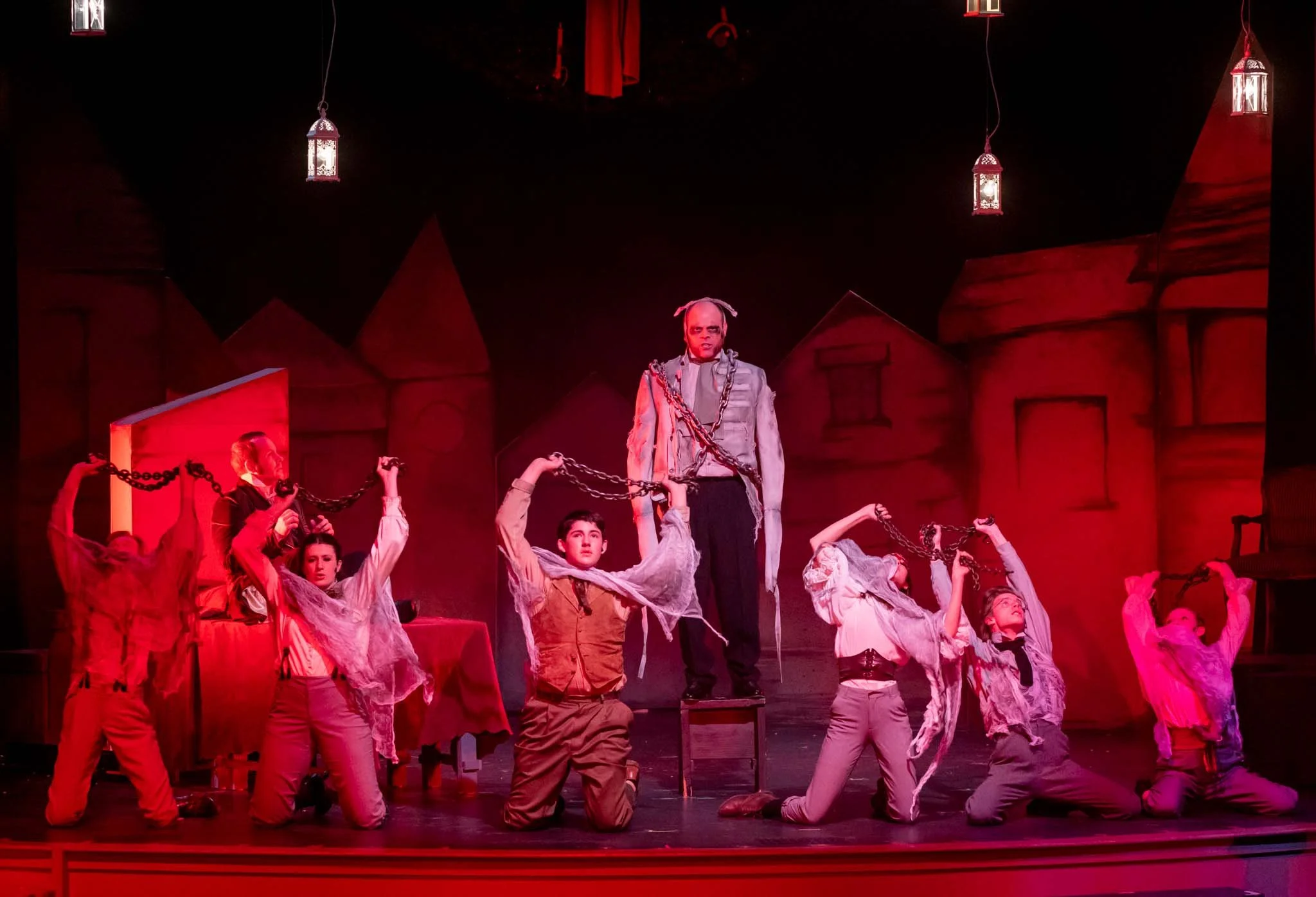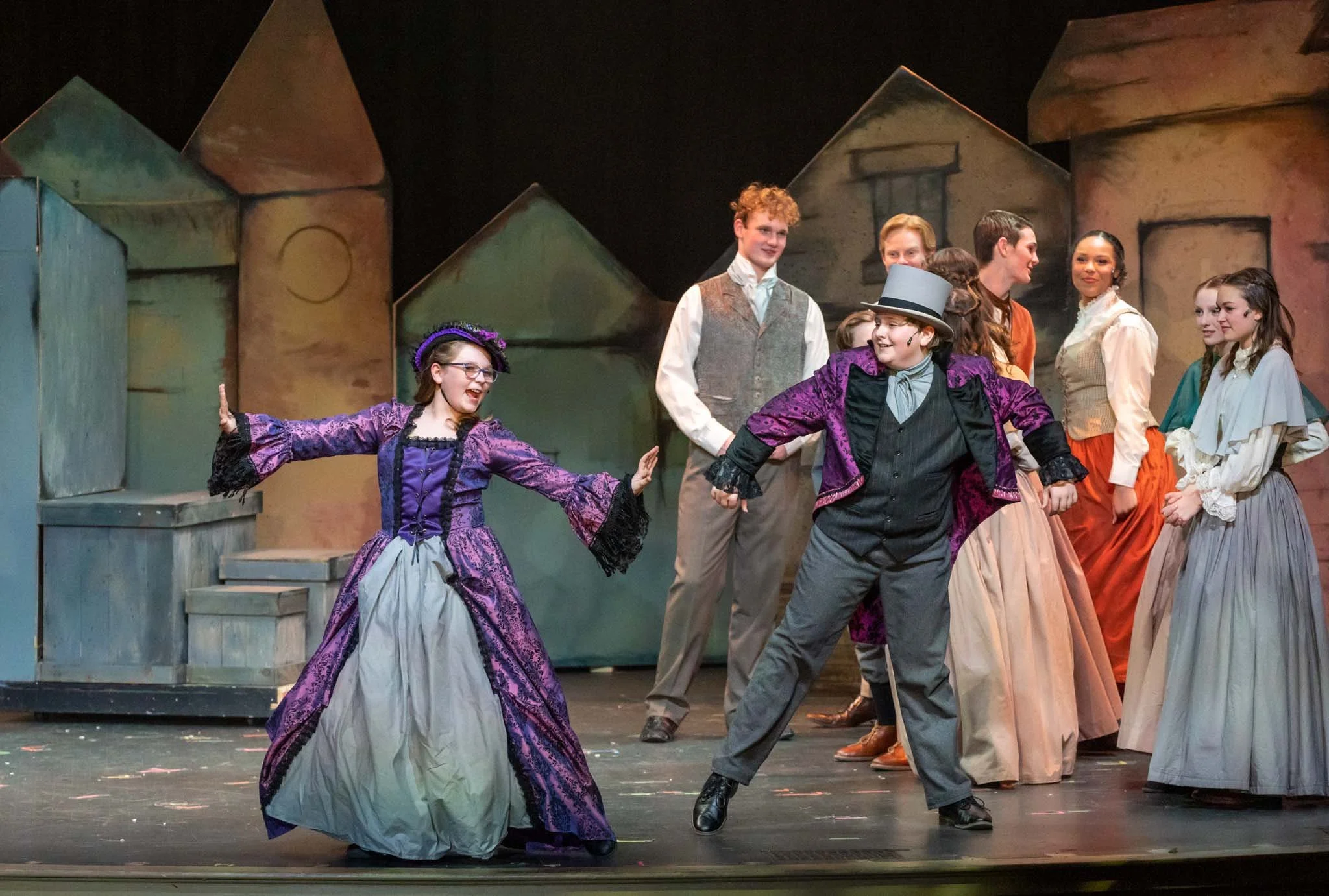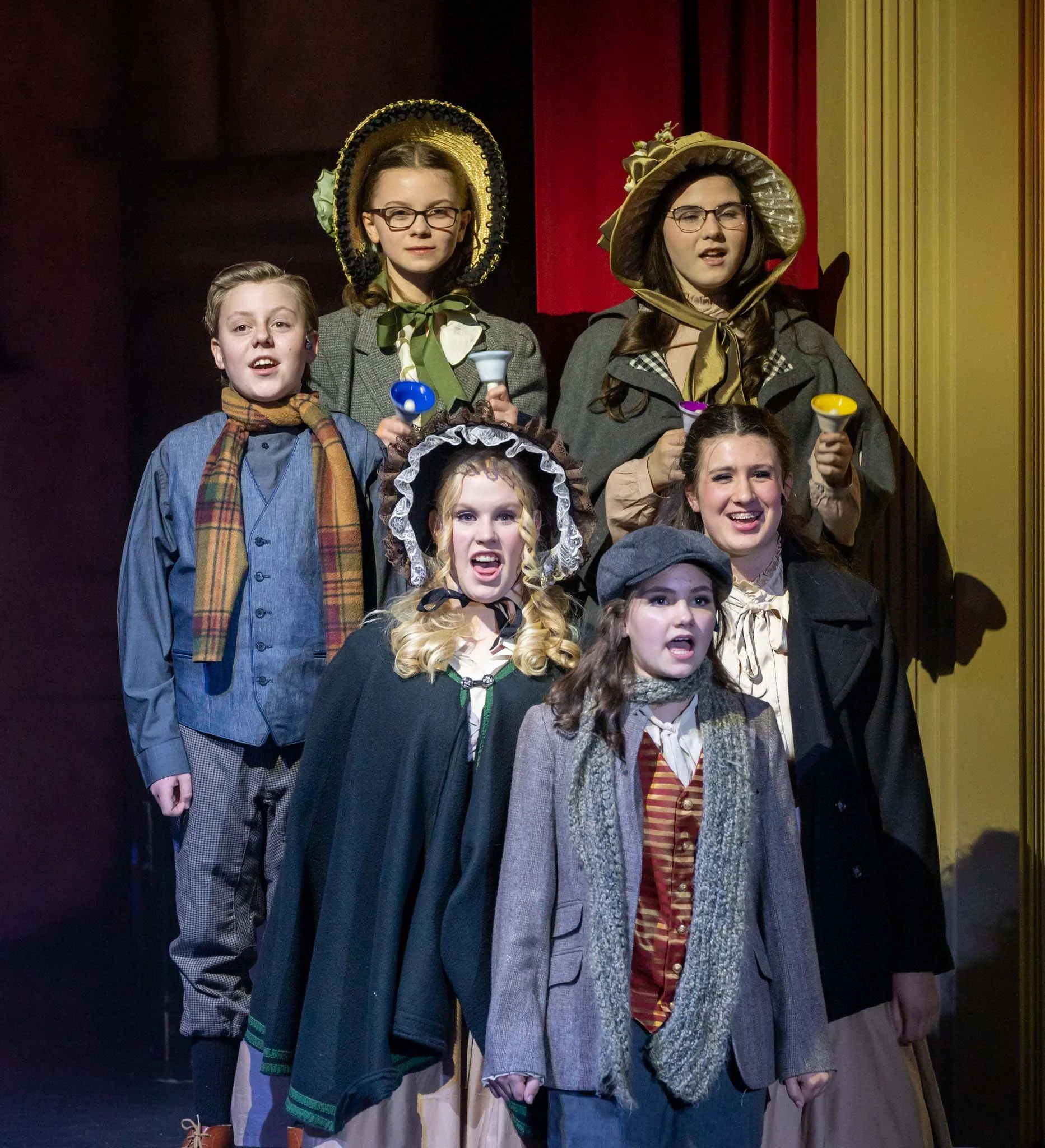 Scene from a theatrical production with a man dressed as Ebenezer Scrooge in the foreground, wearing a top hat, a dark cape, and holding a cane. Behind him, a group of performers, mostly young people, dressed in period costumes, stand on stage in a d