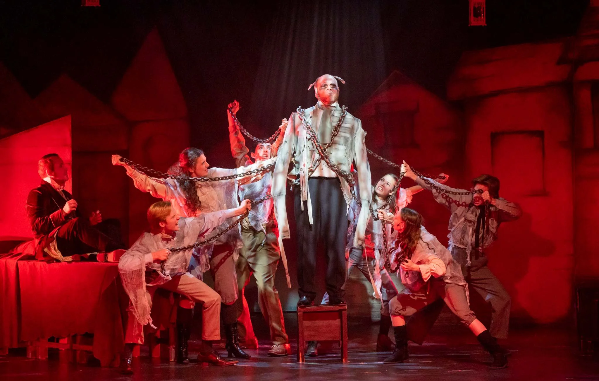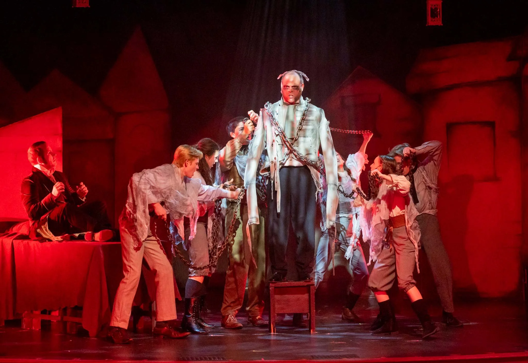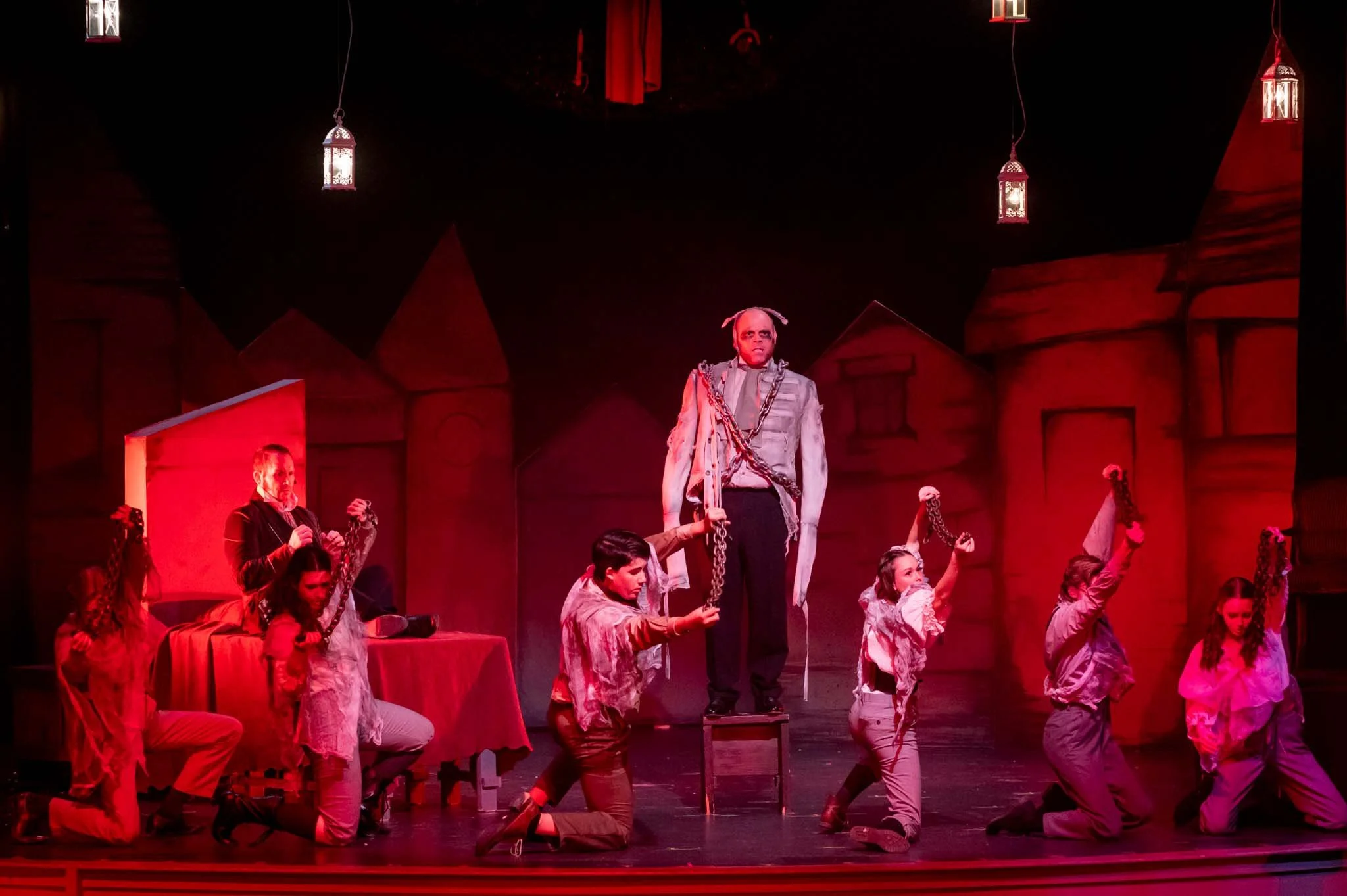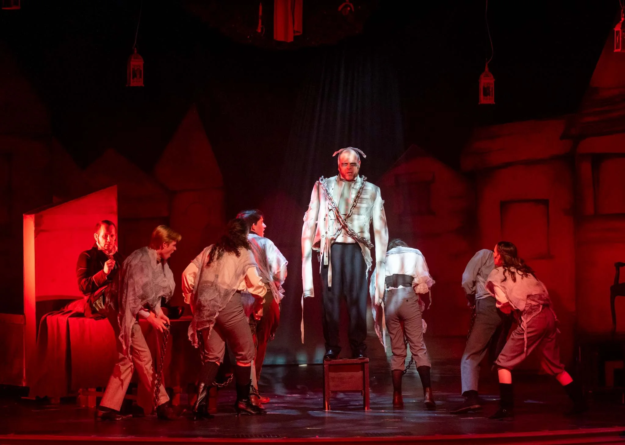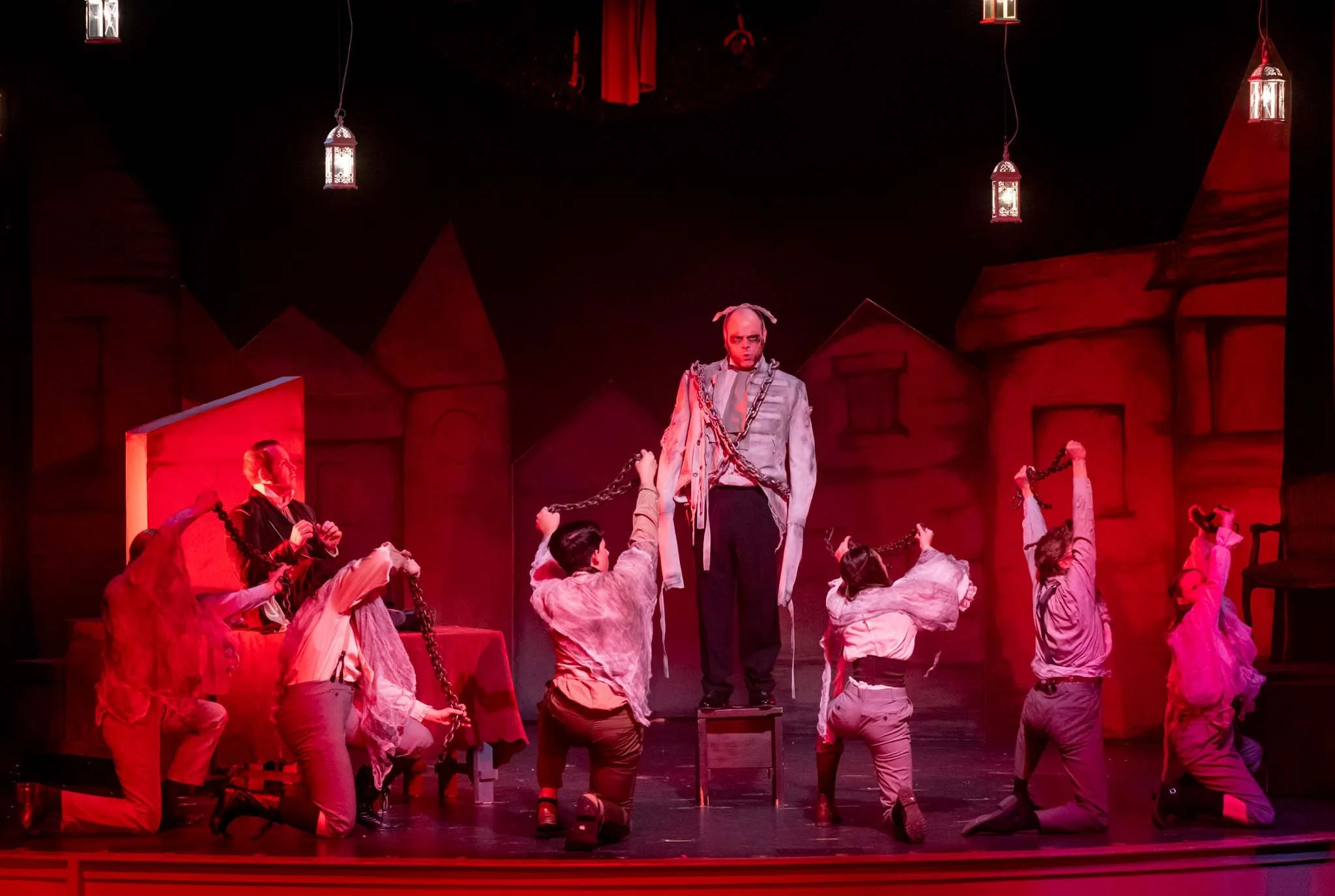 Scene from a theatrical production with a man dressed as Ebenezer Scrooge in the foreground, wearing a top hat, a dark cape, and holding a cane. Behind him, a group of performers, mostly young people, dressed in period costumes, stand on stage in a d