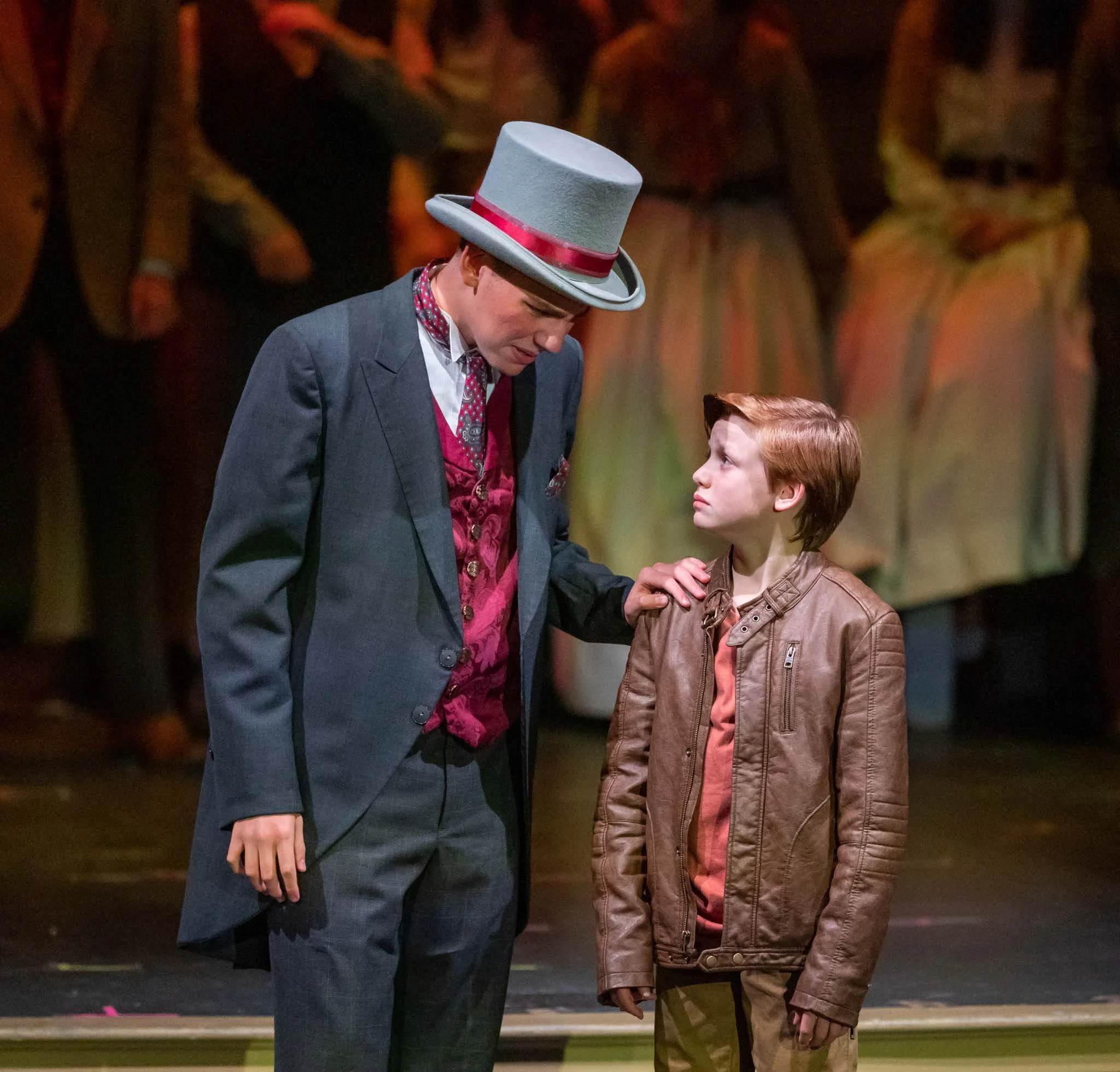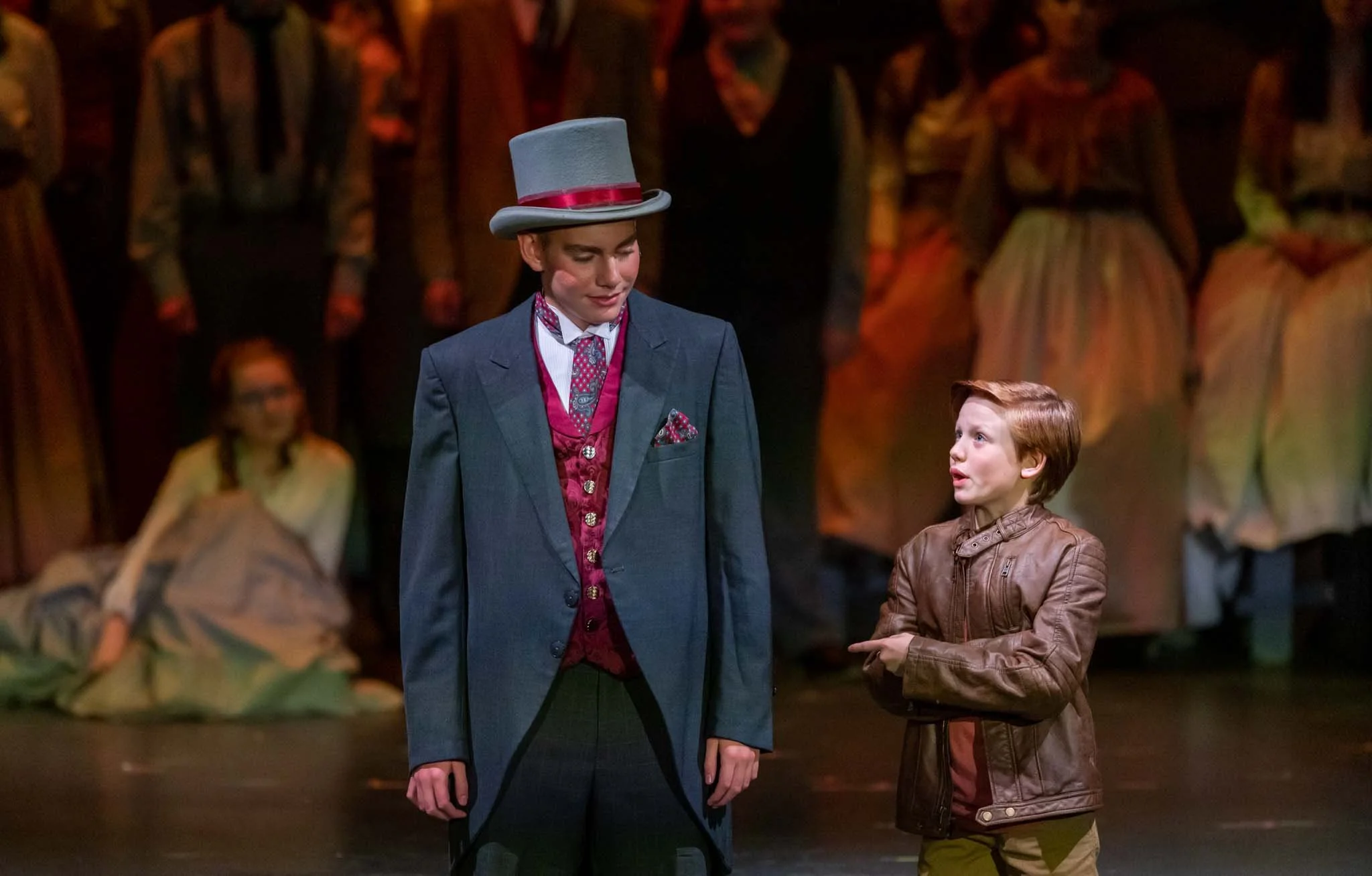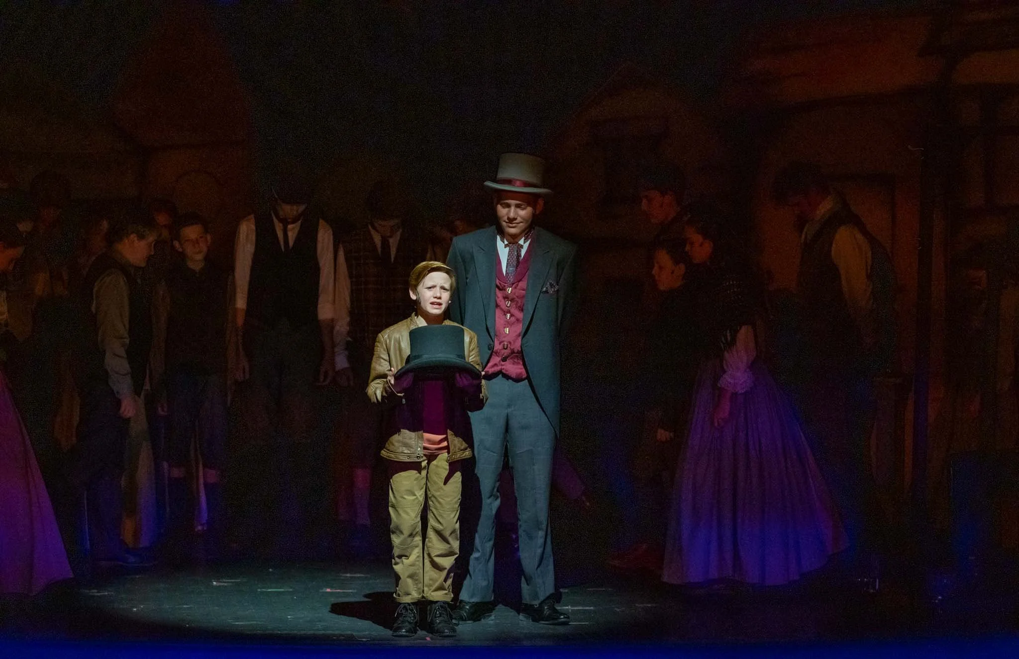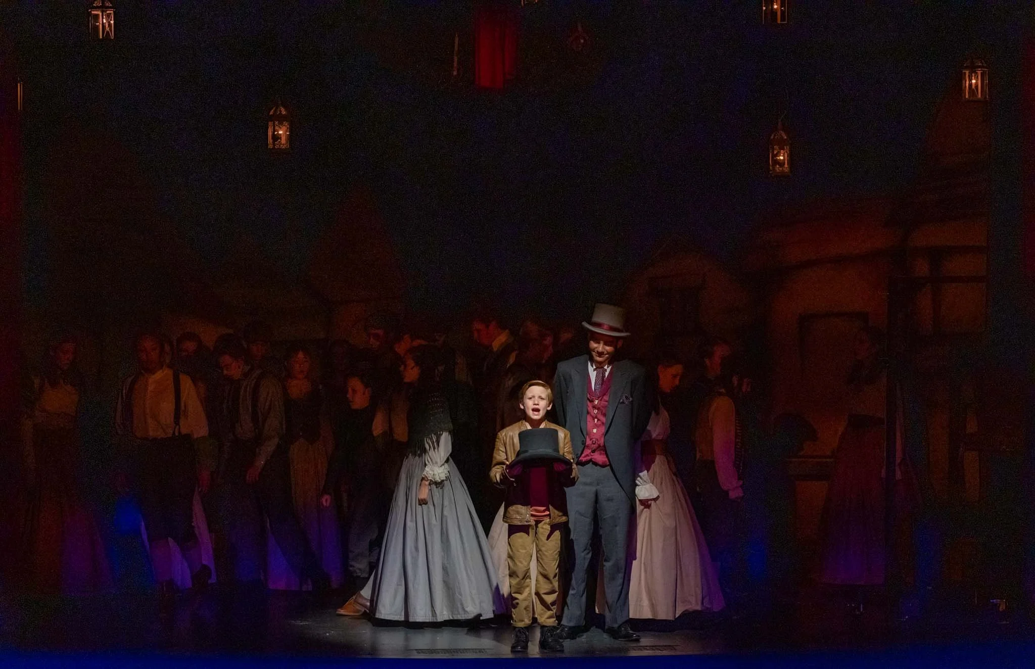 Actors perform on stage with dramatic lighting, portraying a scene with a young boy holding a hat, standing beside a taller man in a suit and top hat, surrounded by other actors in period costumes.