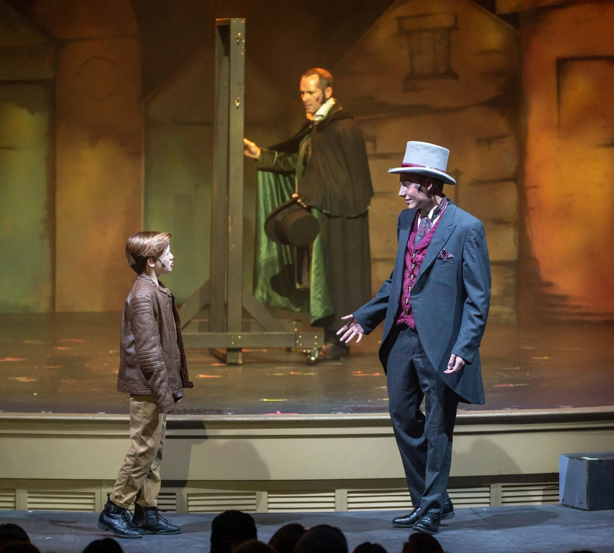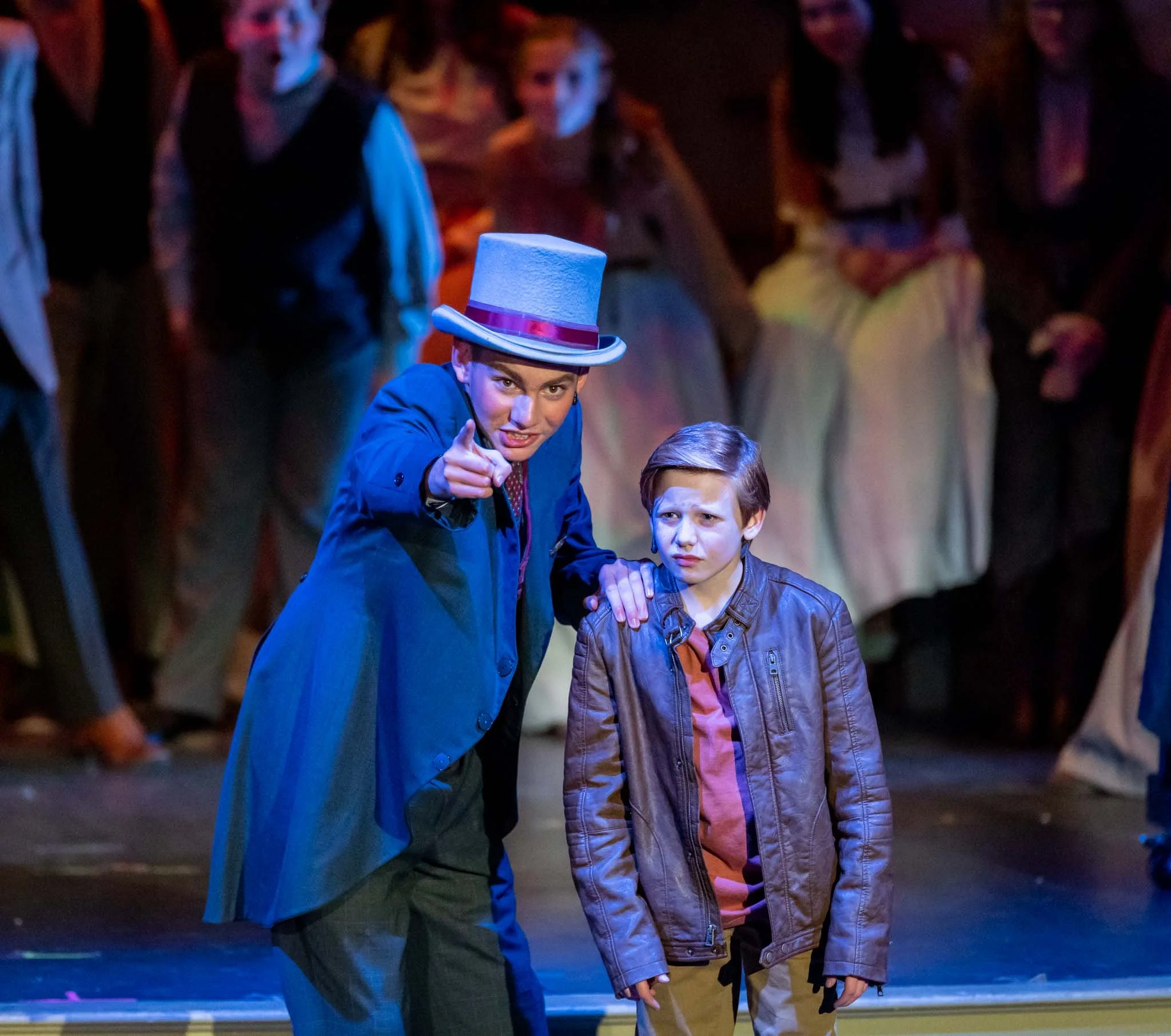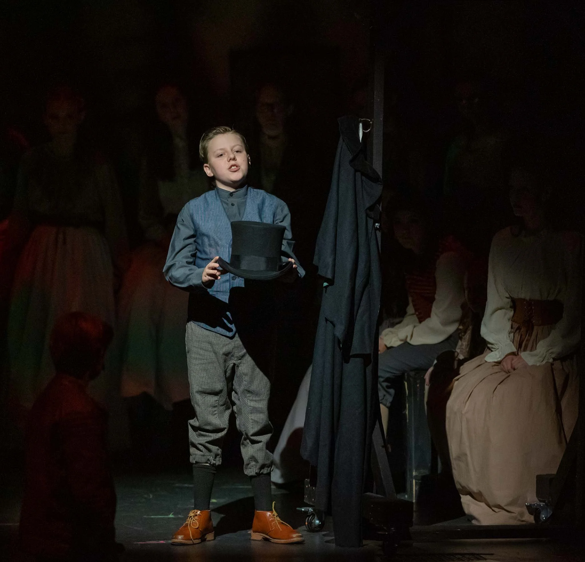 Actors perform on stage with dramatic lighting, portraying a scene with a young boy holding a hat, standing beside a taller man in a suit and top hat, surrounded by other actors in period costumes.