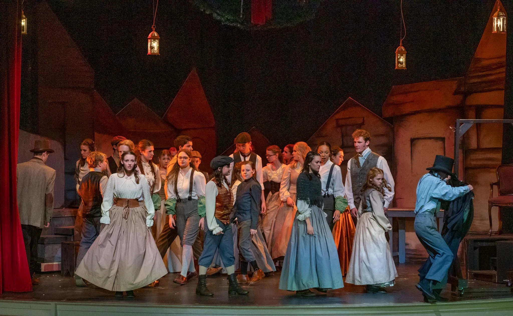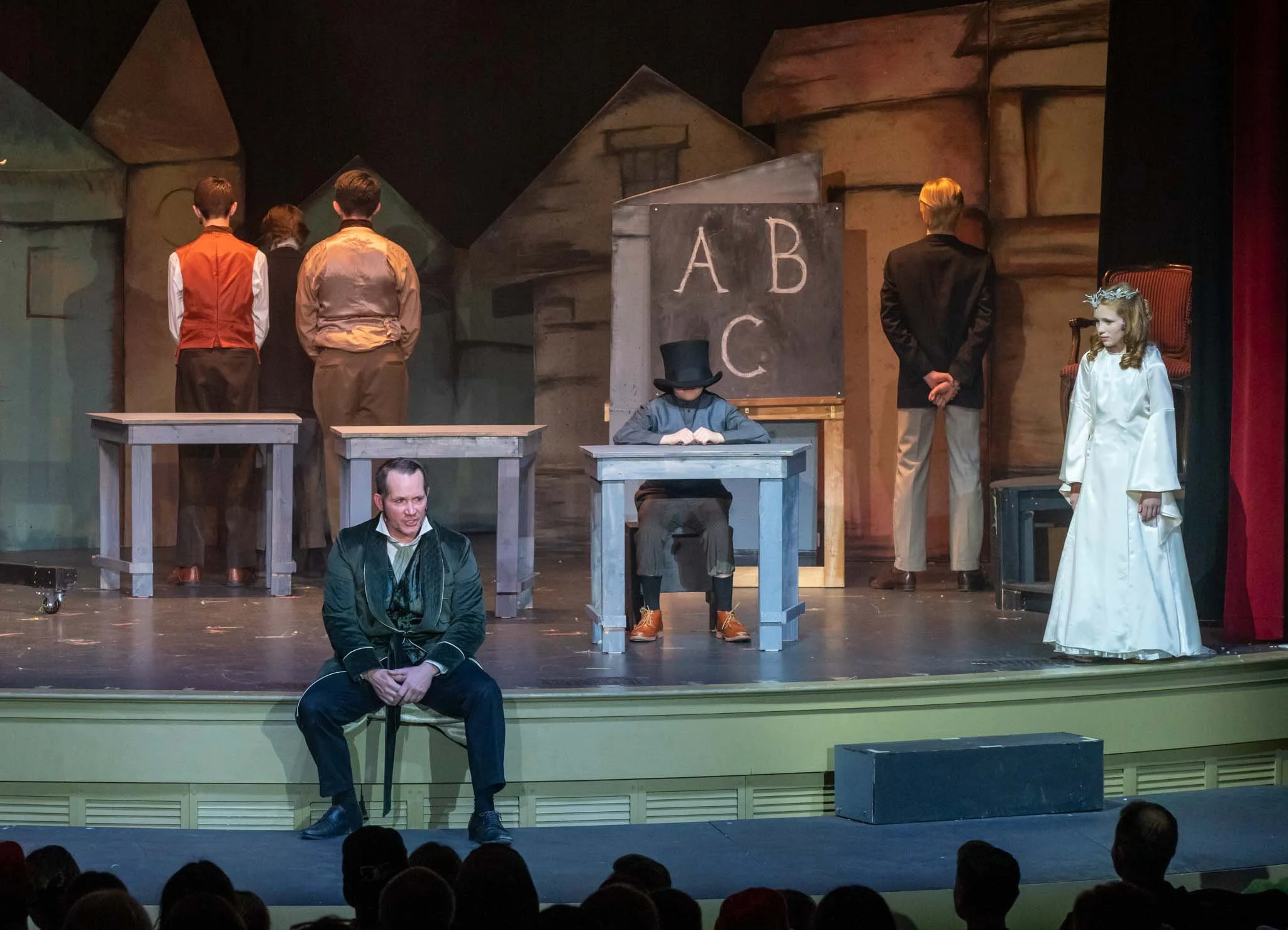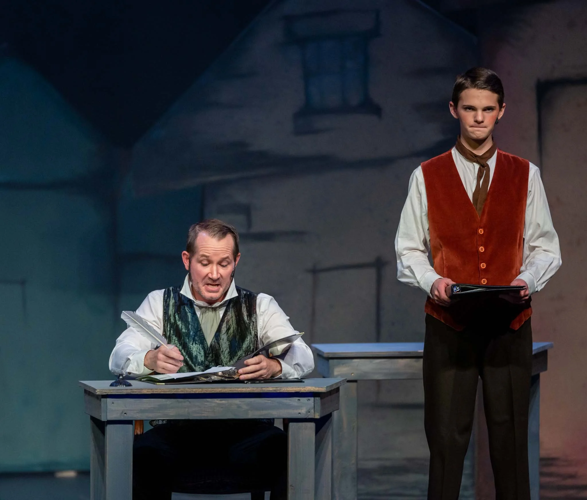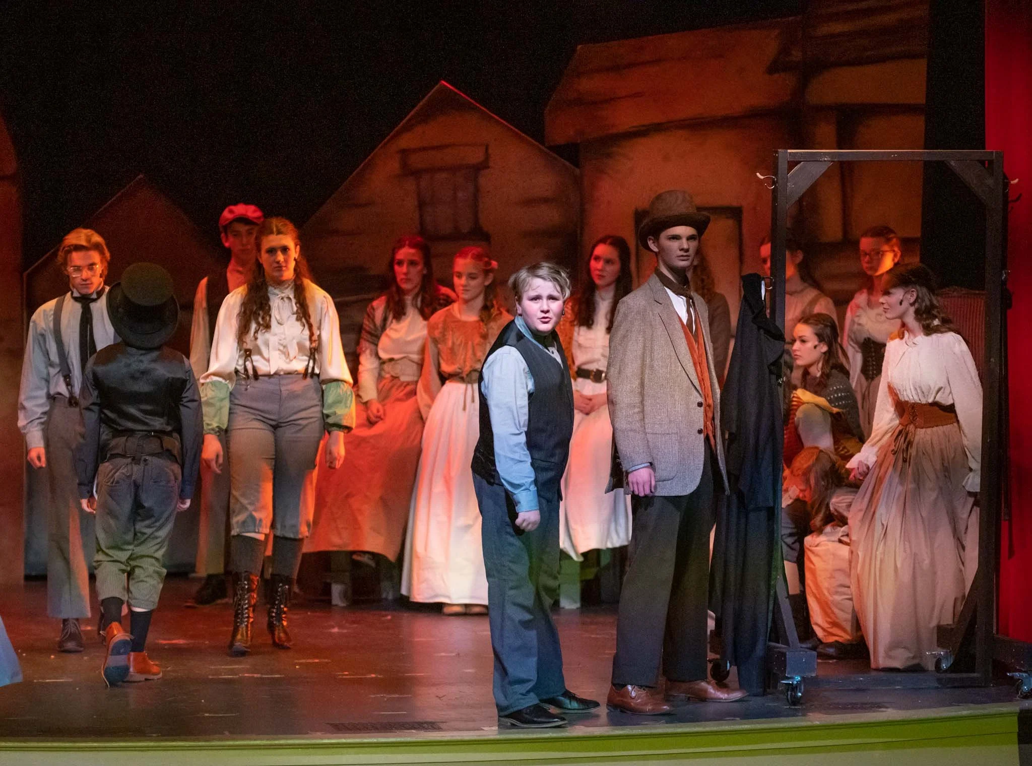 Actors perform on stage with dramatic lighting, portraying a scene with a young boy holding a hat, standing beside a taller man in a suit and top hat, surrounded by other actors in period costumes.