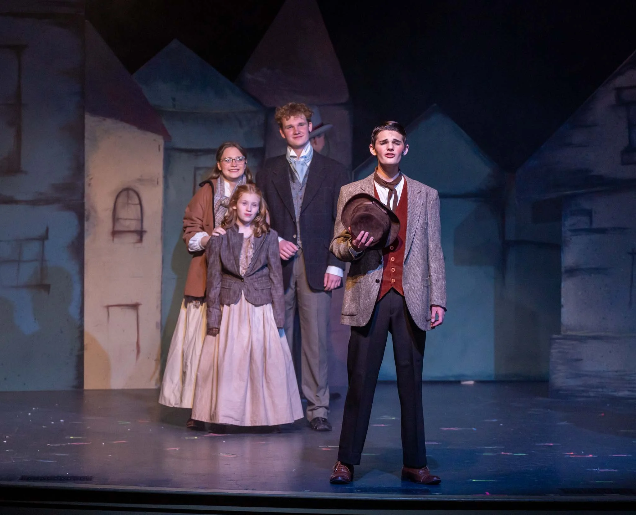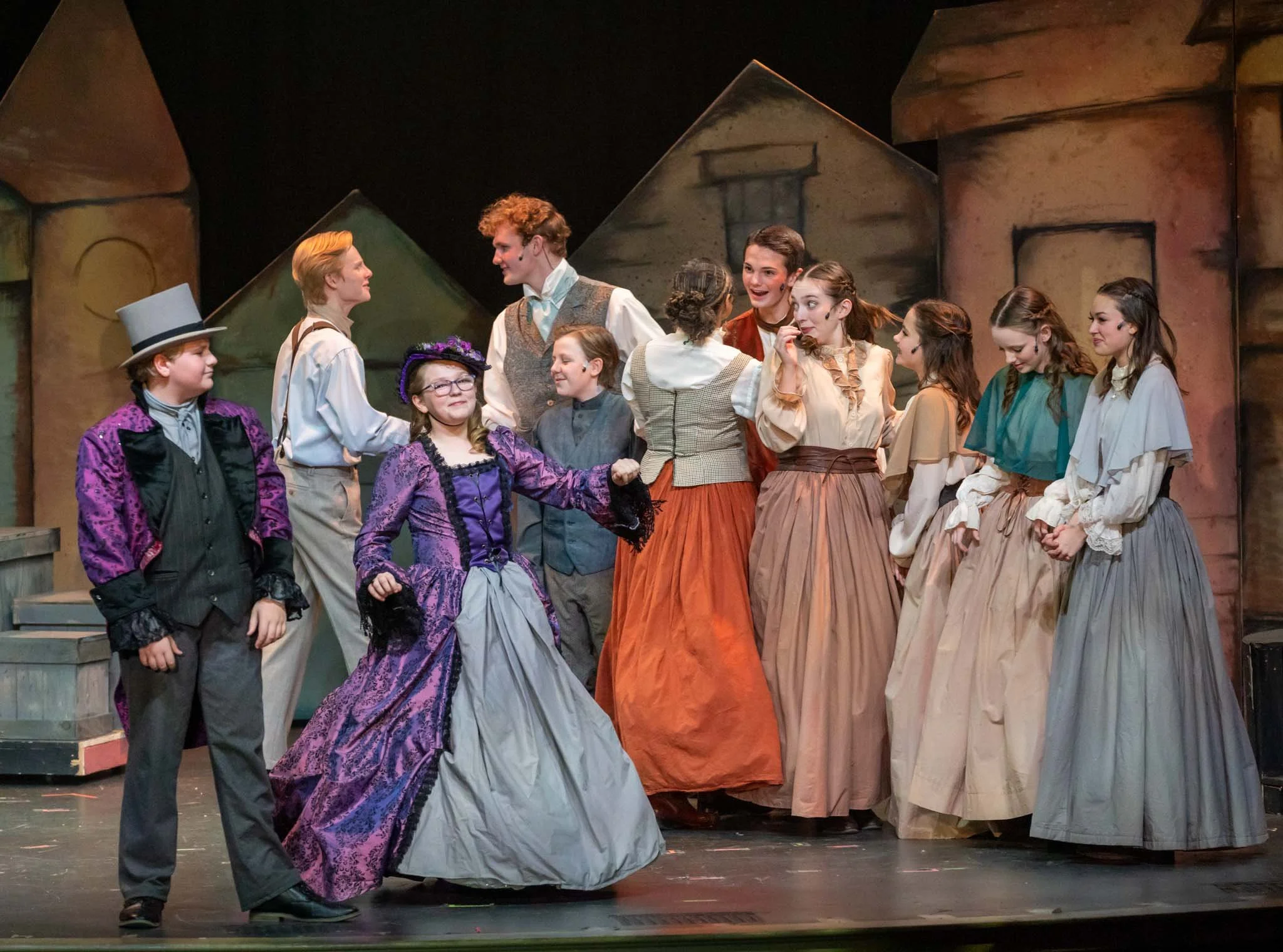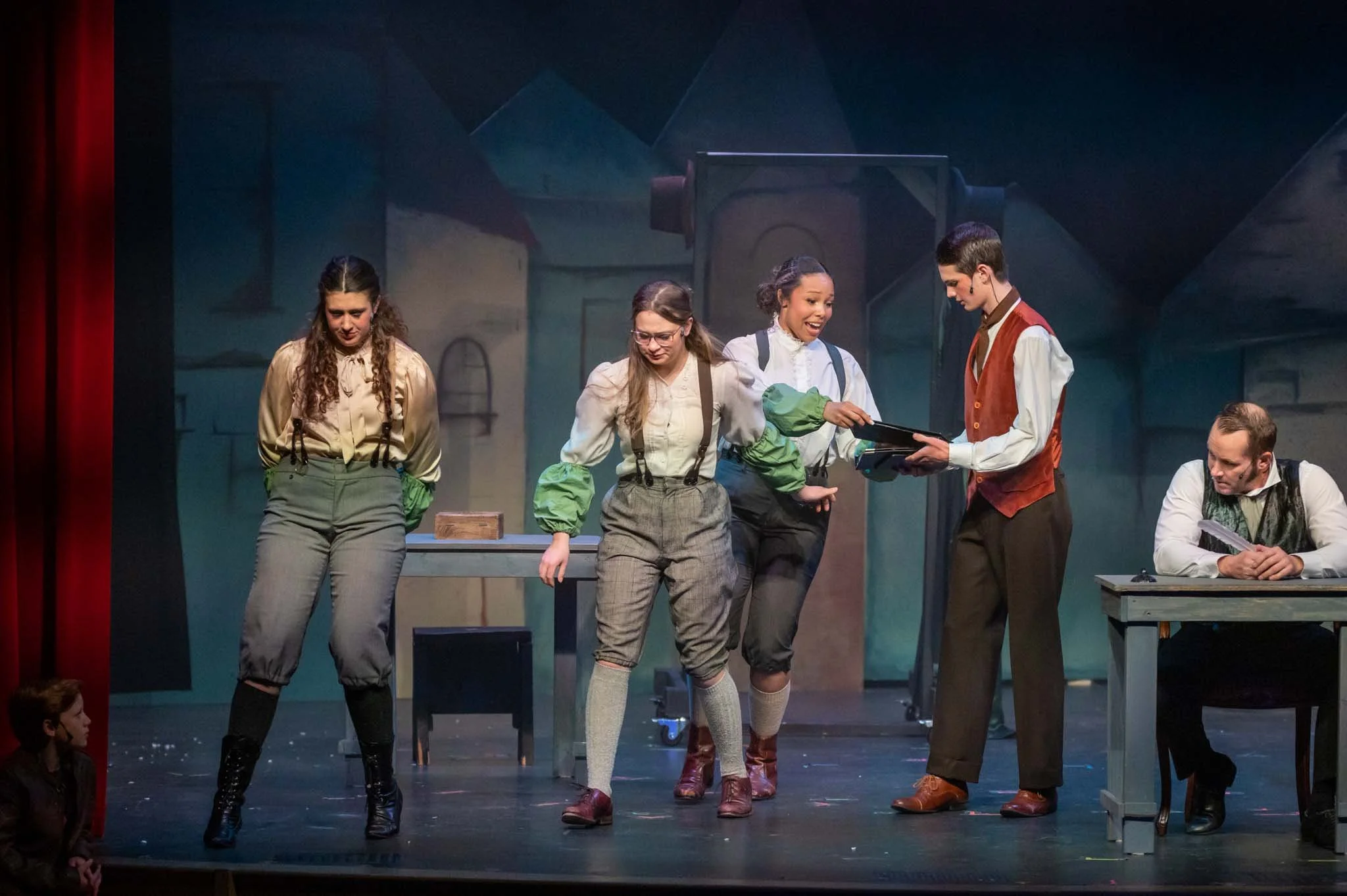 Five young actors on stage performing in a play set in a historical time period. The actors are dressed in period costumes, including dresses and vests, and are engaged in a scene, with some smiling and talking to each other.