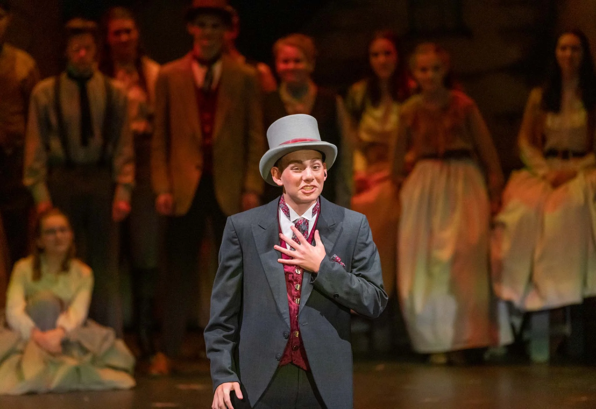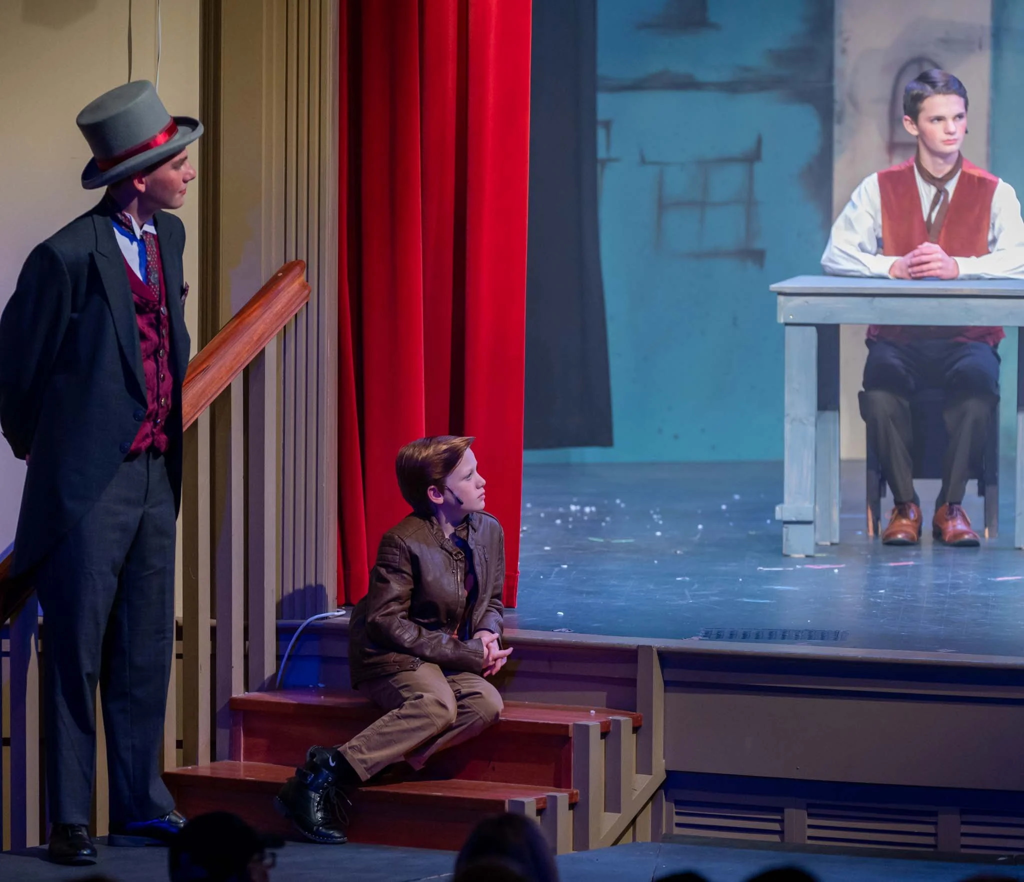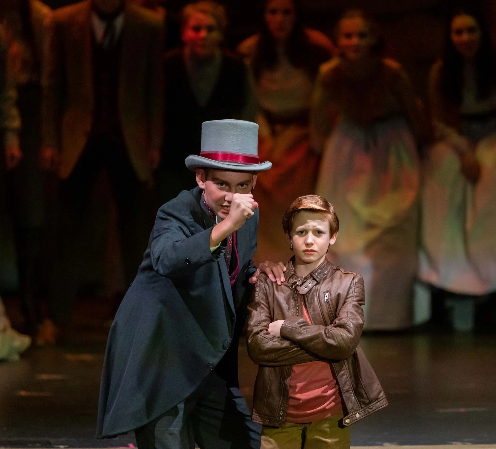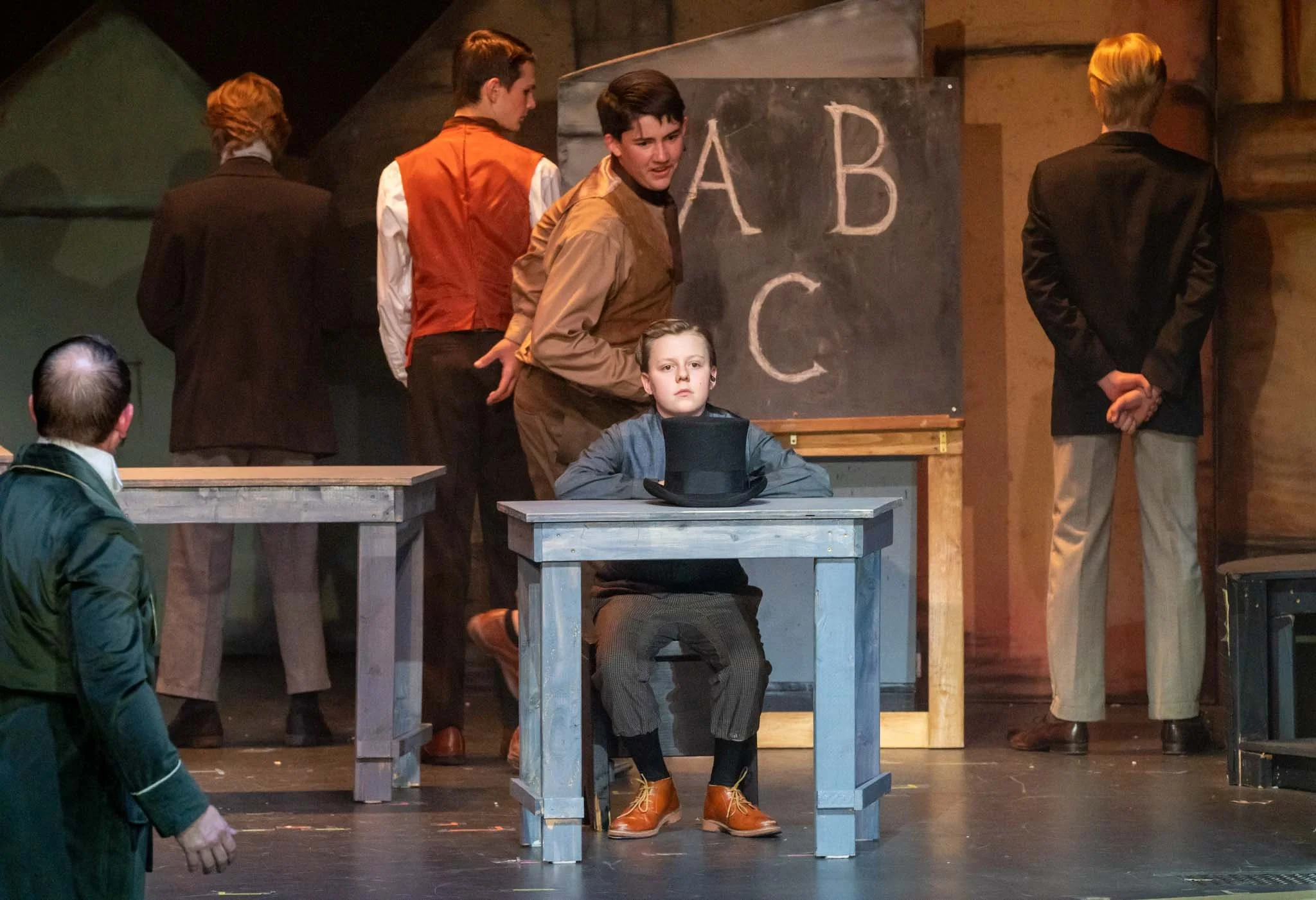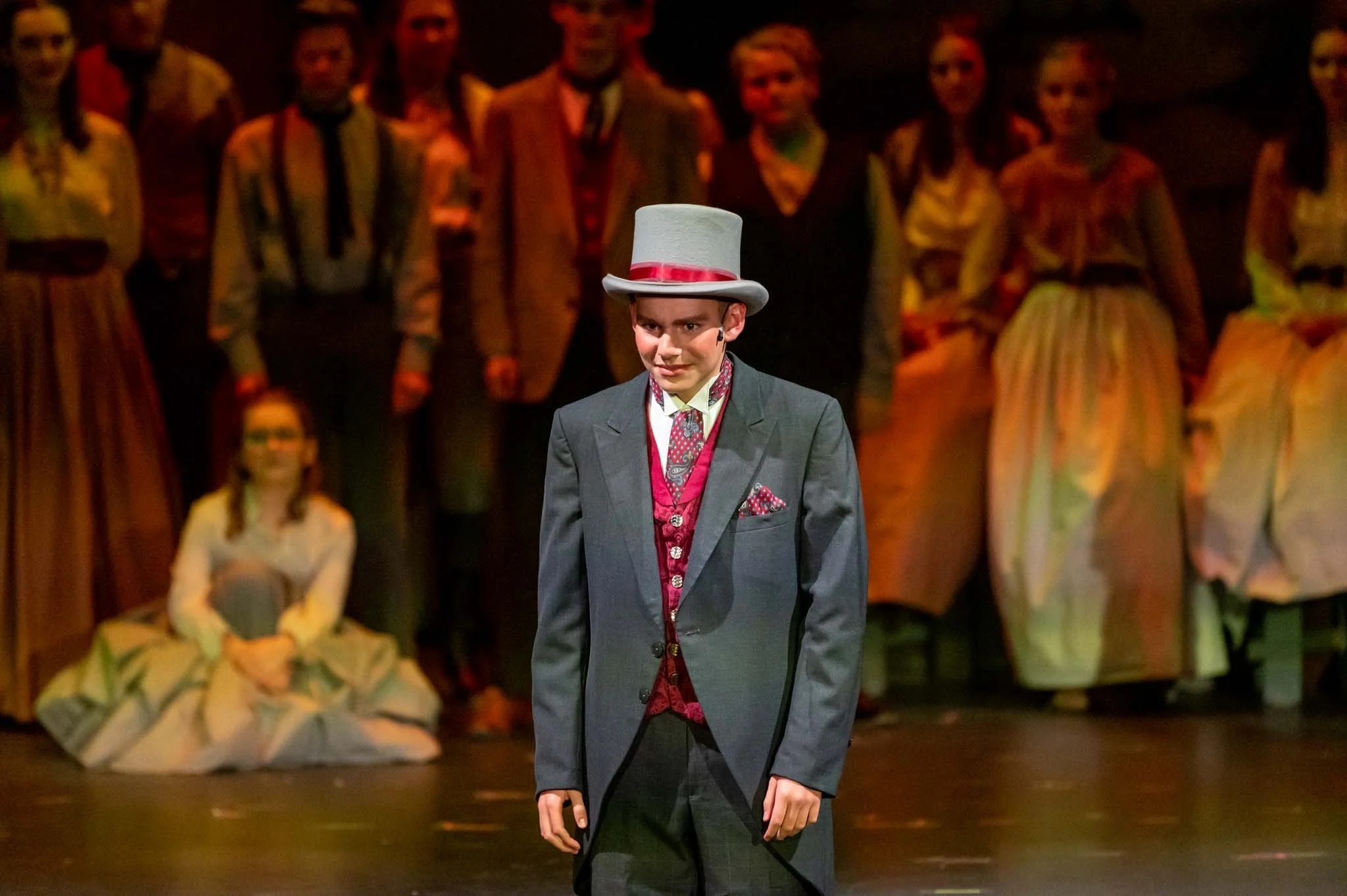 A young boy dressed as a character with a gray top hat, gray coat, red vest, and patterned tie on stage during a theatrical performance, with a group of actors in period costumes in the background.