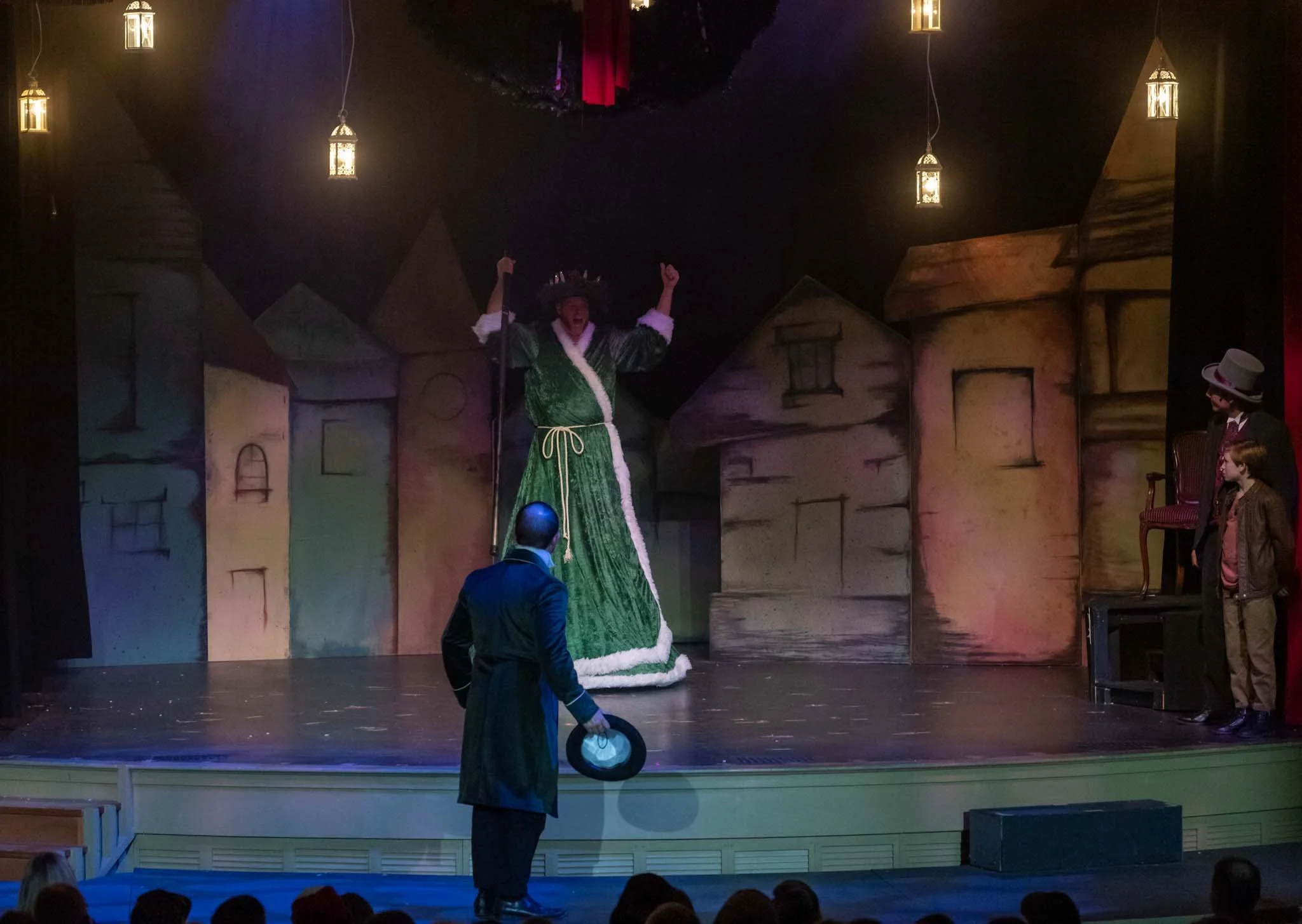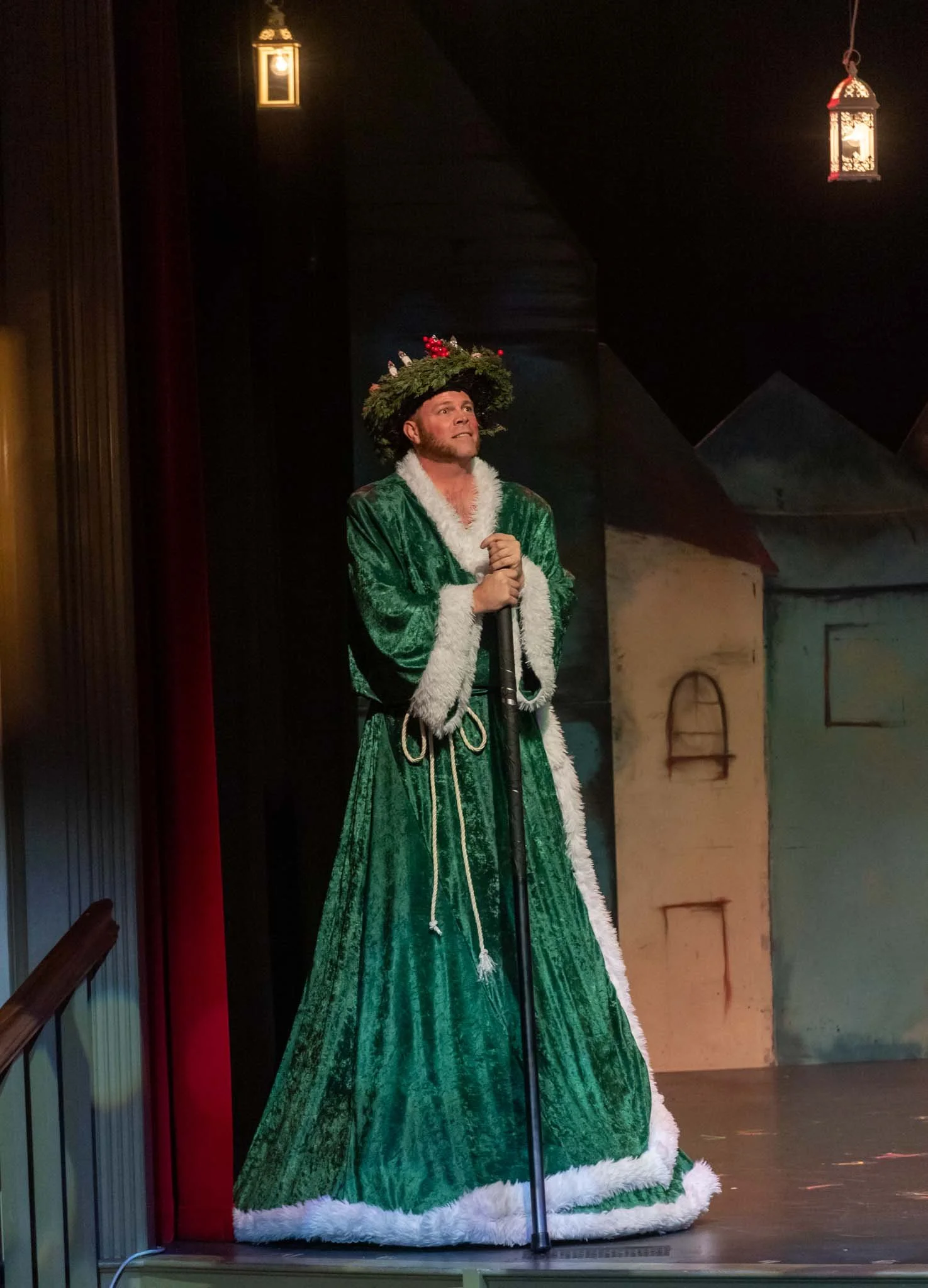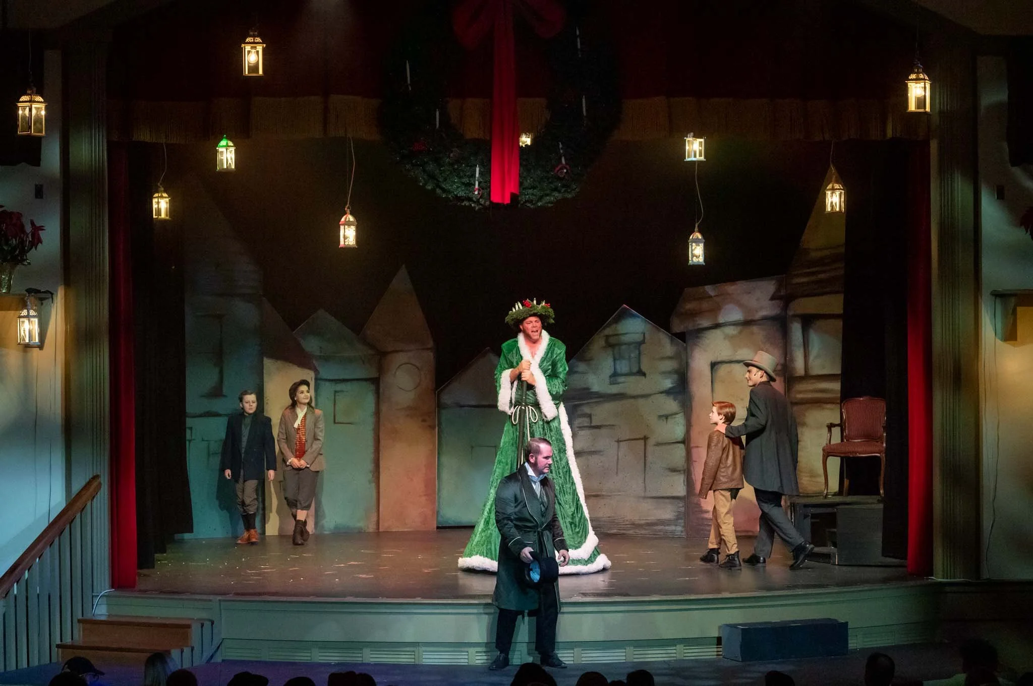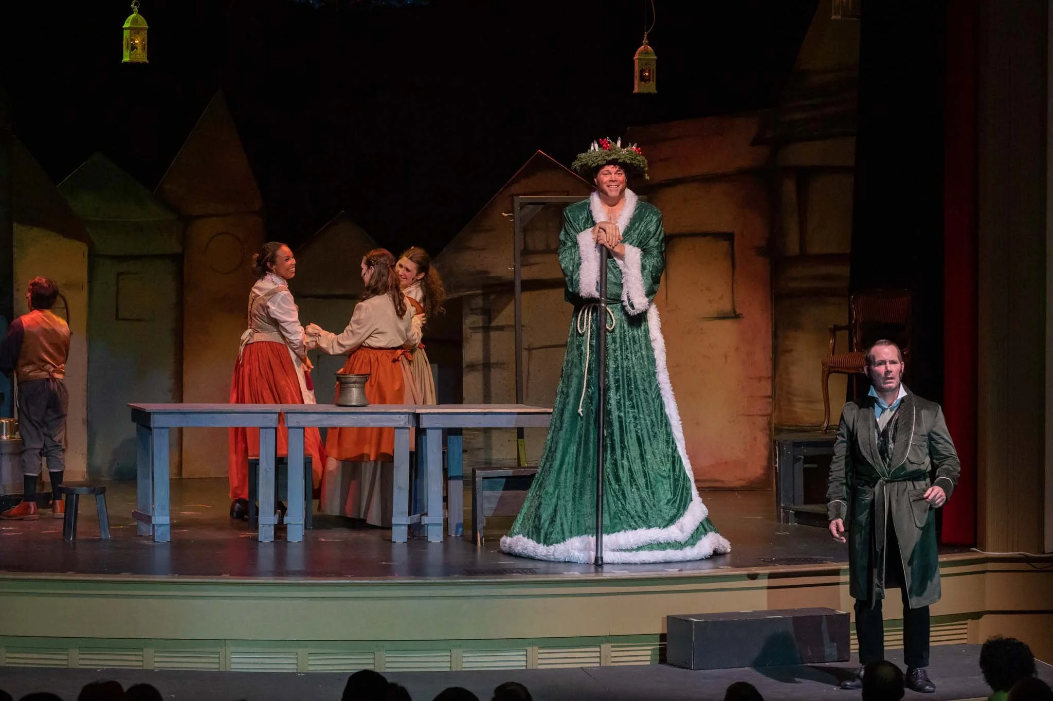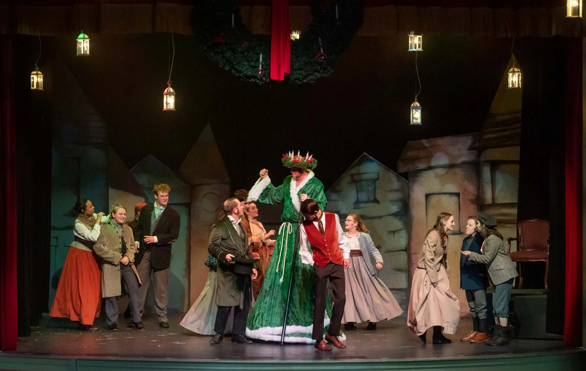 Theater stage with actors performing a play. One actor dressed in a Santa-like green robe with white trim and a festive wreath hat stands on stilts, while another actor in a gray coat stands on the stage. Three actresses in period costumes, holding h