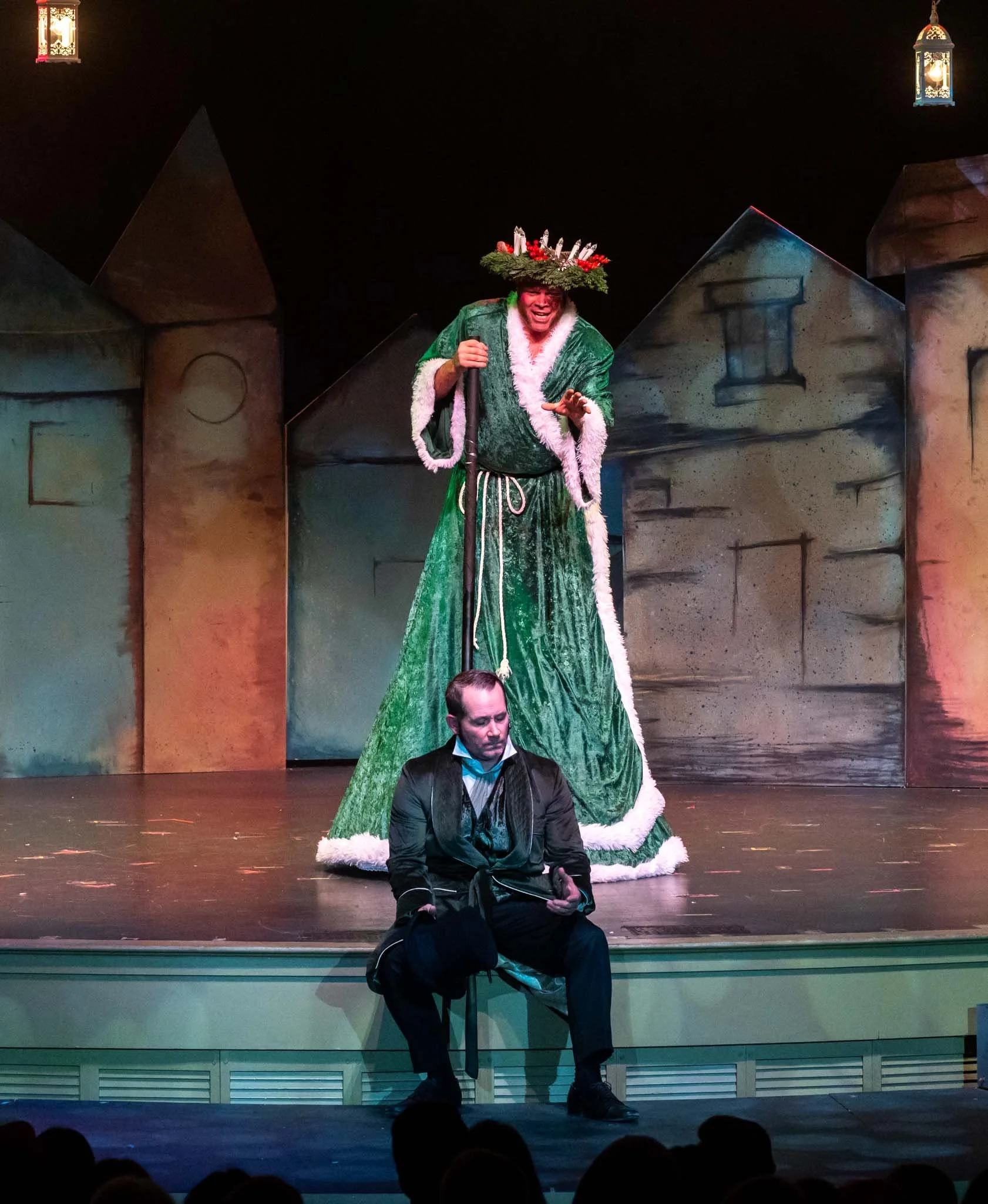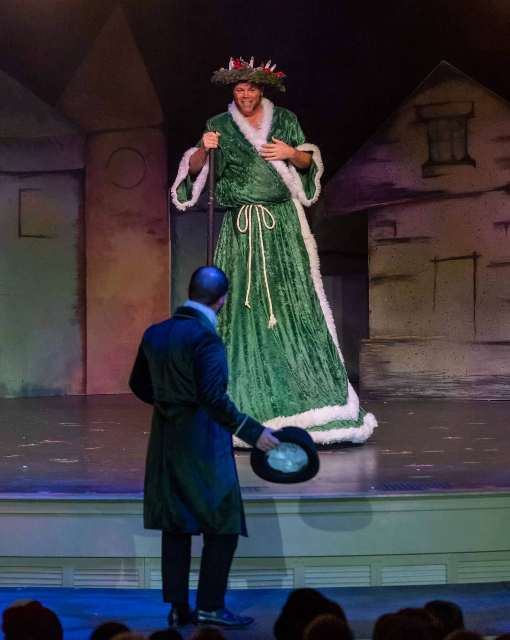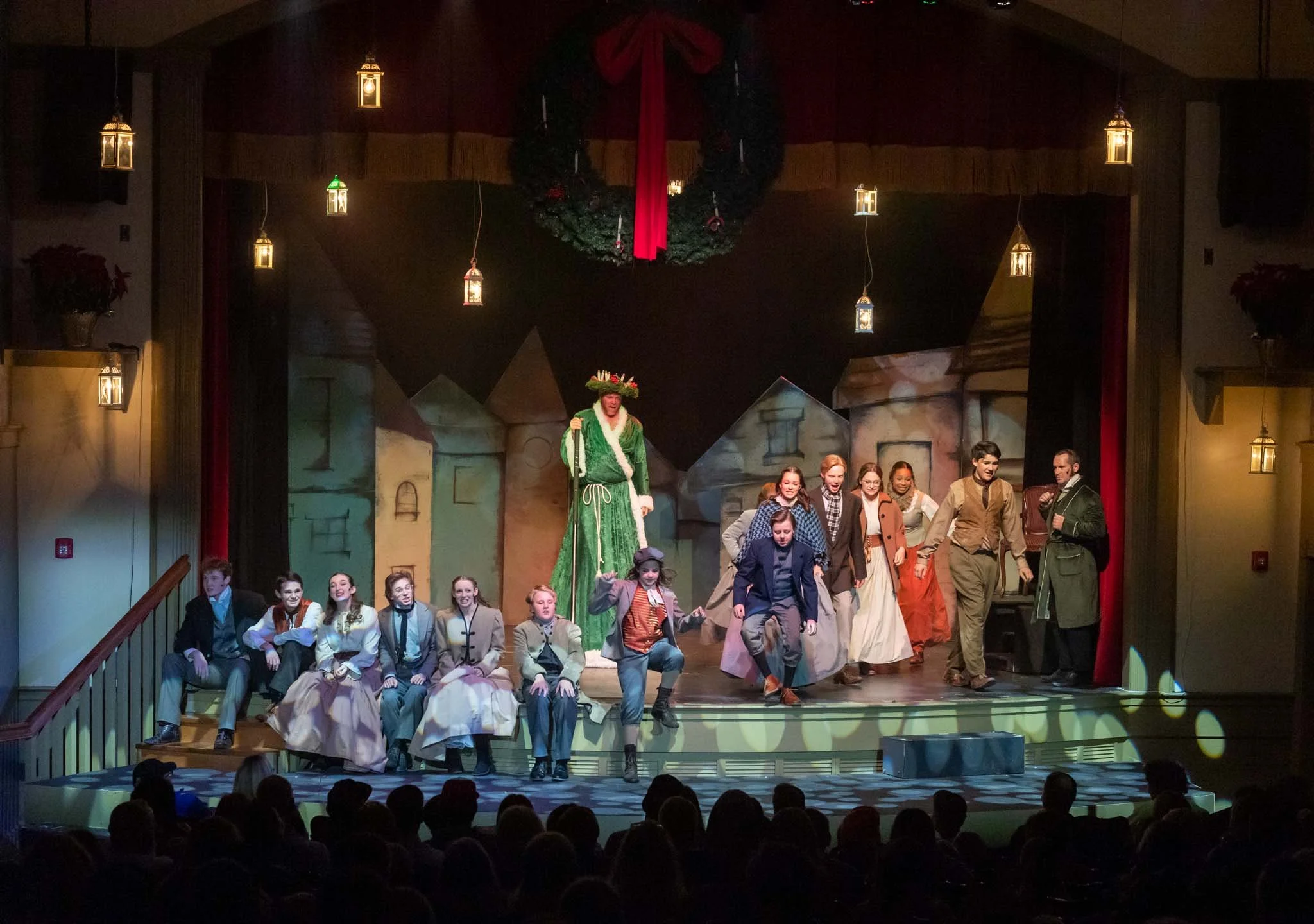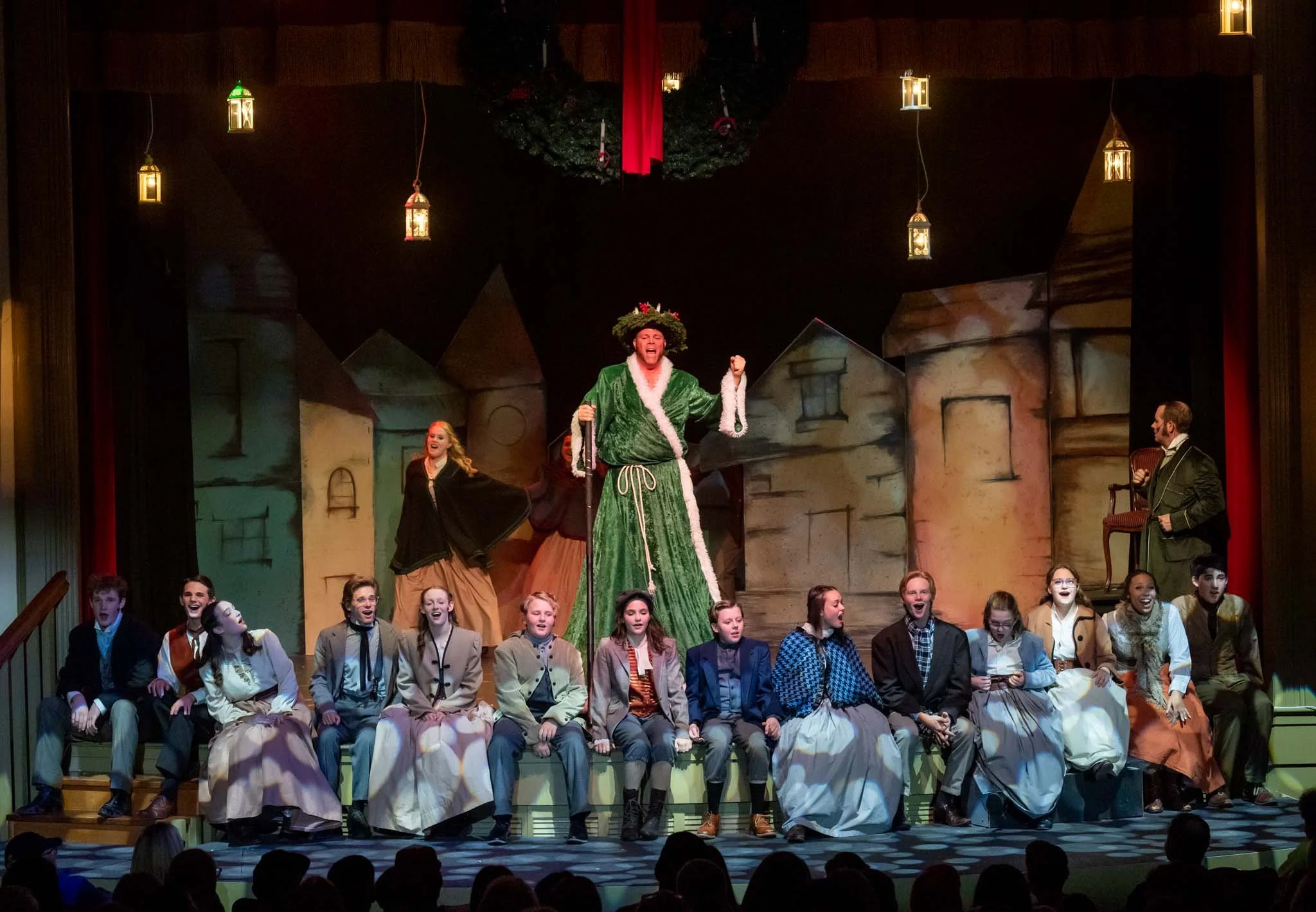 Theater stage with actors performing a play. One actor dressed in a Santa-like green robe with white trim and a festive wreath hat stands on stilts, while another actor in a gray coat stands on the stage. Three actresses in period costumes, holding h