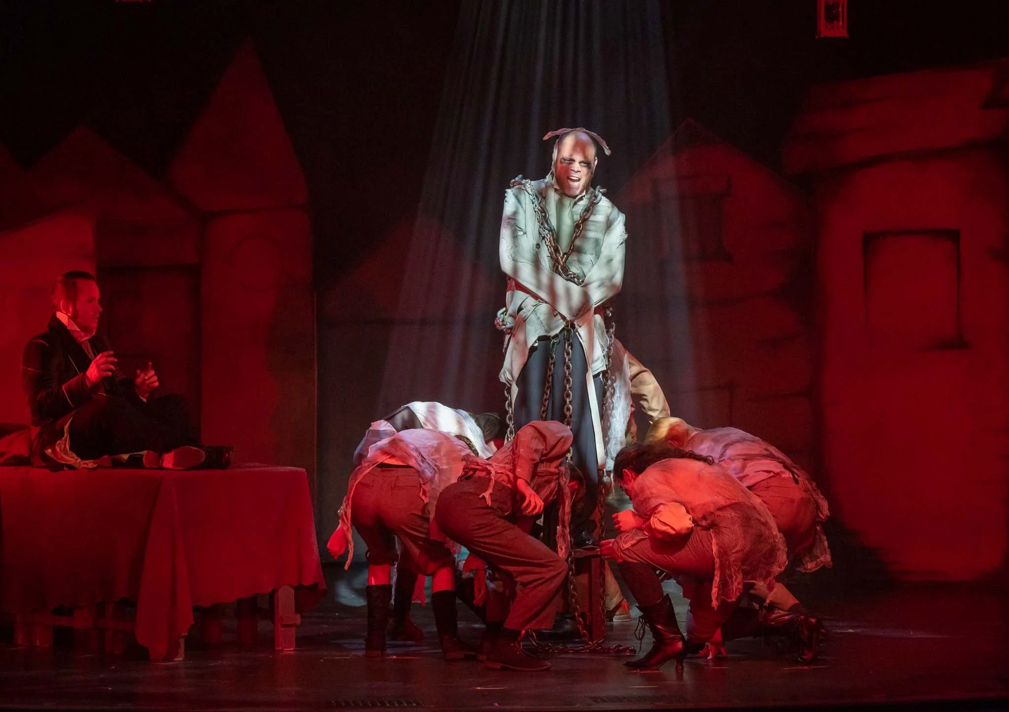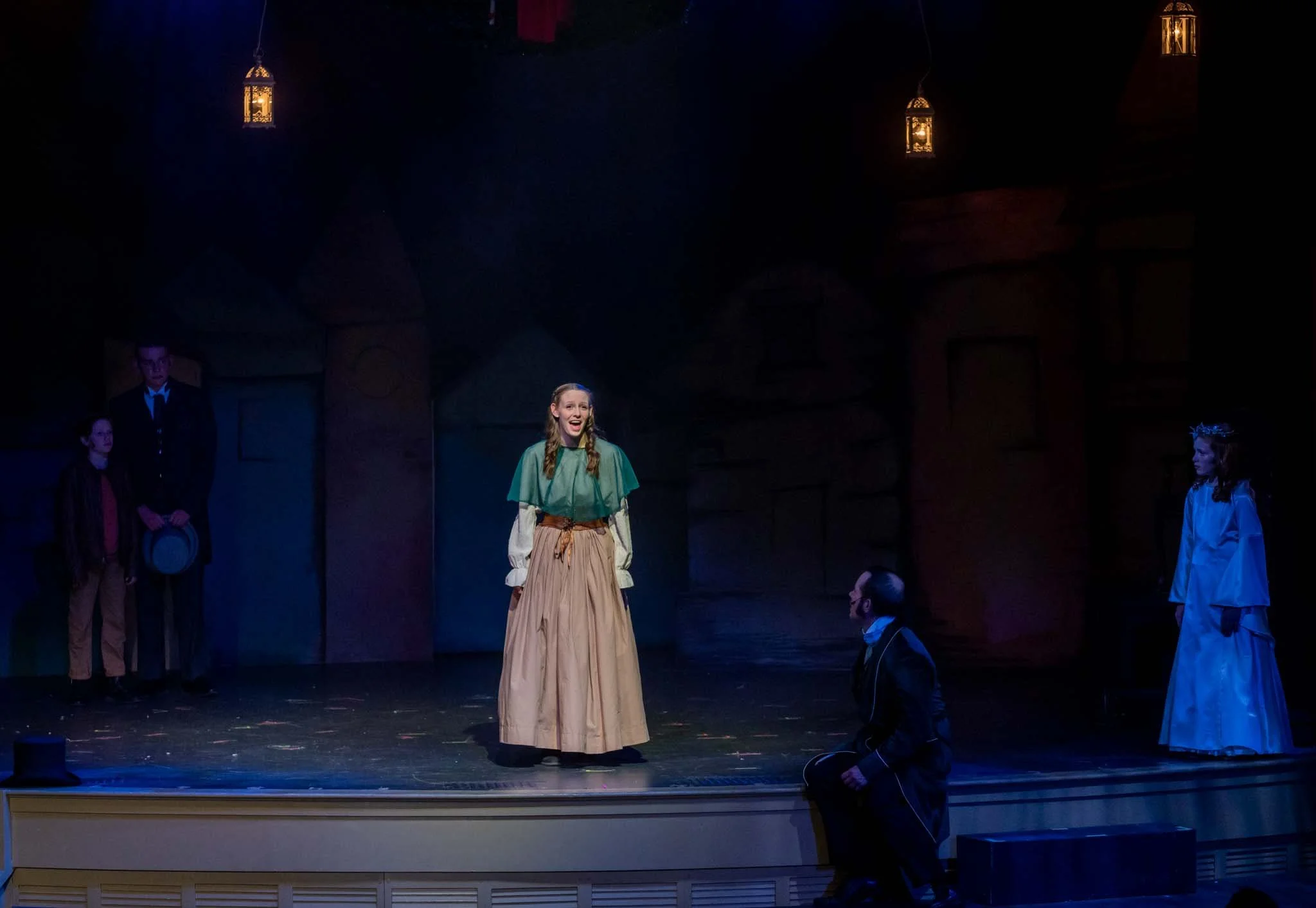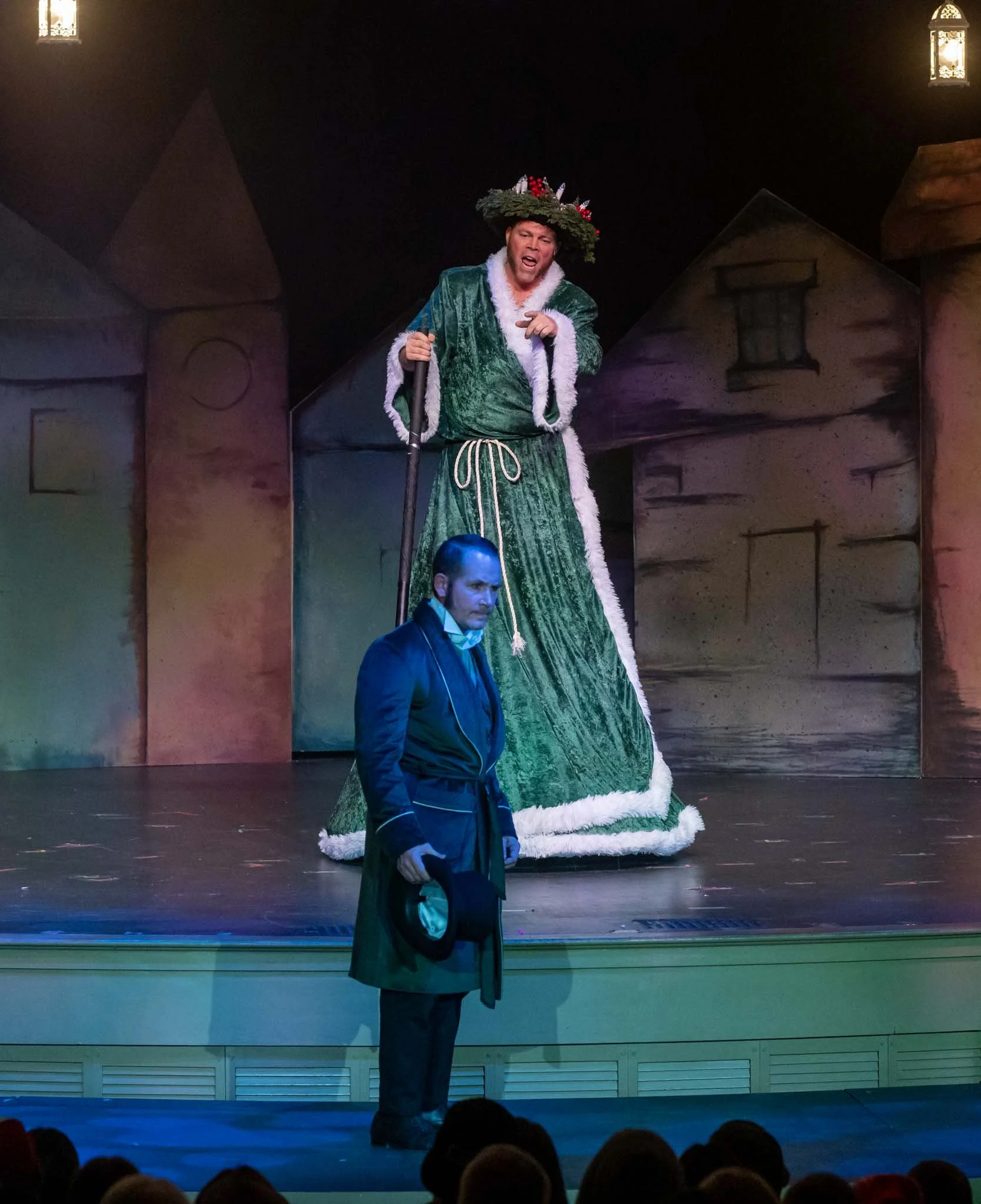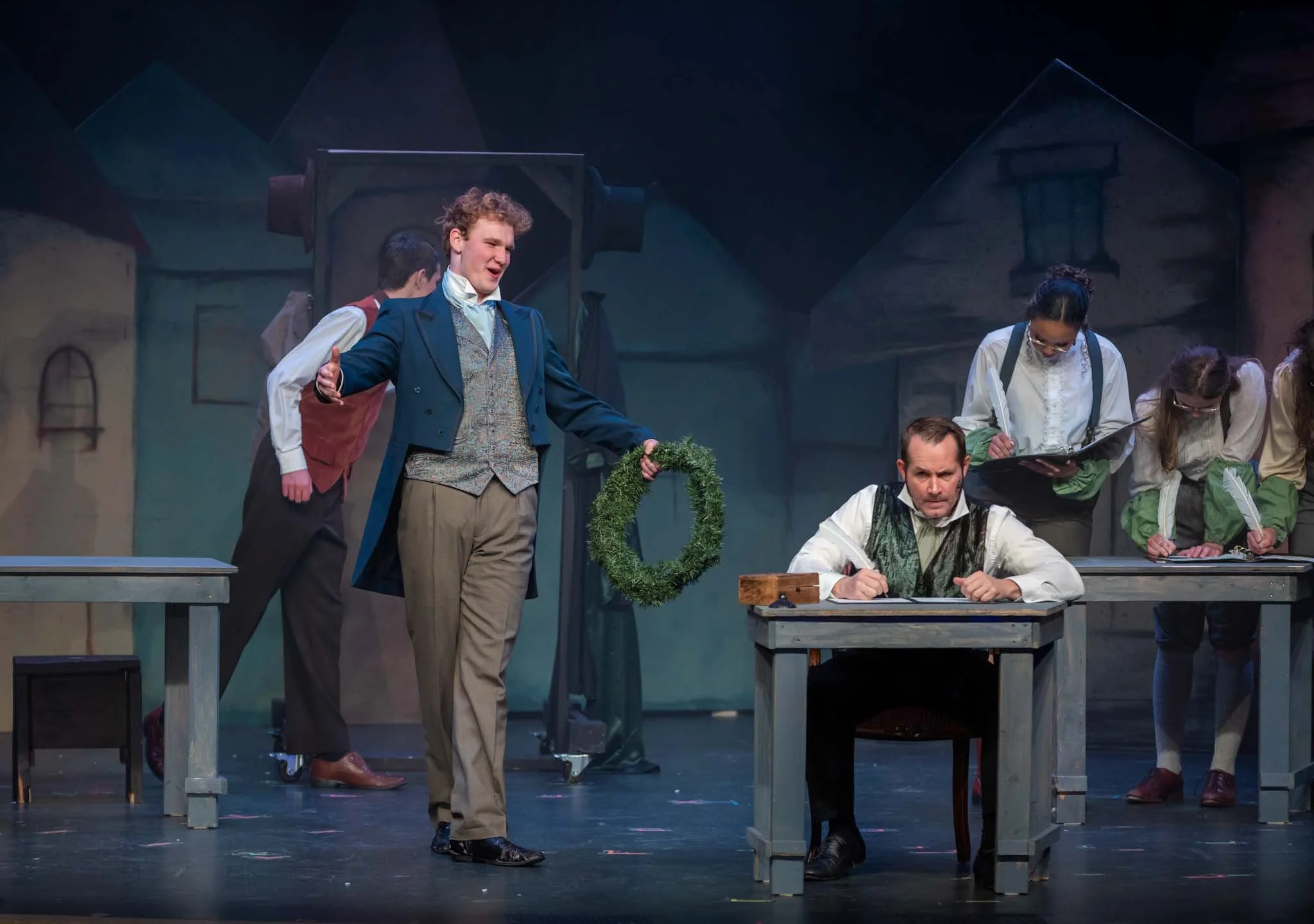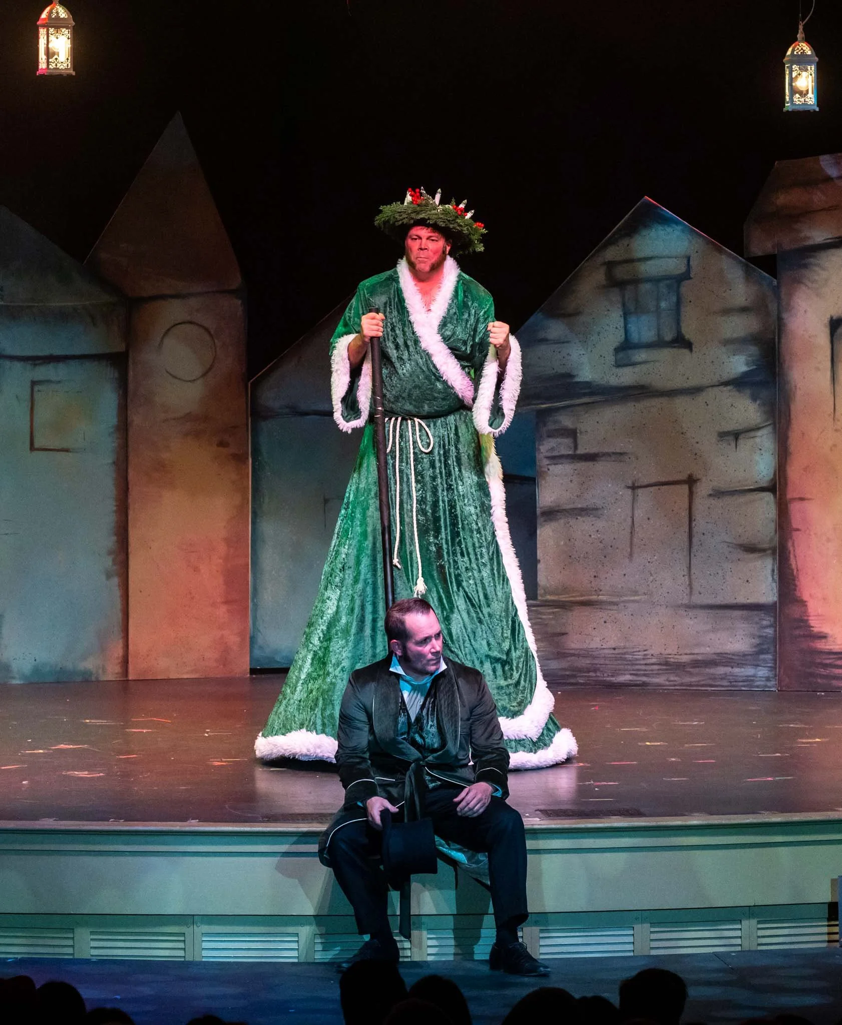 Theater stage with actors performing a play. One actor dressed in a Santa-like green robe with white trim and a festive wreath hat stands on stilts, while another actor in a gray coat stands on the stage. Three actresses in period costumes, holding h