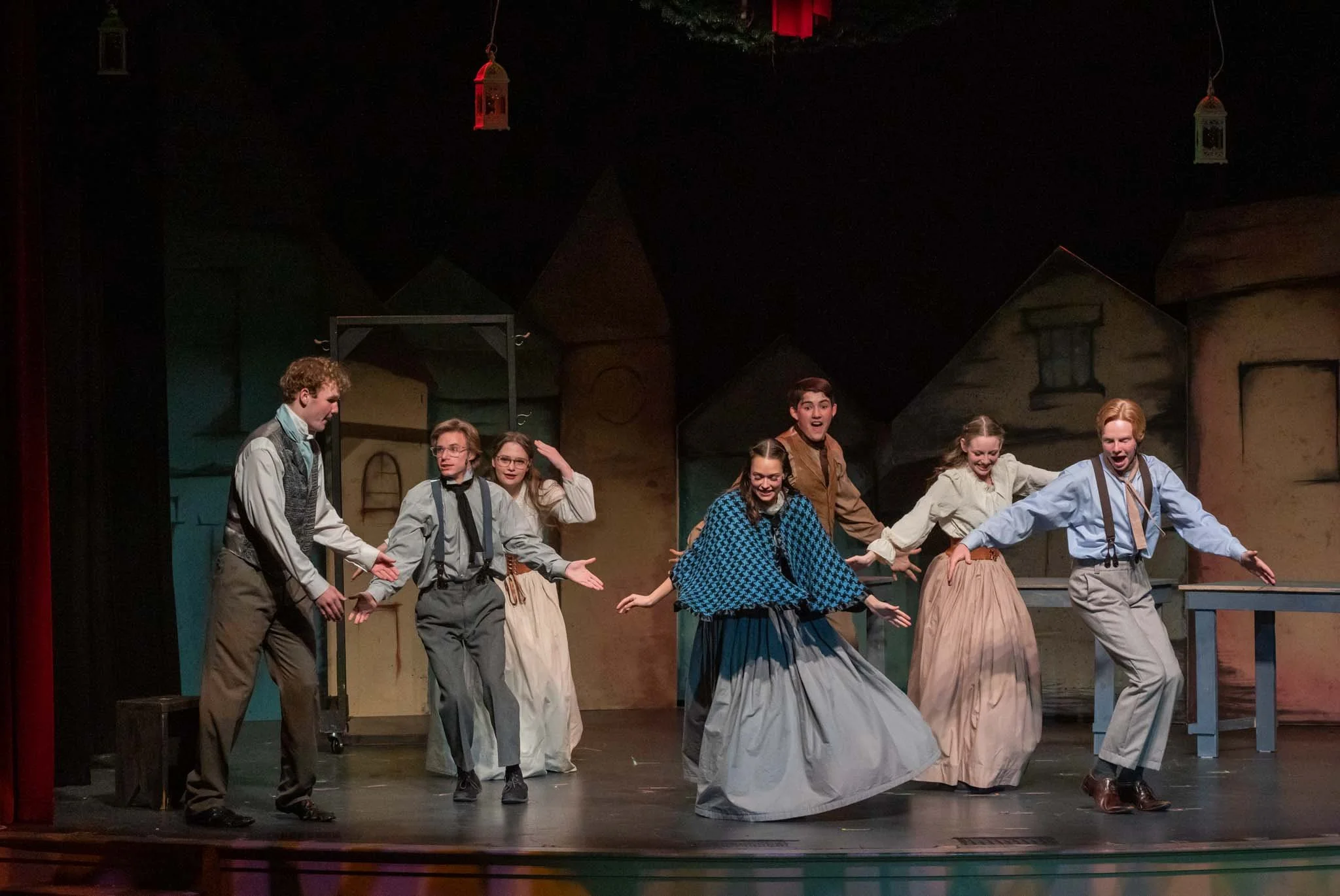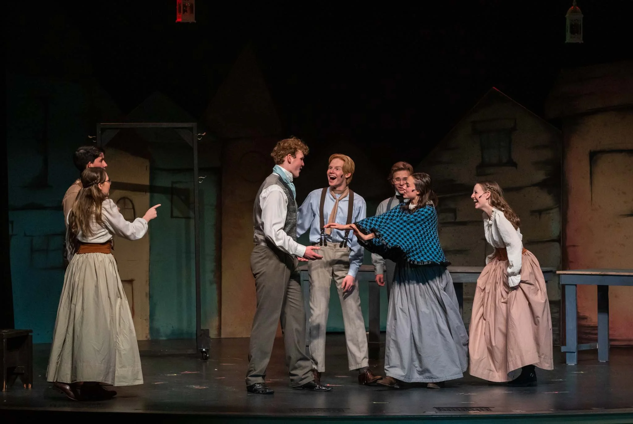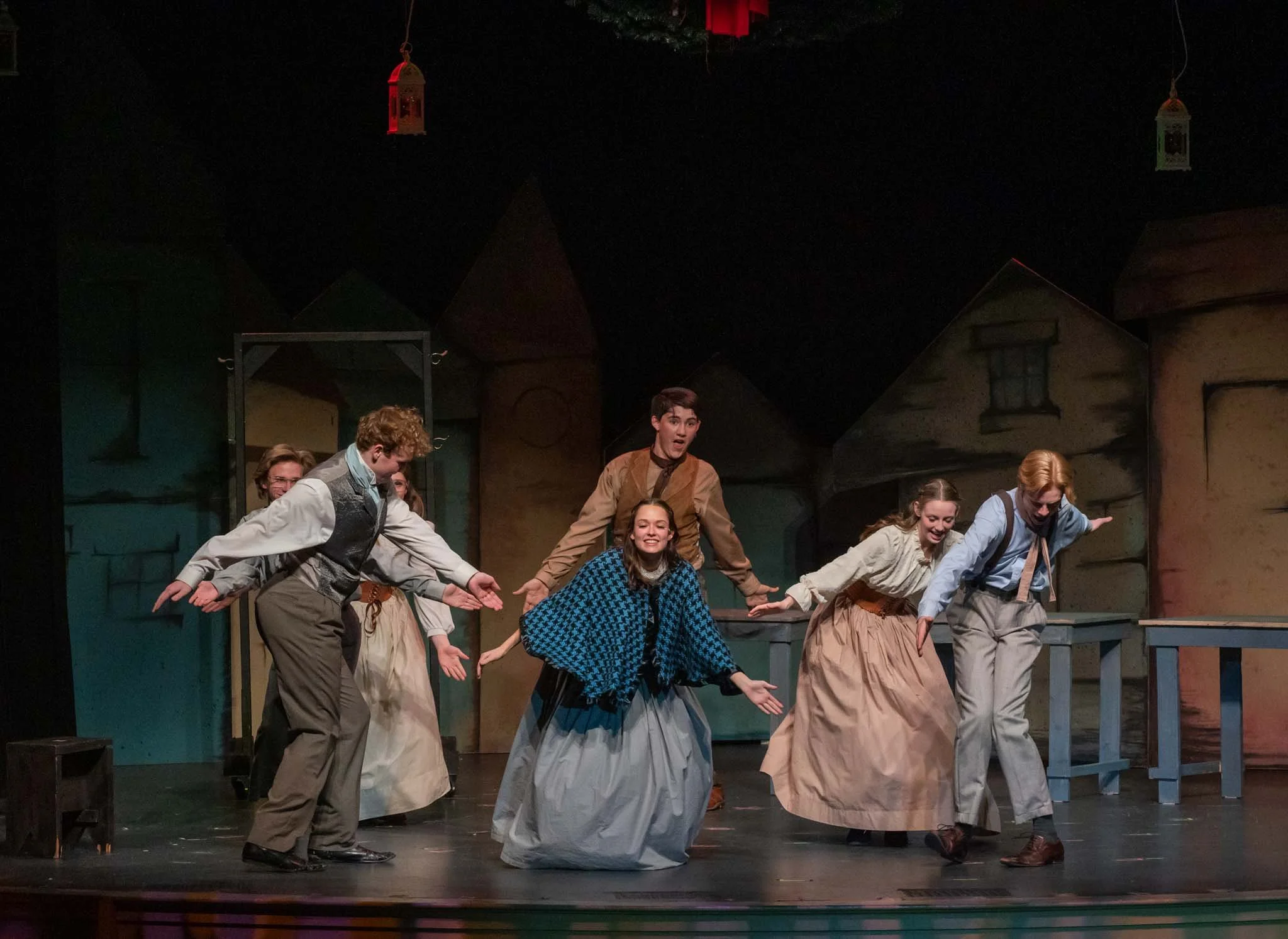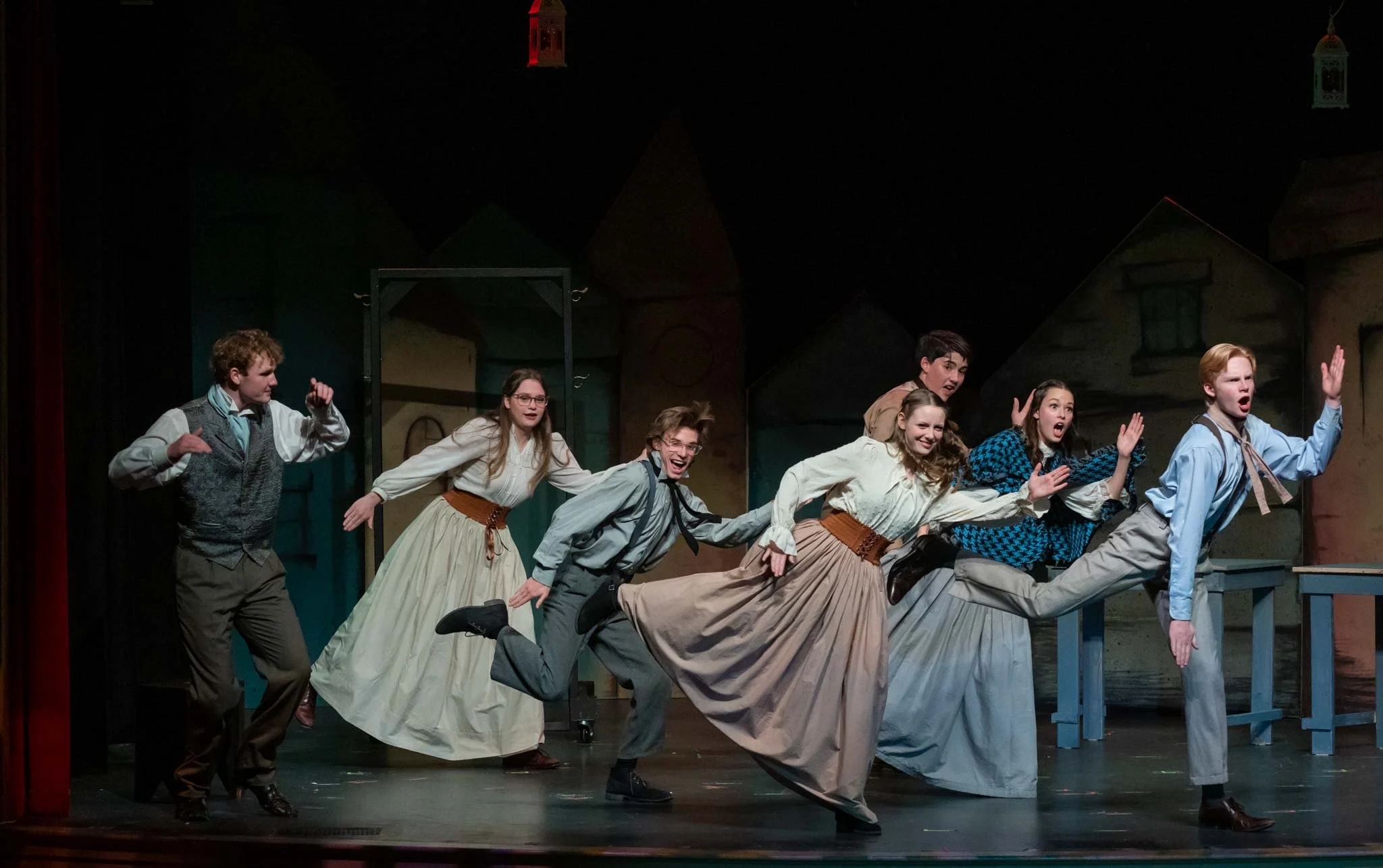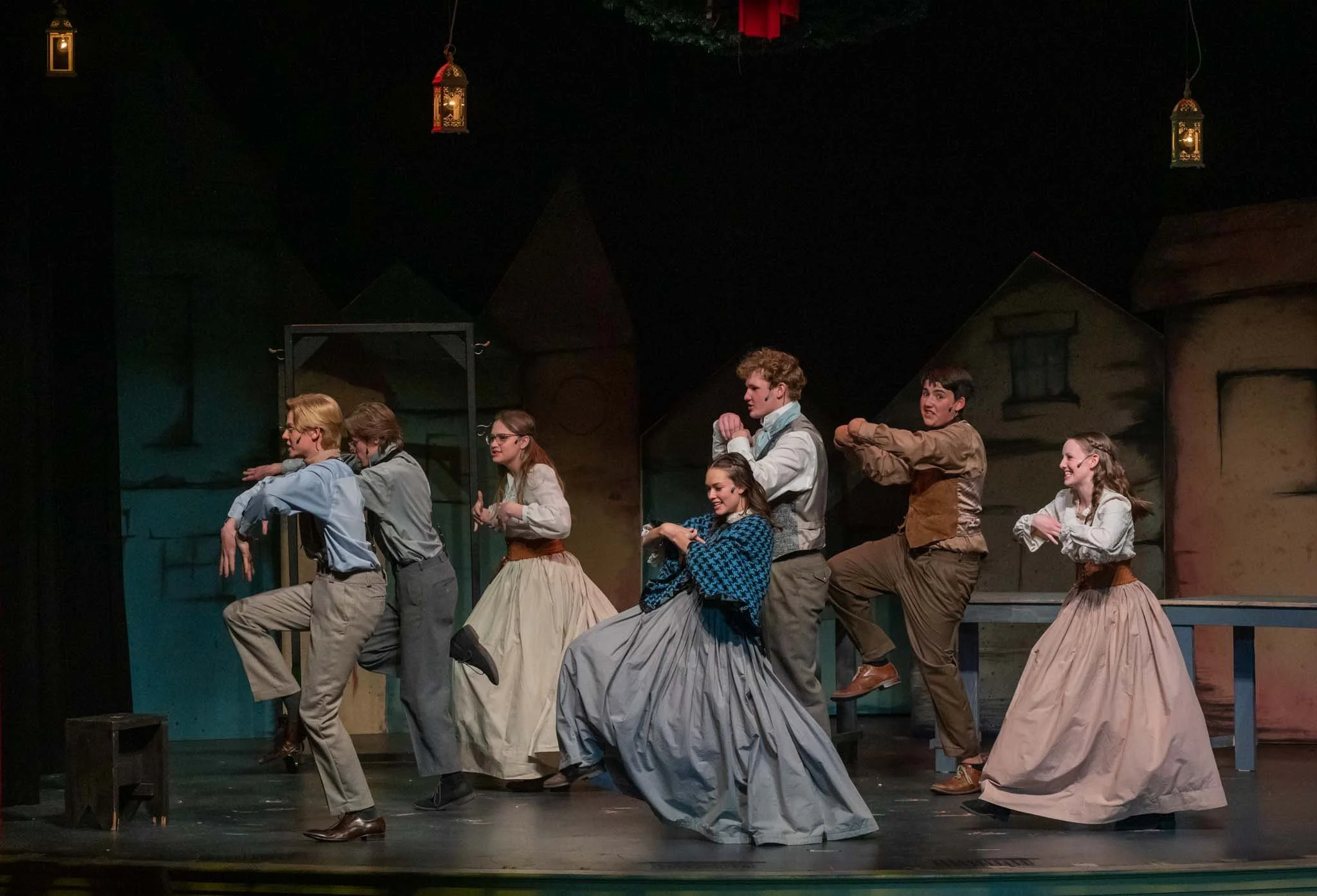 A group of seven actors performing a musical on stage, dressed in period costumes with a town scene backdrop. They are dancing in choreographed positions.