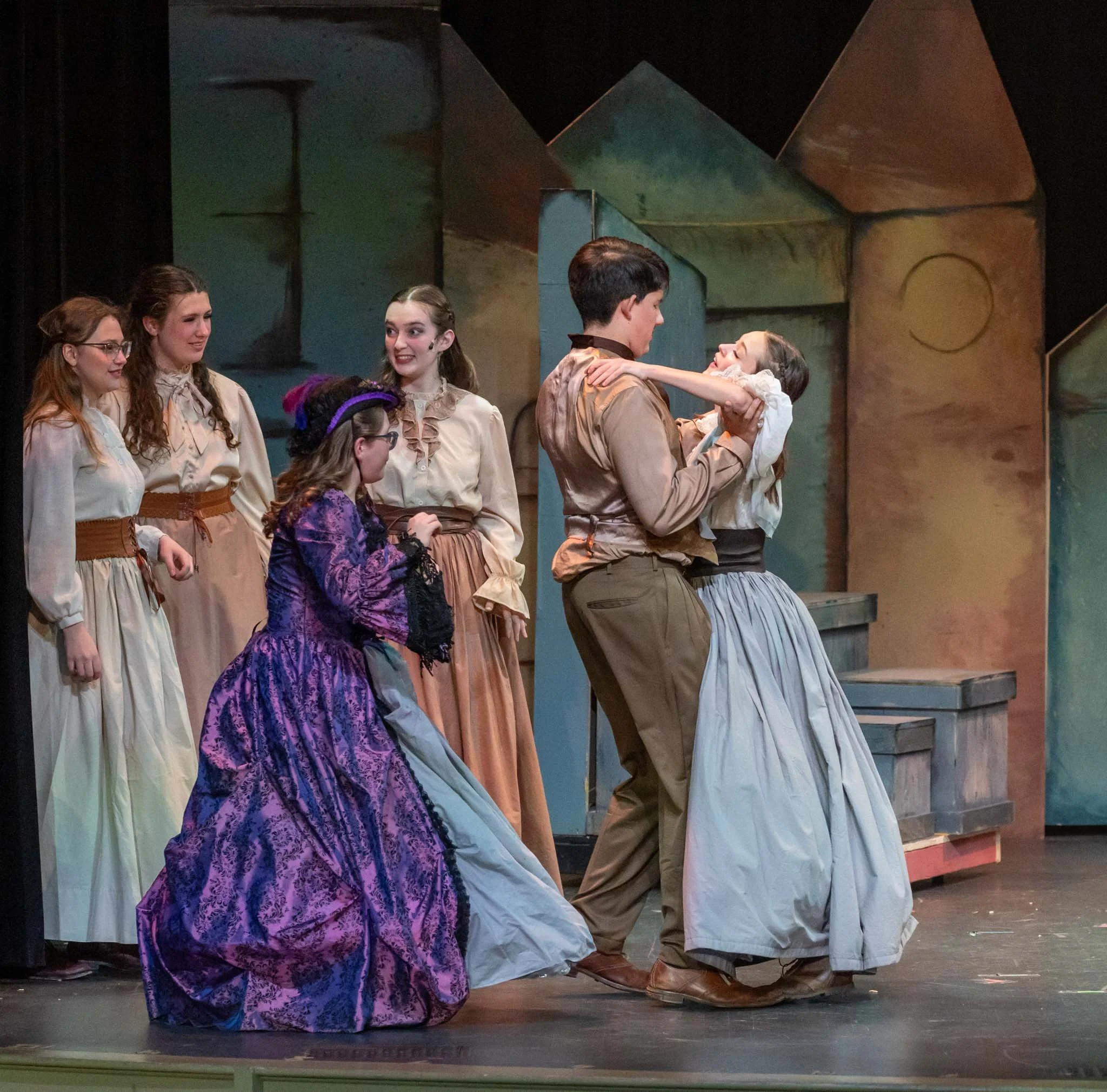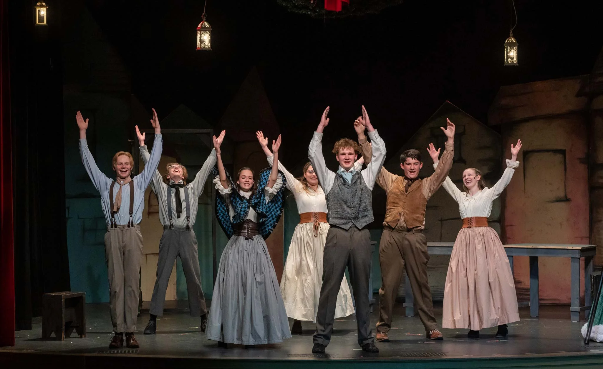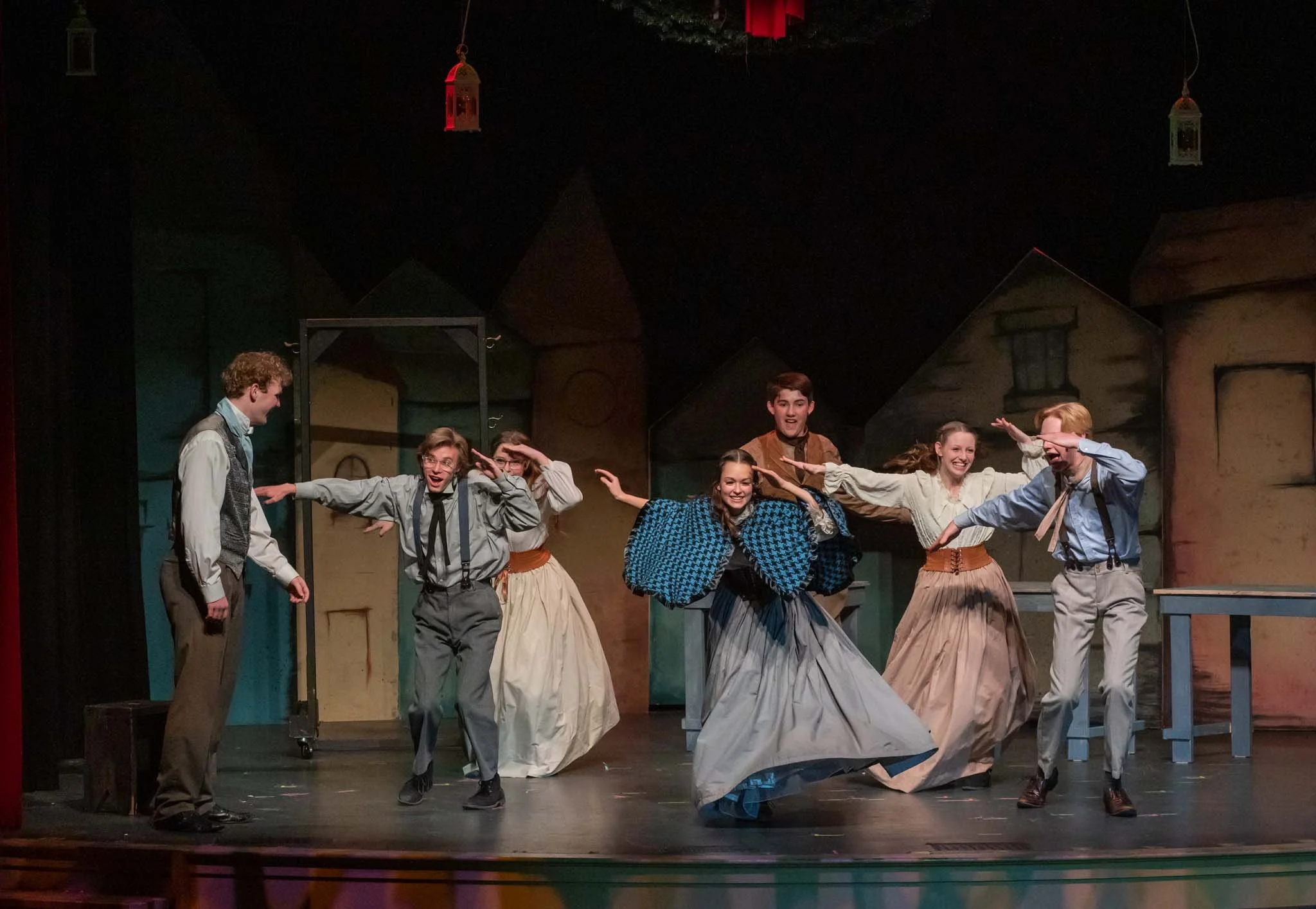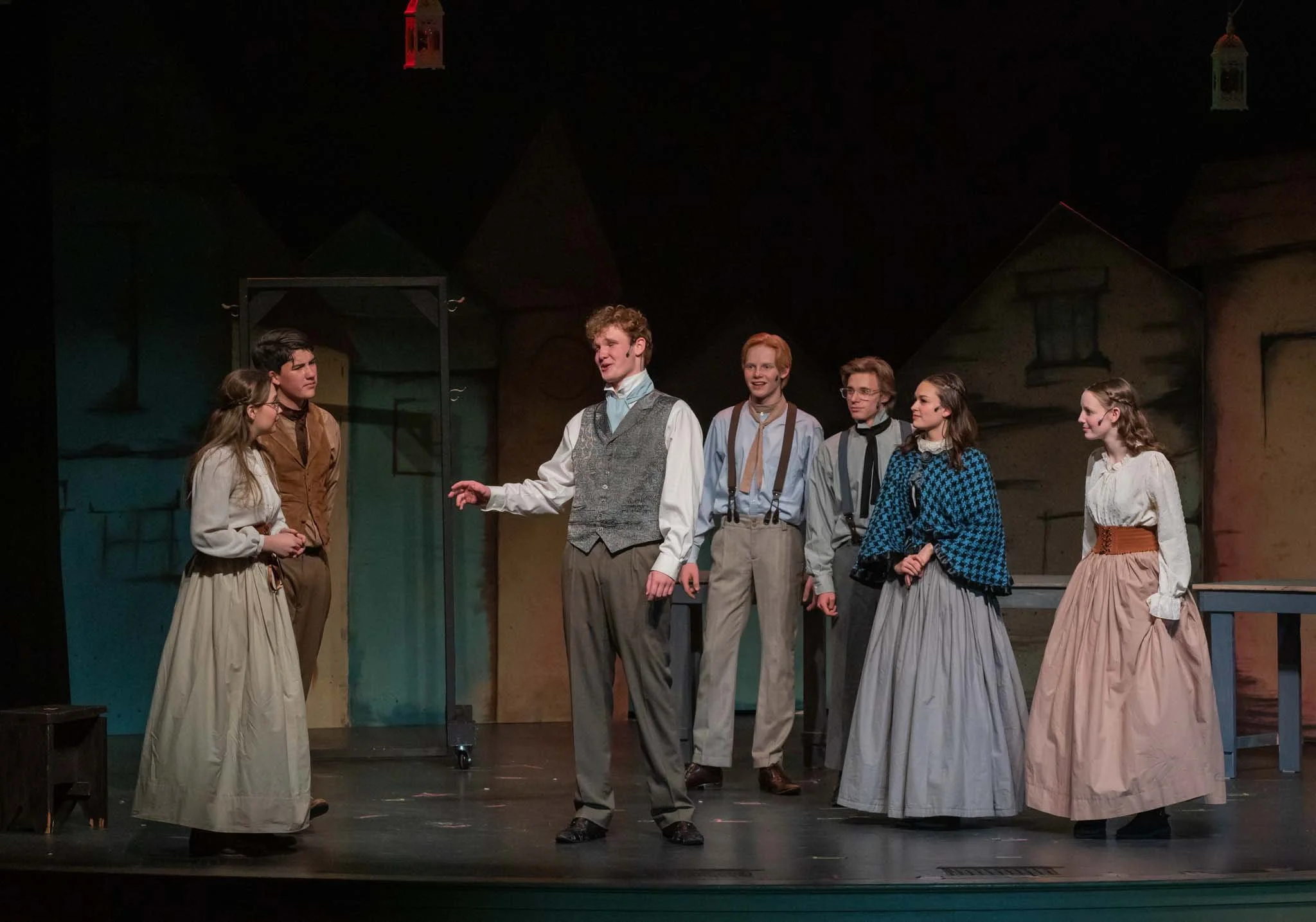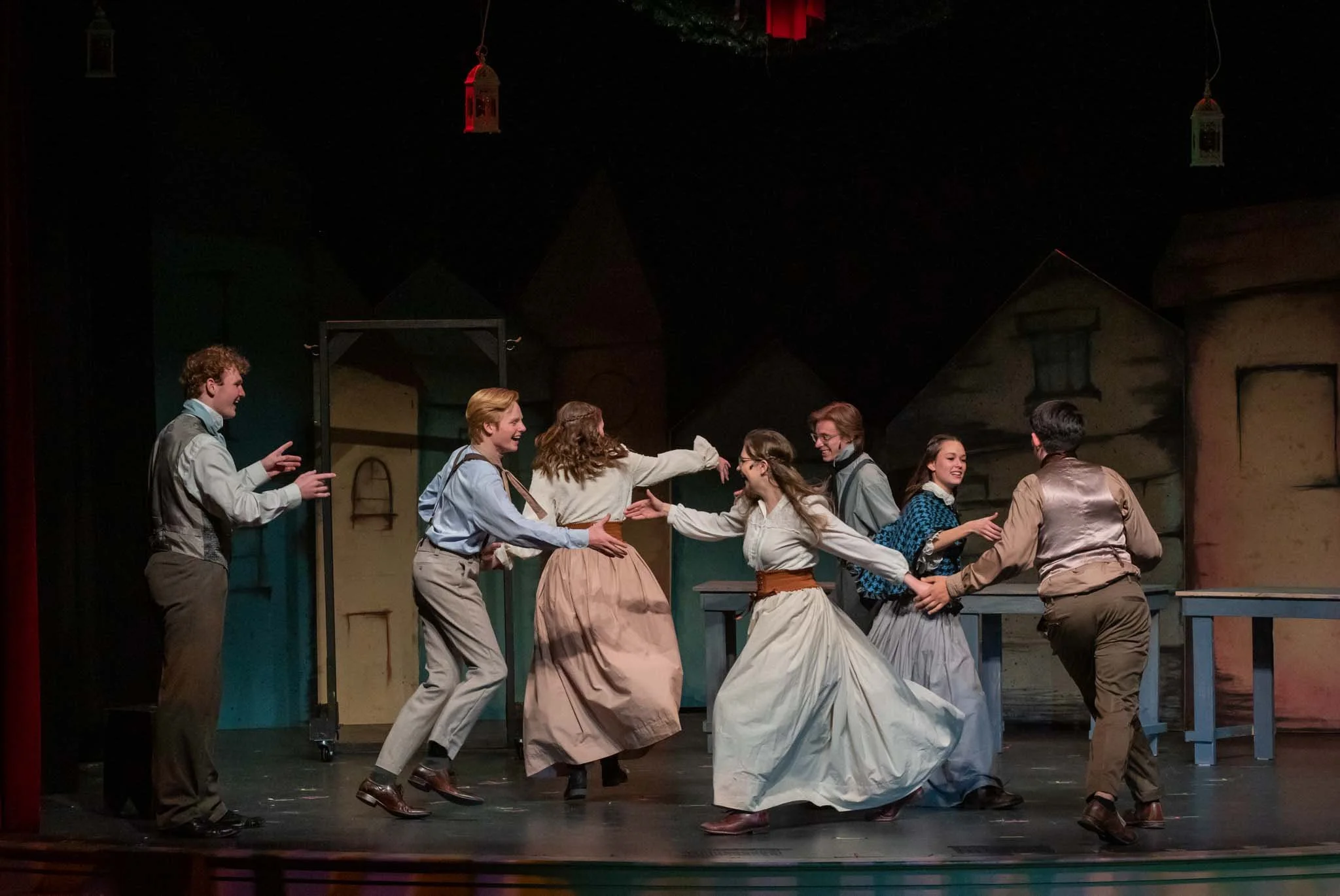 A group of seven actors performing a musical on stage, dressed in period costumes with a town scene backdrop. They are dancing in choreographed positions.