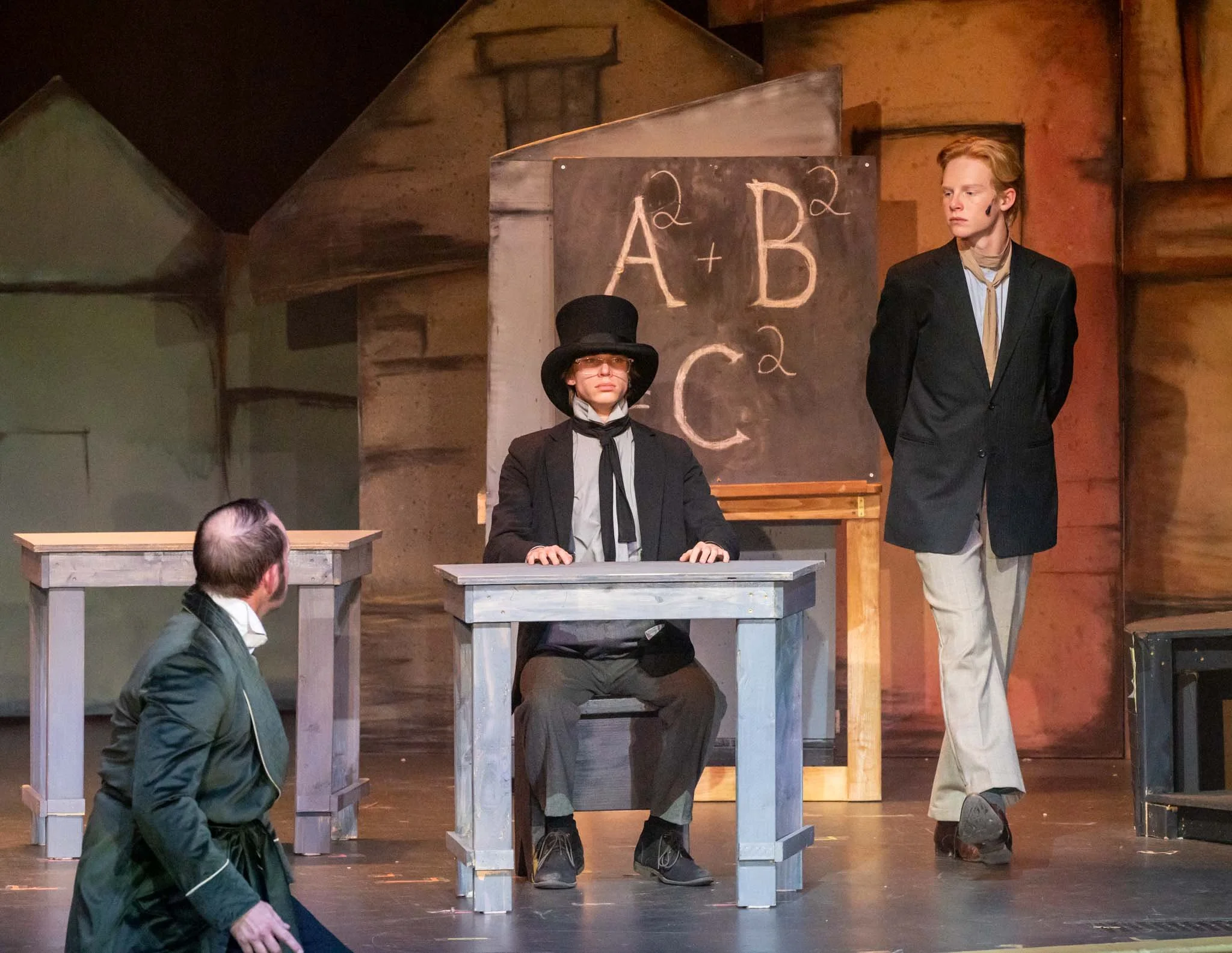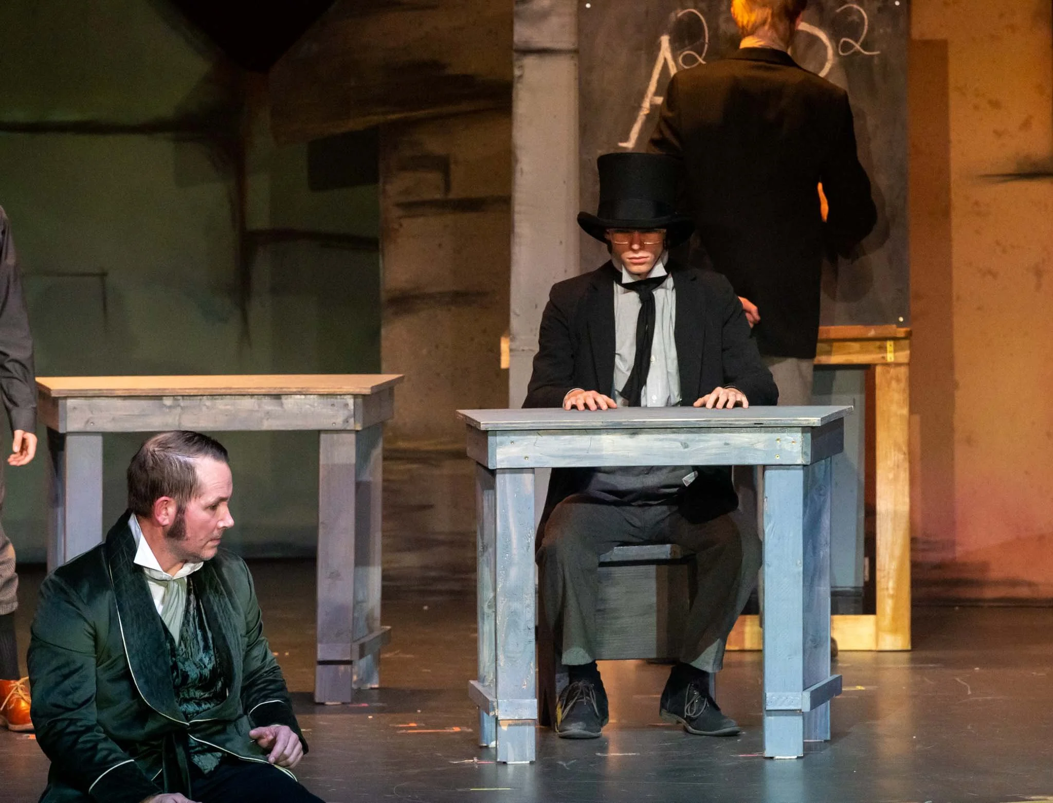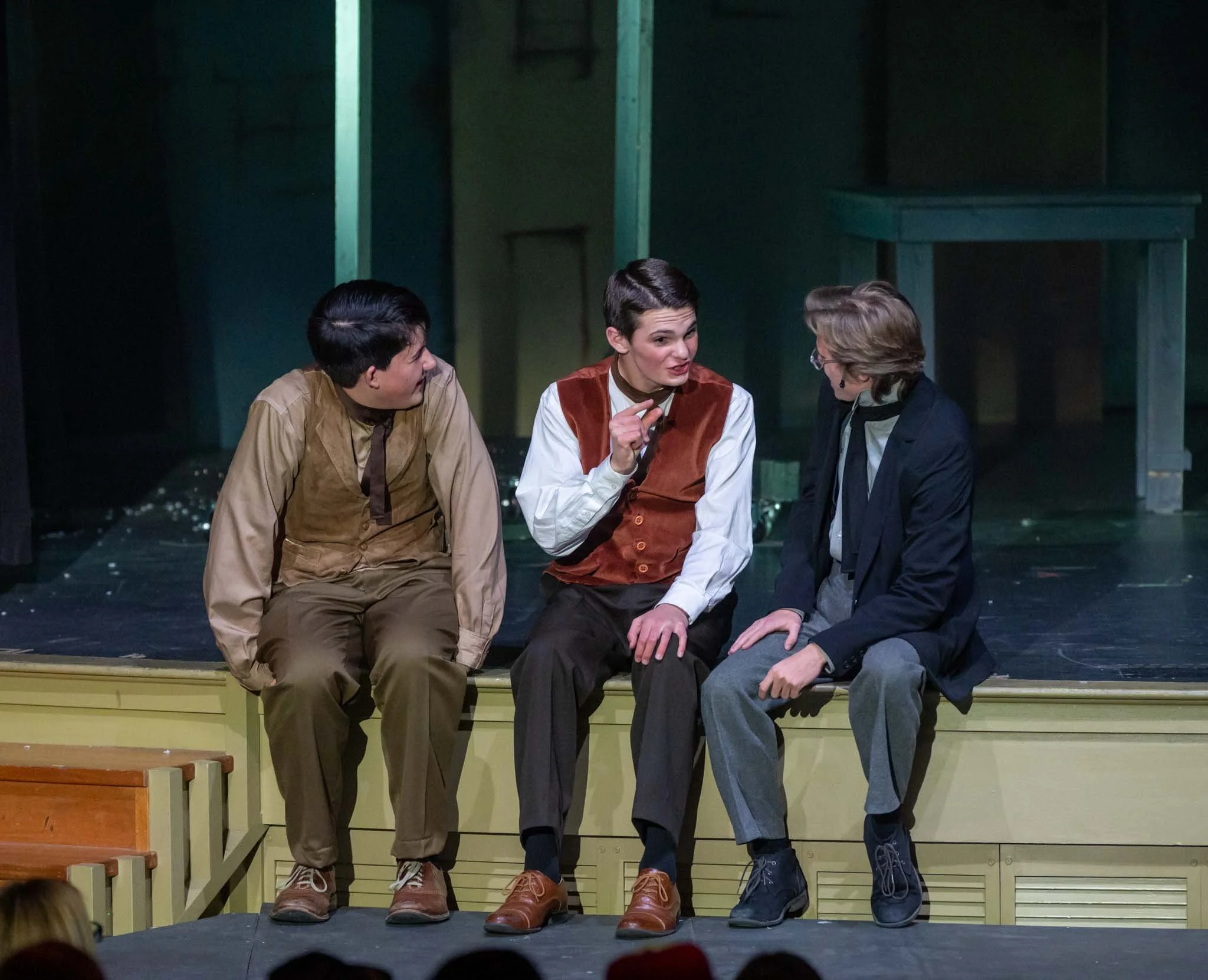 Three young males in a theatrical performance. One is sitting on stairs in casual attire, another standing near a wooden handrail wearing vintage-style clothing and a hat, and the third sitting with arms on a desk on stage dressed formally.
