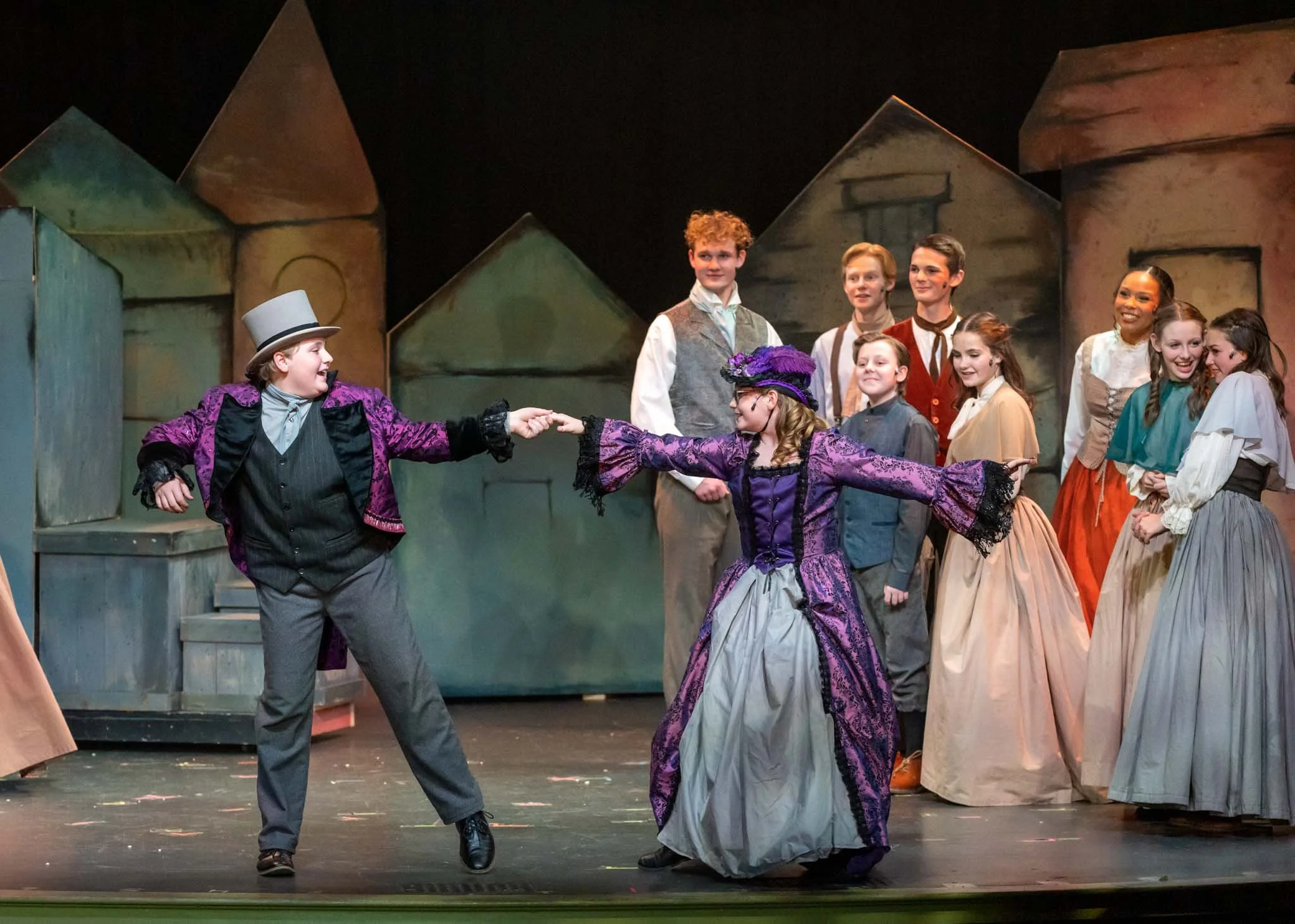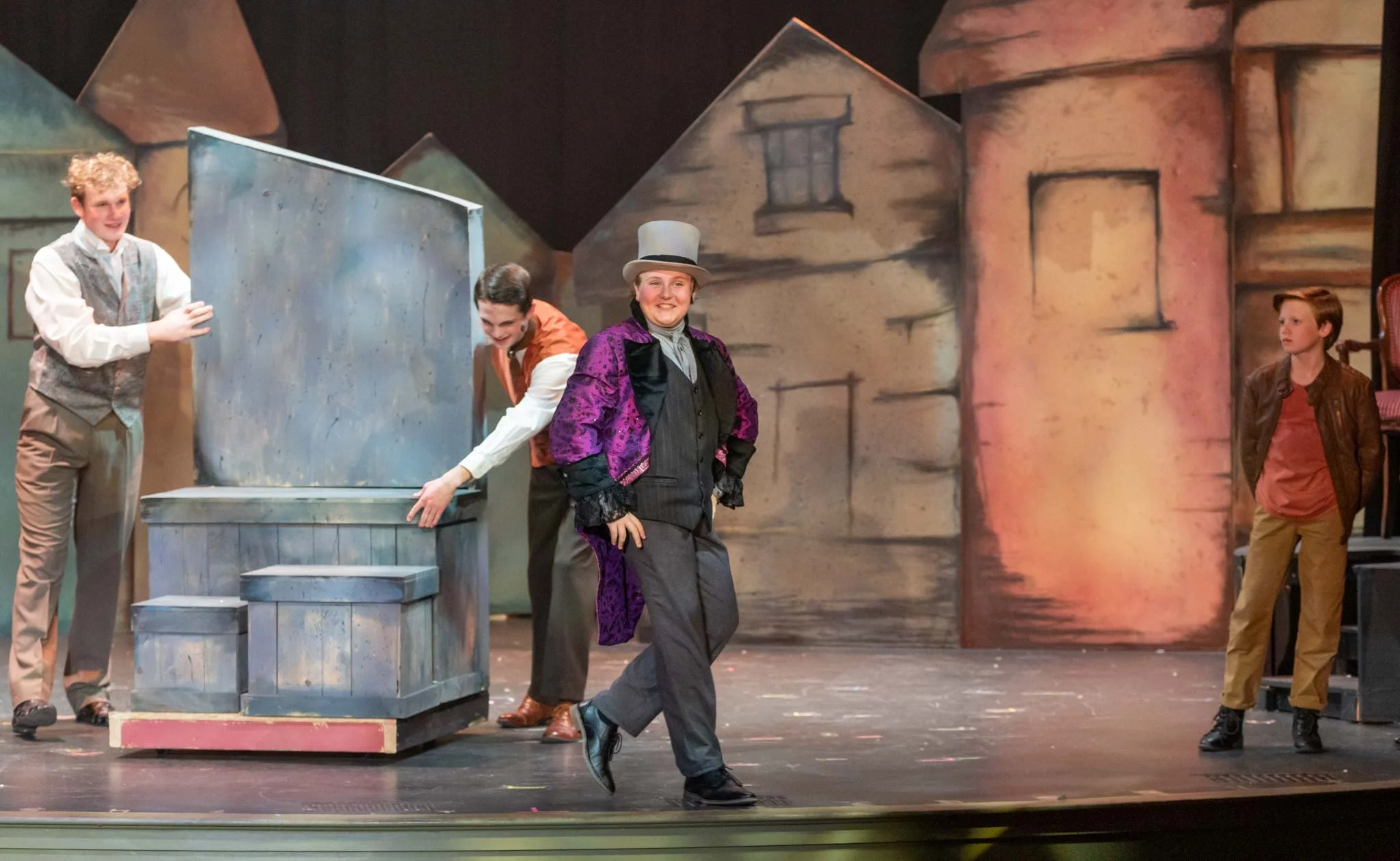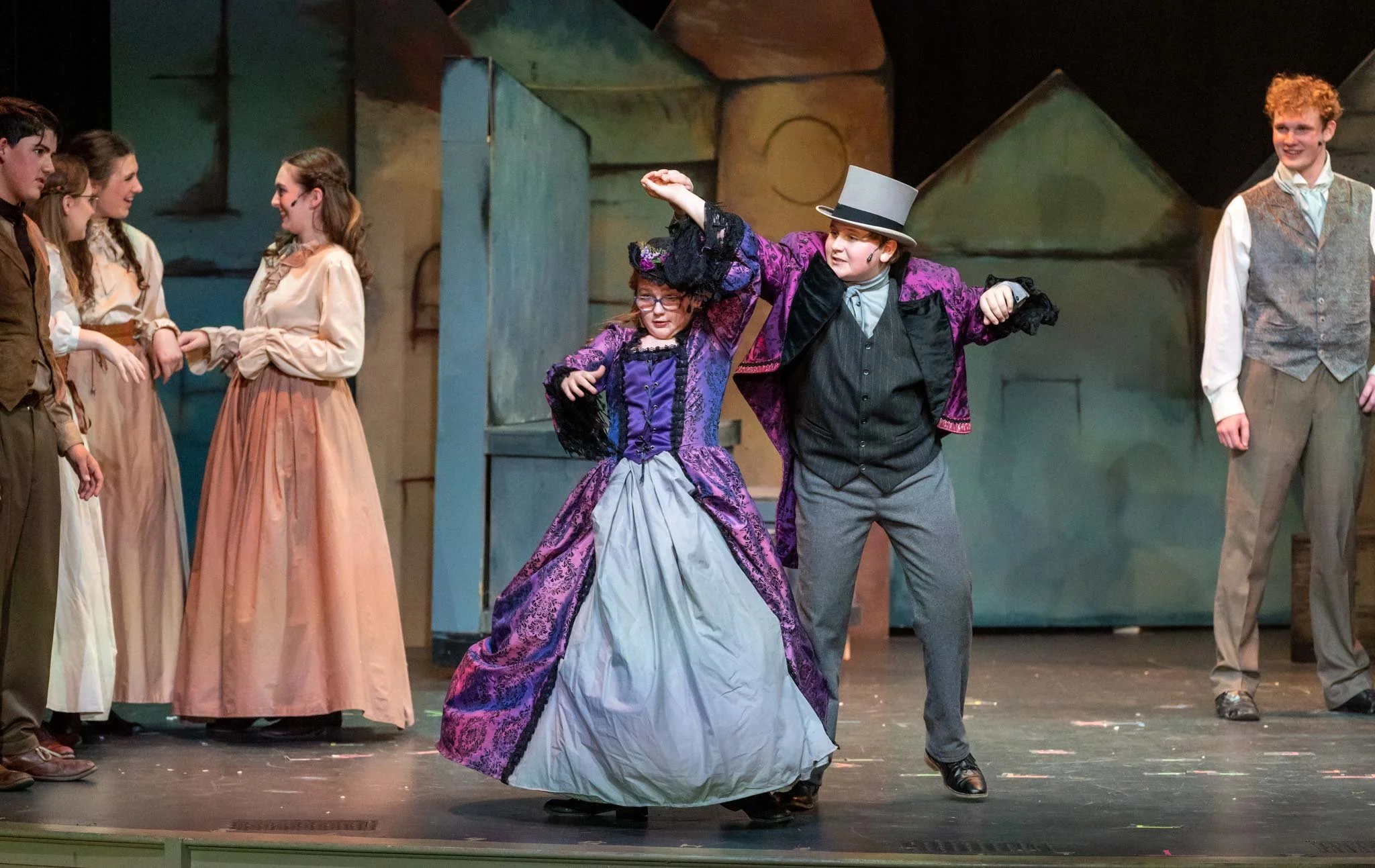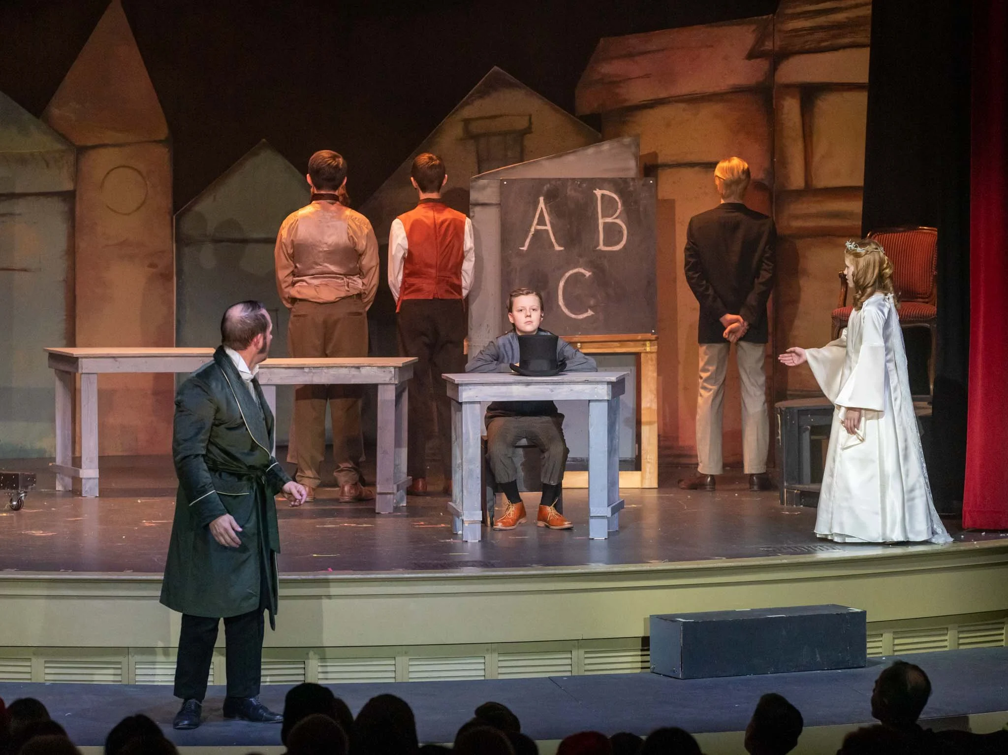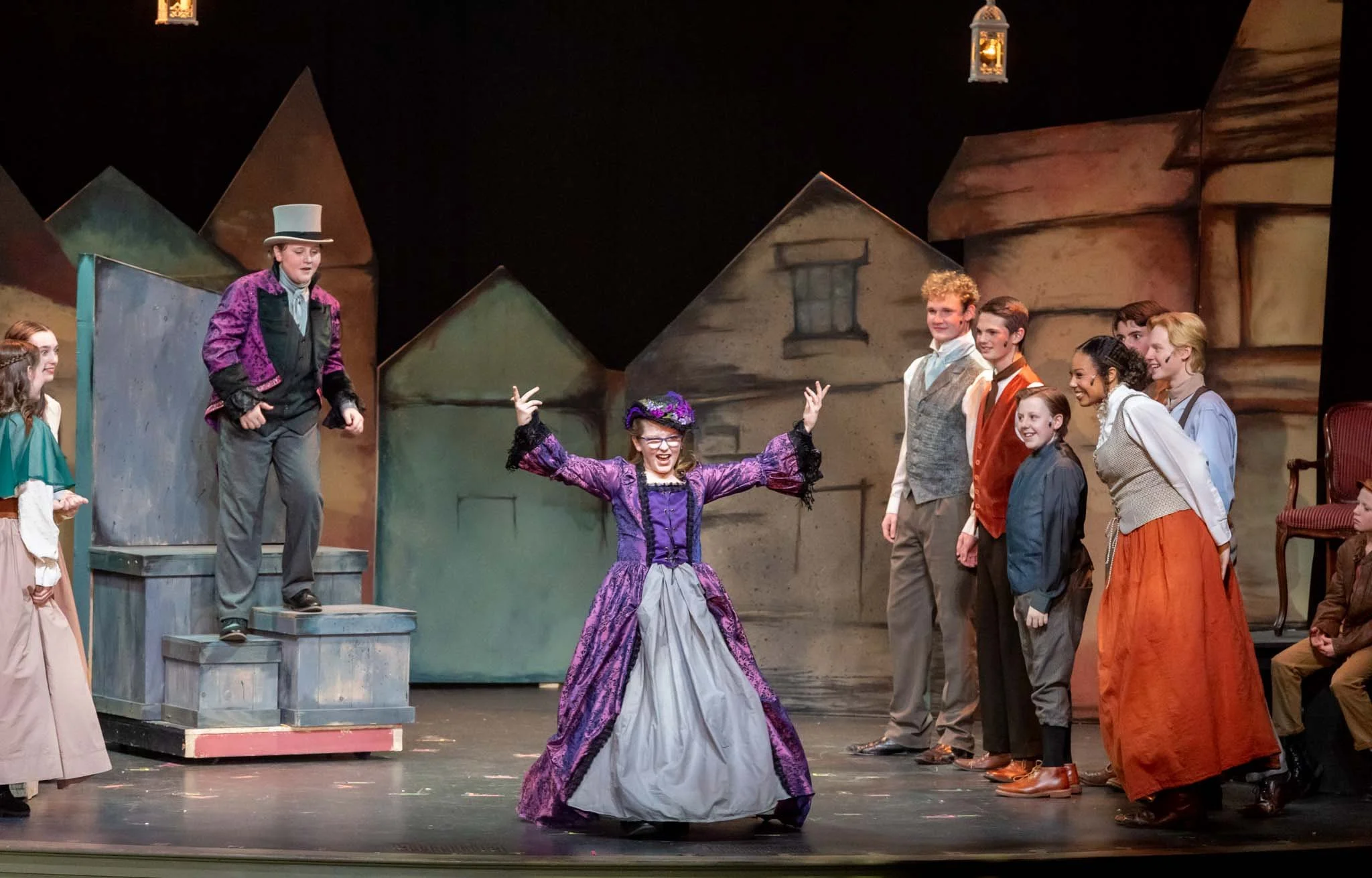 Children performing on stage in a theatrical play, dressed in period costumes, with a man in a top hat and cape in the foreground, set against a backdrop of painted buildings and hanging lanterns.