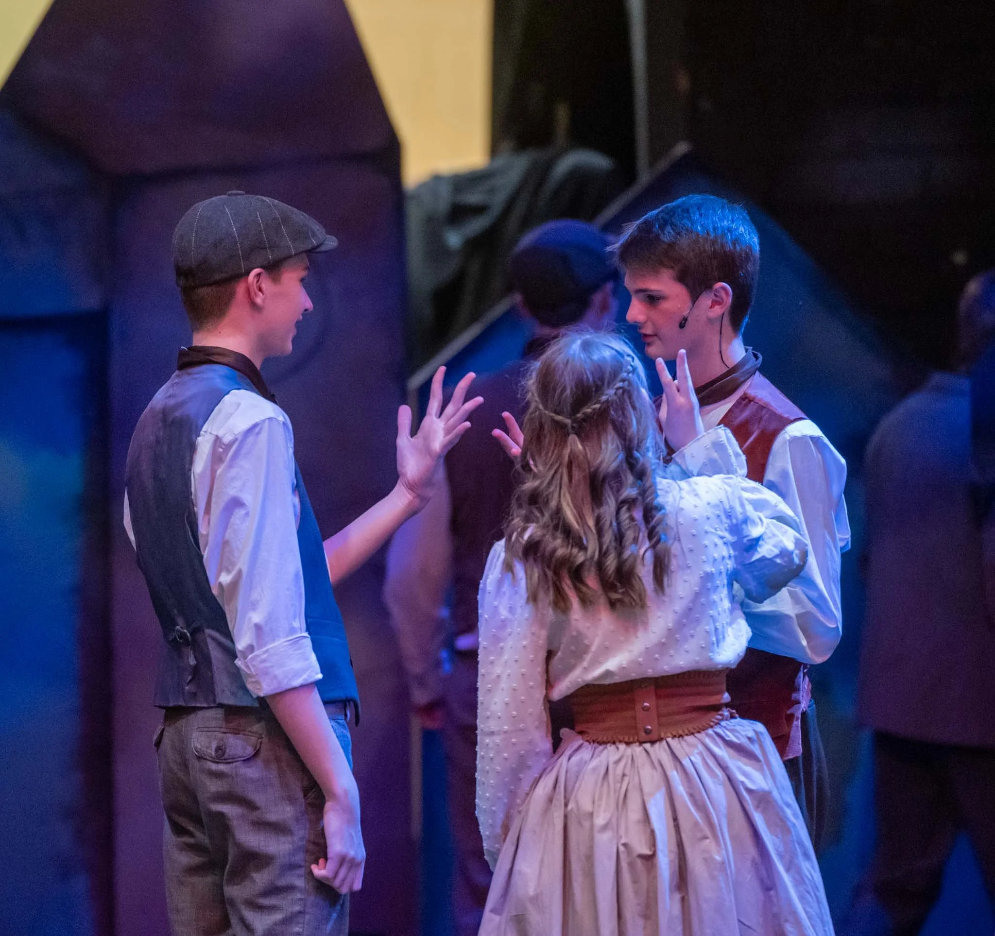 Young actors on stage performing a theatrical scene, dressed in period costumes, with expressive gestures and animated expressions.