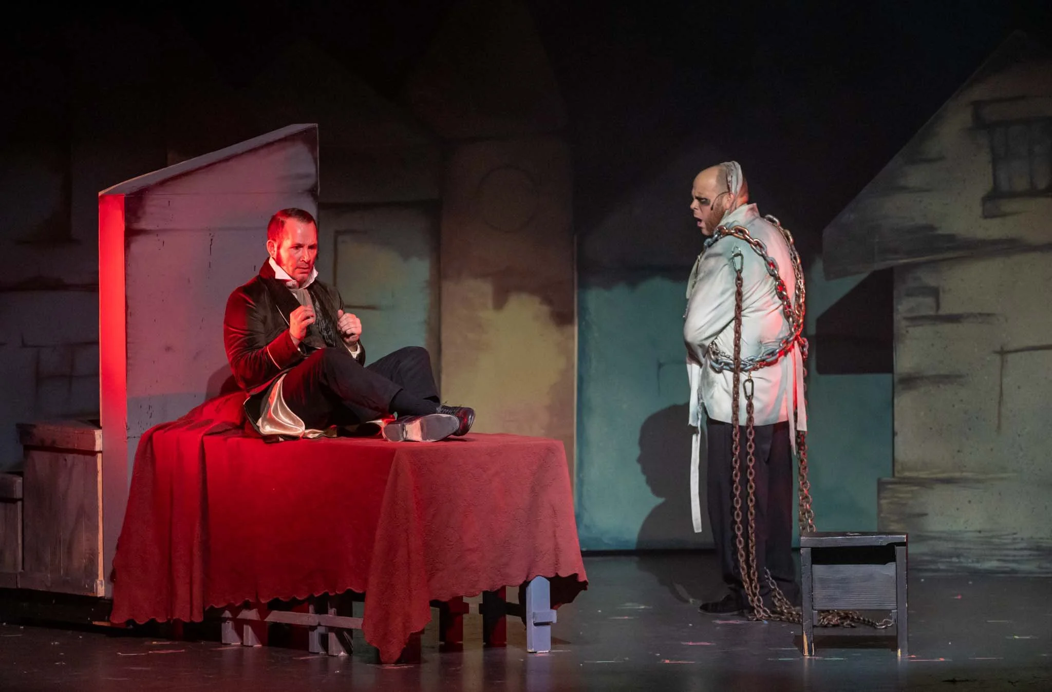 A theatrical stage scene with three performers, including a man in period costume in the center, standing on the right side near red curtains, and another man holding a bowler hat on the left side, all under blue stage lighting.