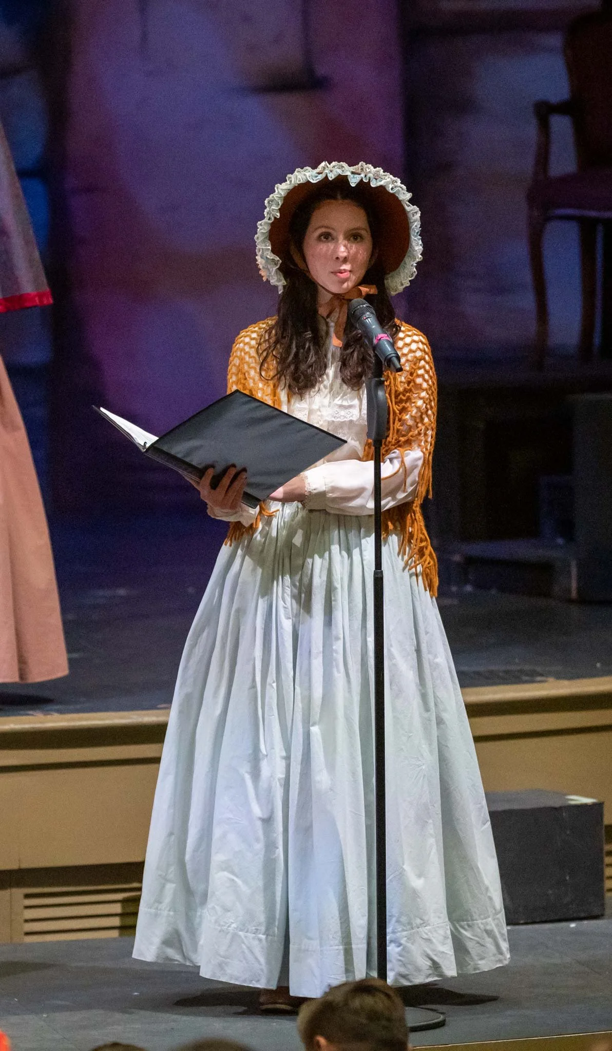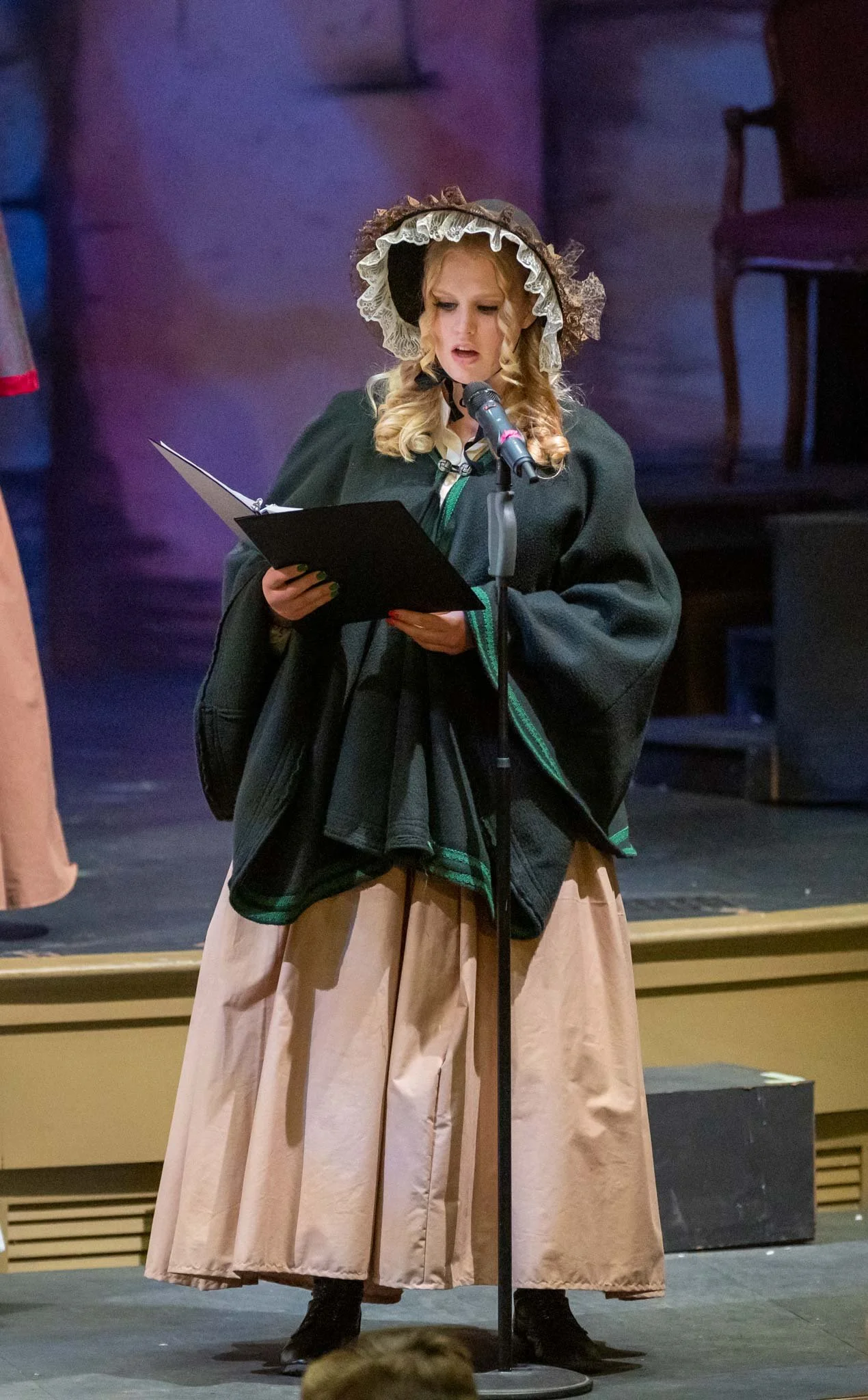 A woman dressed in historical clothing, wearing a bonnet, standing on stage in front of a microphone, holding a script or book, possibly performing in a play or reenactment.
