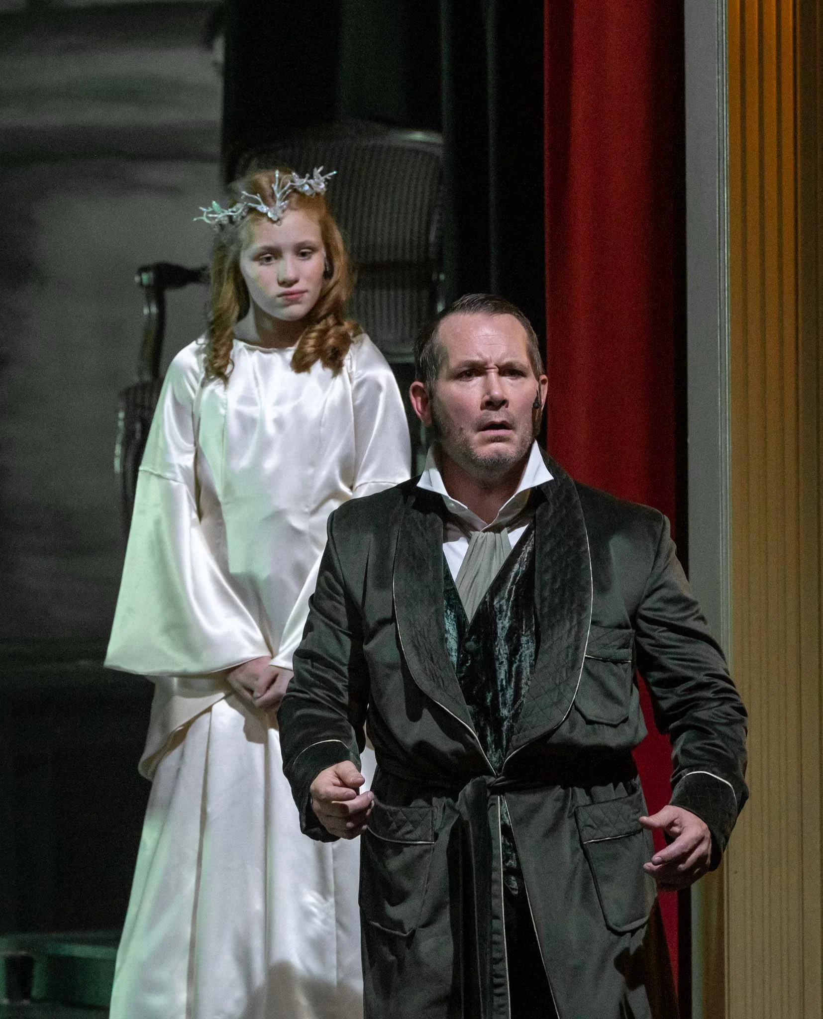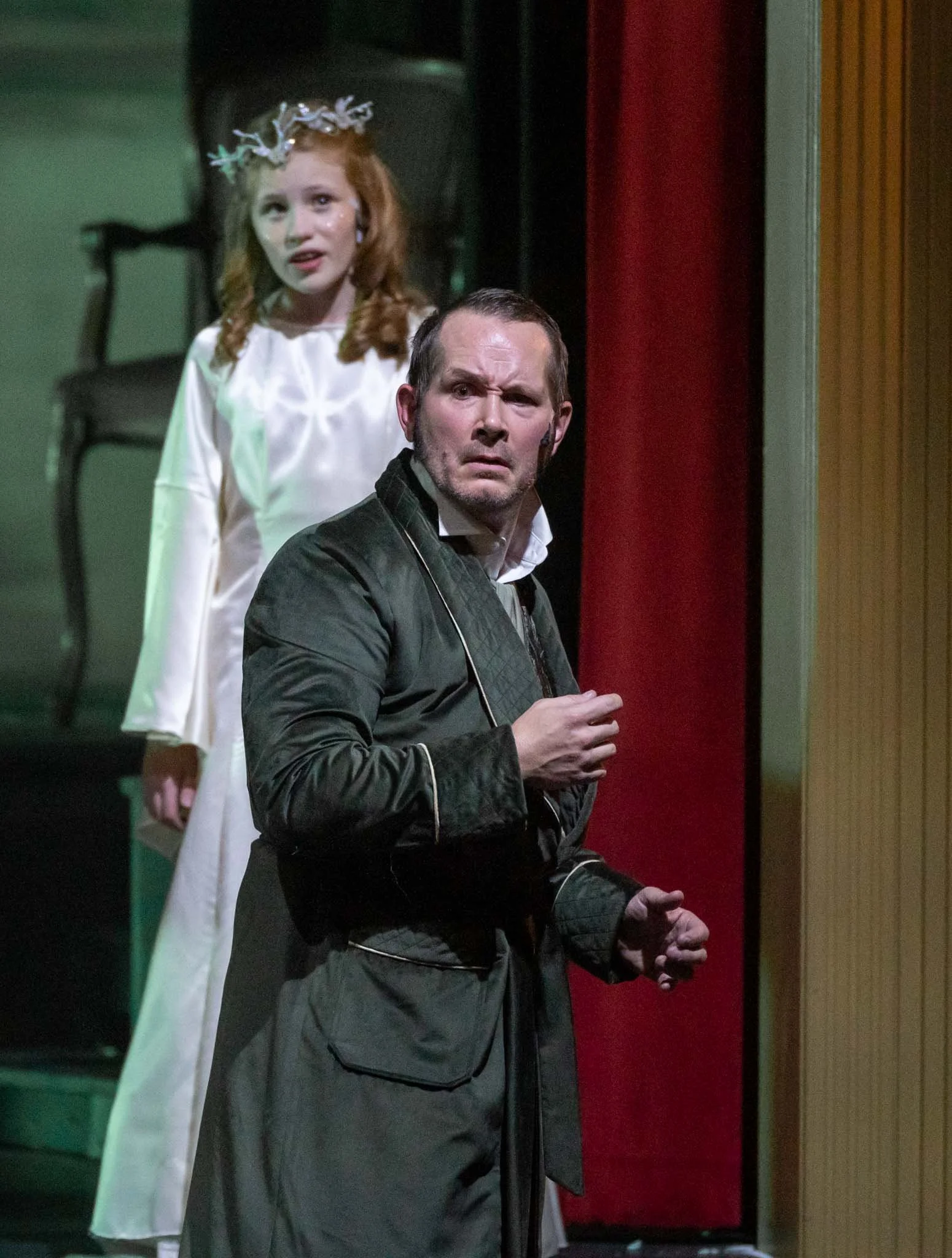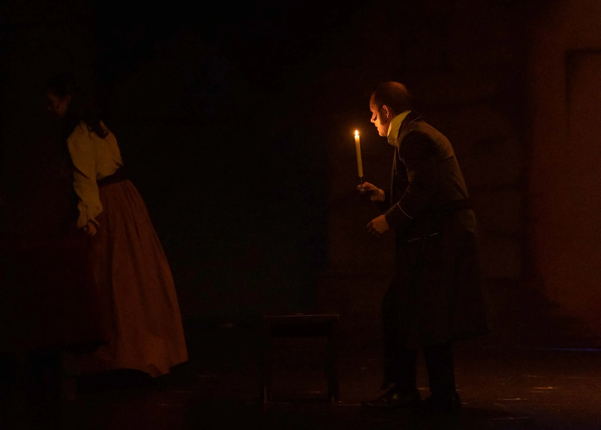 Two actors perform on stage; a young woman with long, wavy hair, wearing a green and beige period costume, is singing or speaking passionately, while a man in dark clothing with face makeup and a serious expression listens attentively.