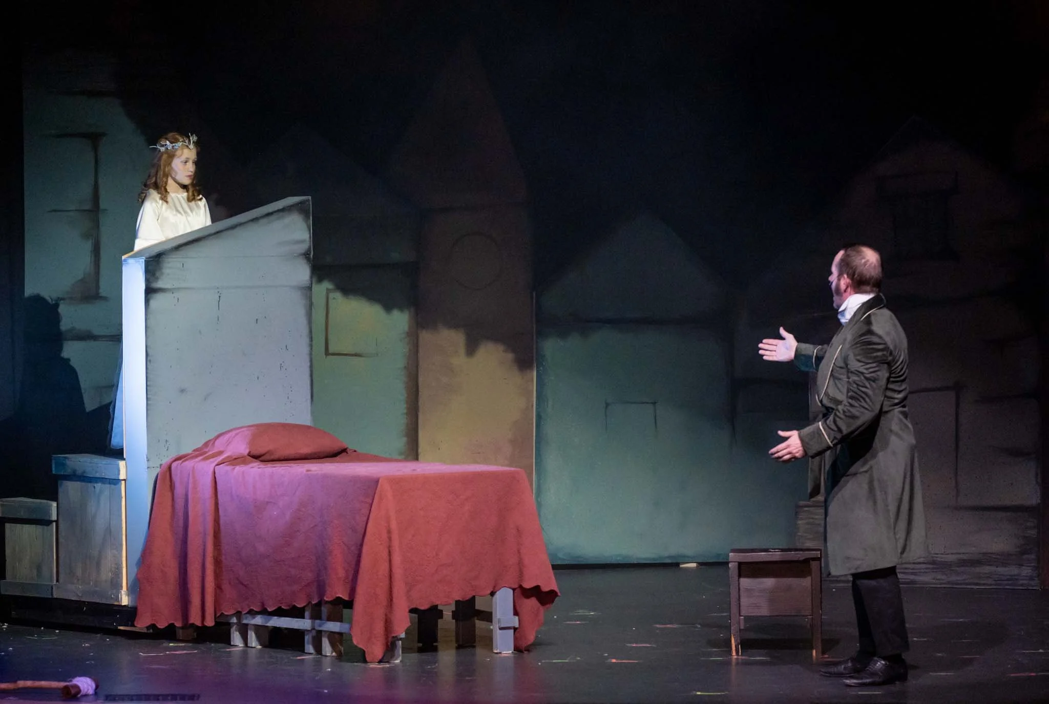 A theatrical stage with painted backdrop of buildings, featuring a man sitting on the edge of the stage holding a hat and looking down, and a woman standing in a long white dress with a crown of branches, both appearing in a dramatic scene.