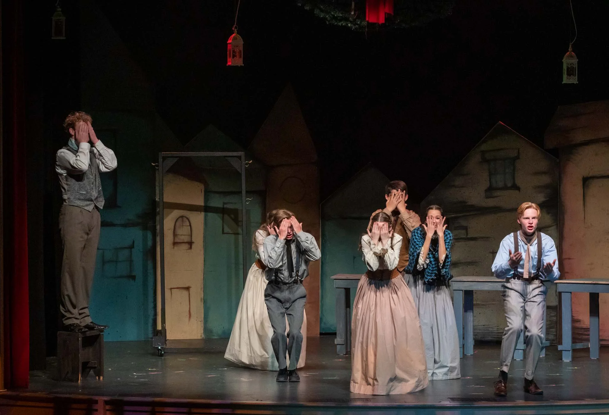 A group of seven actors on a stage, performing in a play with a set designed to look like a small town. Six actors are covering their eyes or faces with their hands, while one actor in front appears to be speaking or singing with gestures.