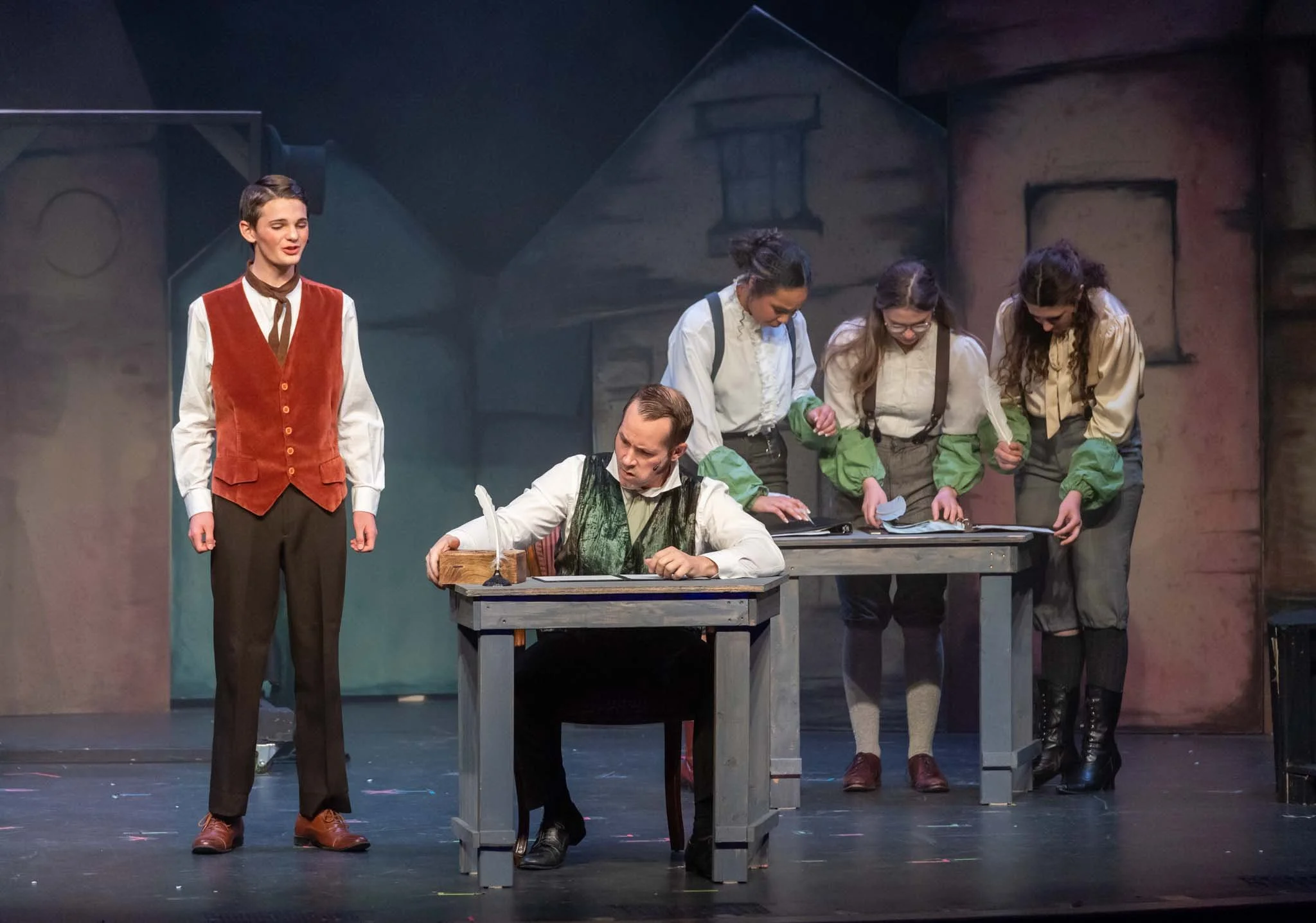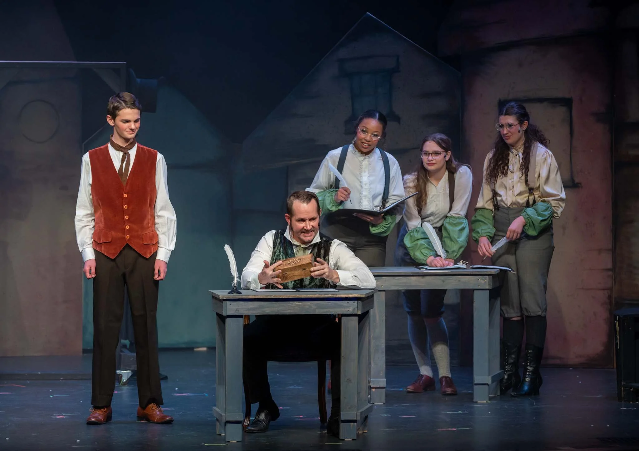 Theater scene with five young actors on stage, three girls standing in a row and two men positioned at a desk, one of whom is writing. The backdrop depicts a nighttime scene of a small village.