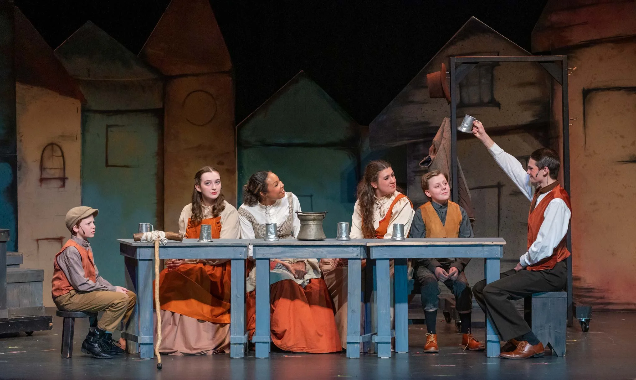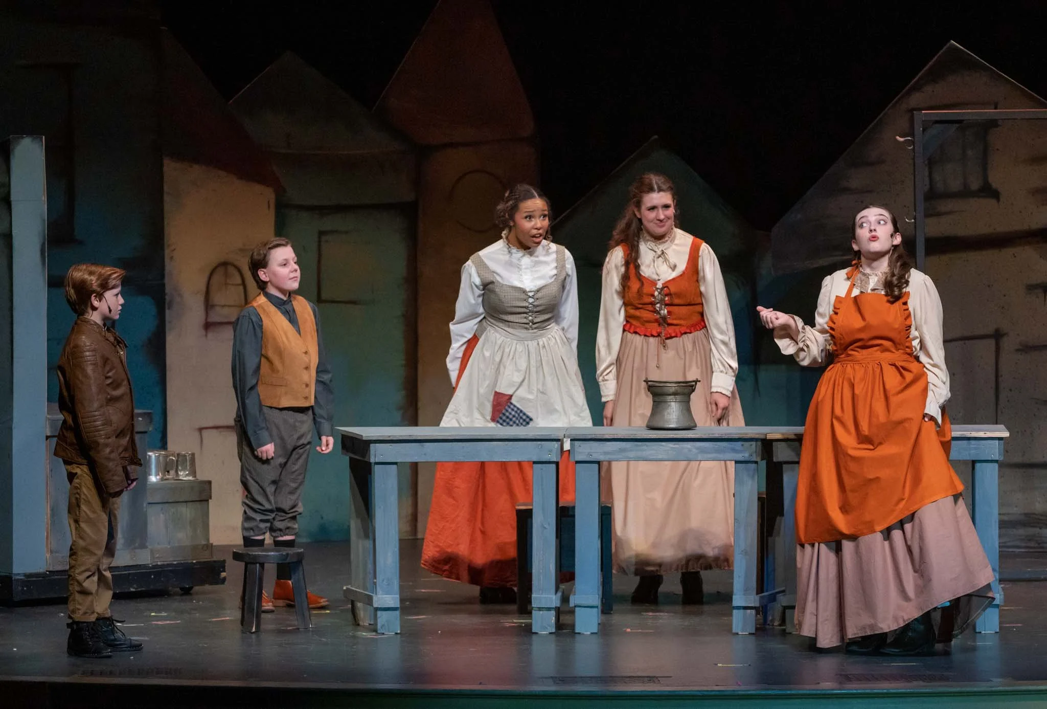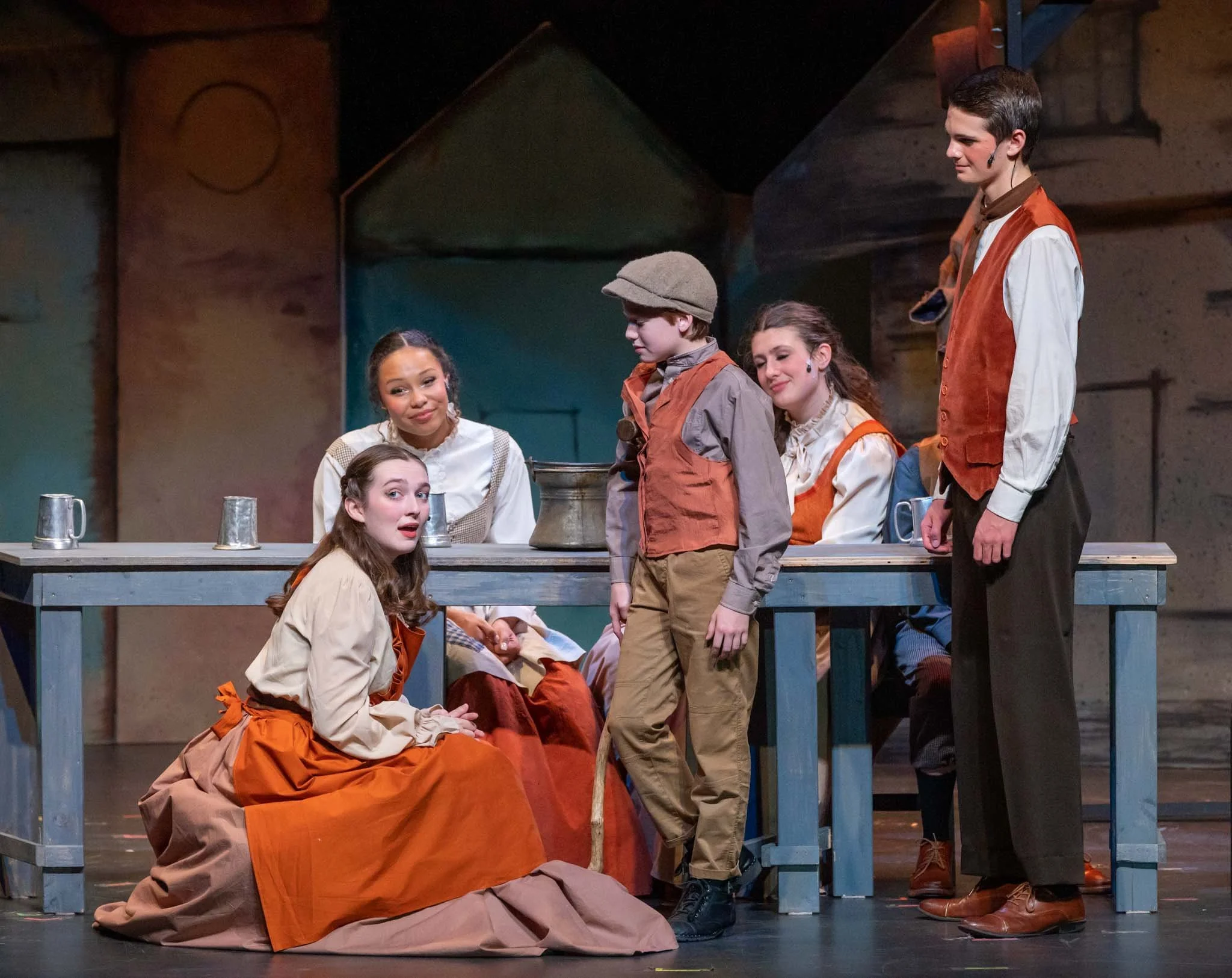 Theatrical scene with five young actors in period costumes on stage, one girl holding a cane and comforting a young boy, others seated or standing around a wooden table with metal cups in the background.