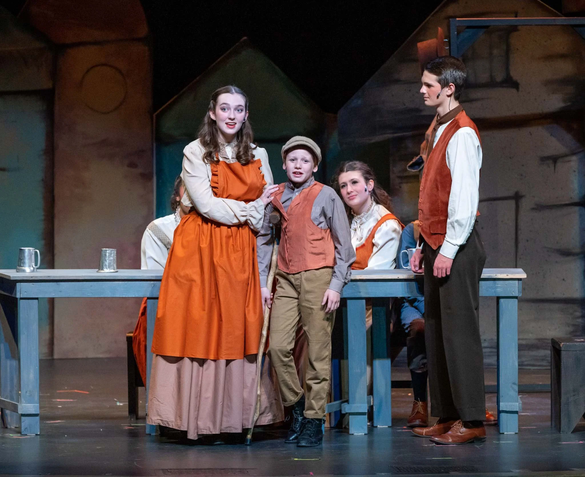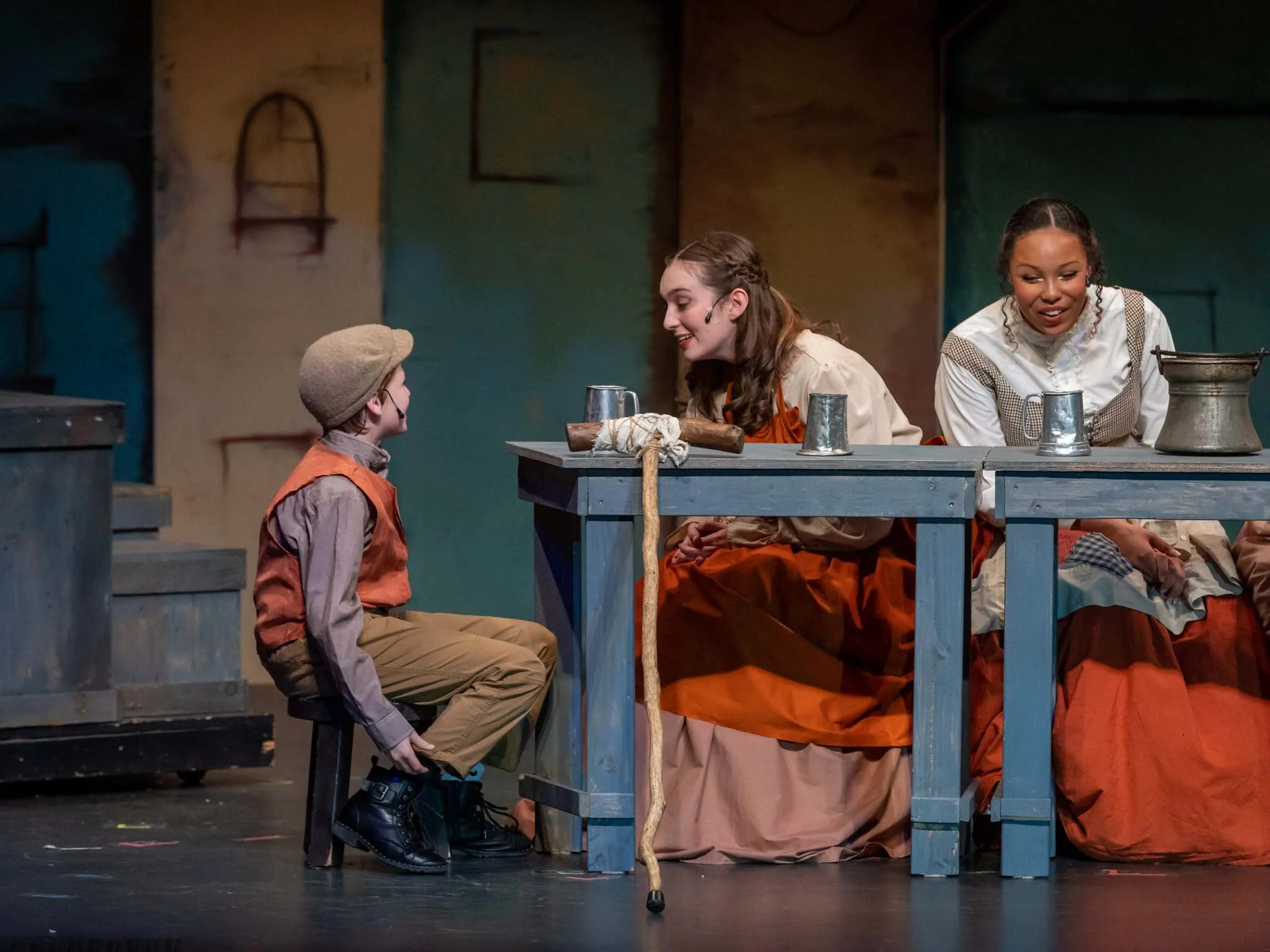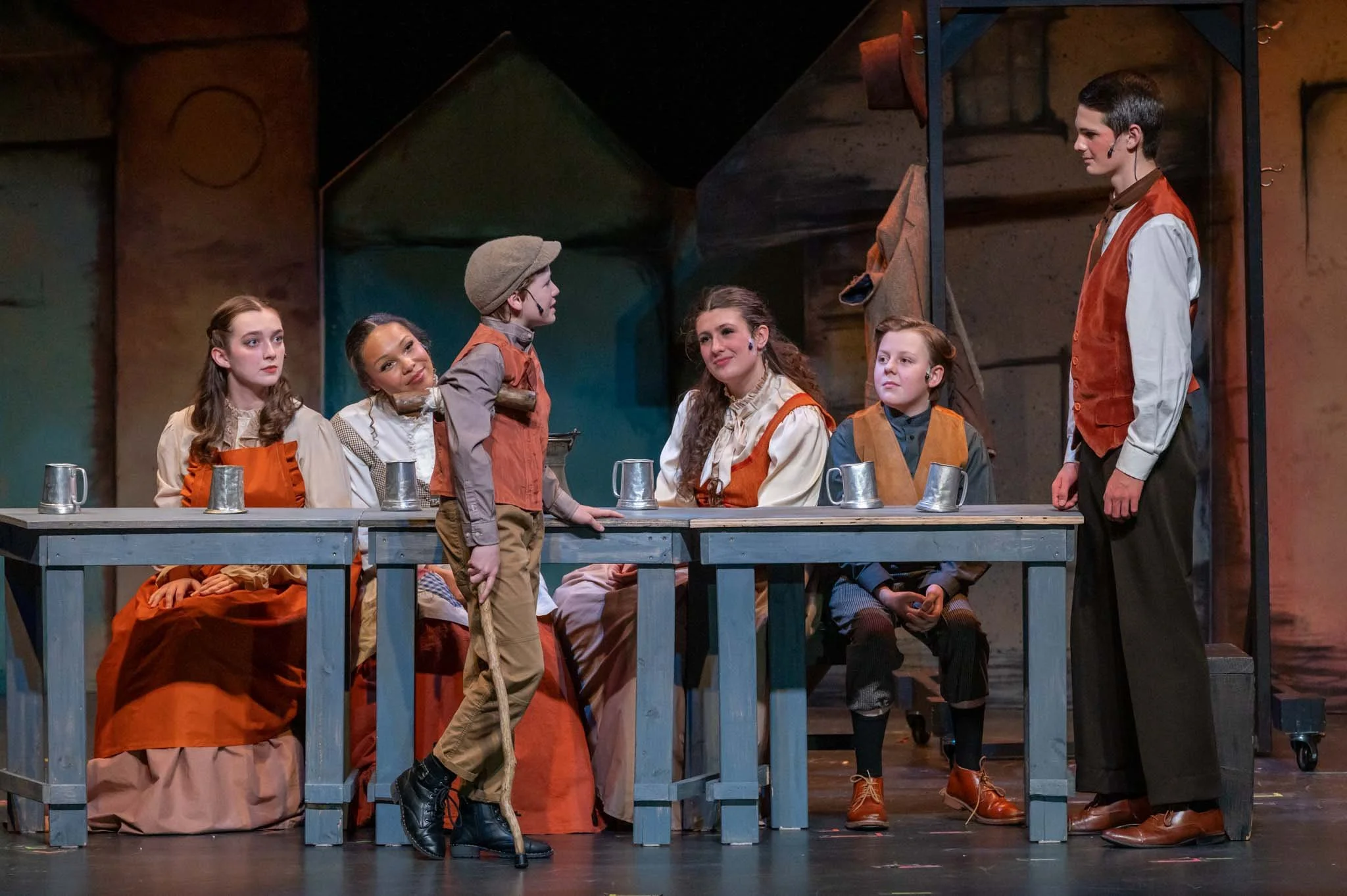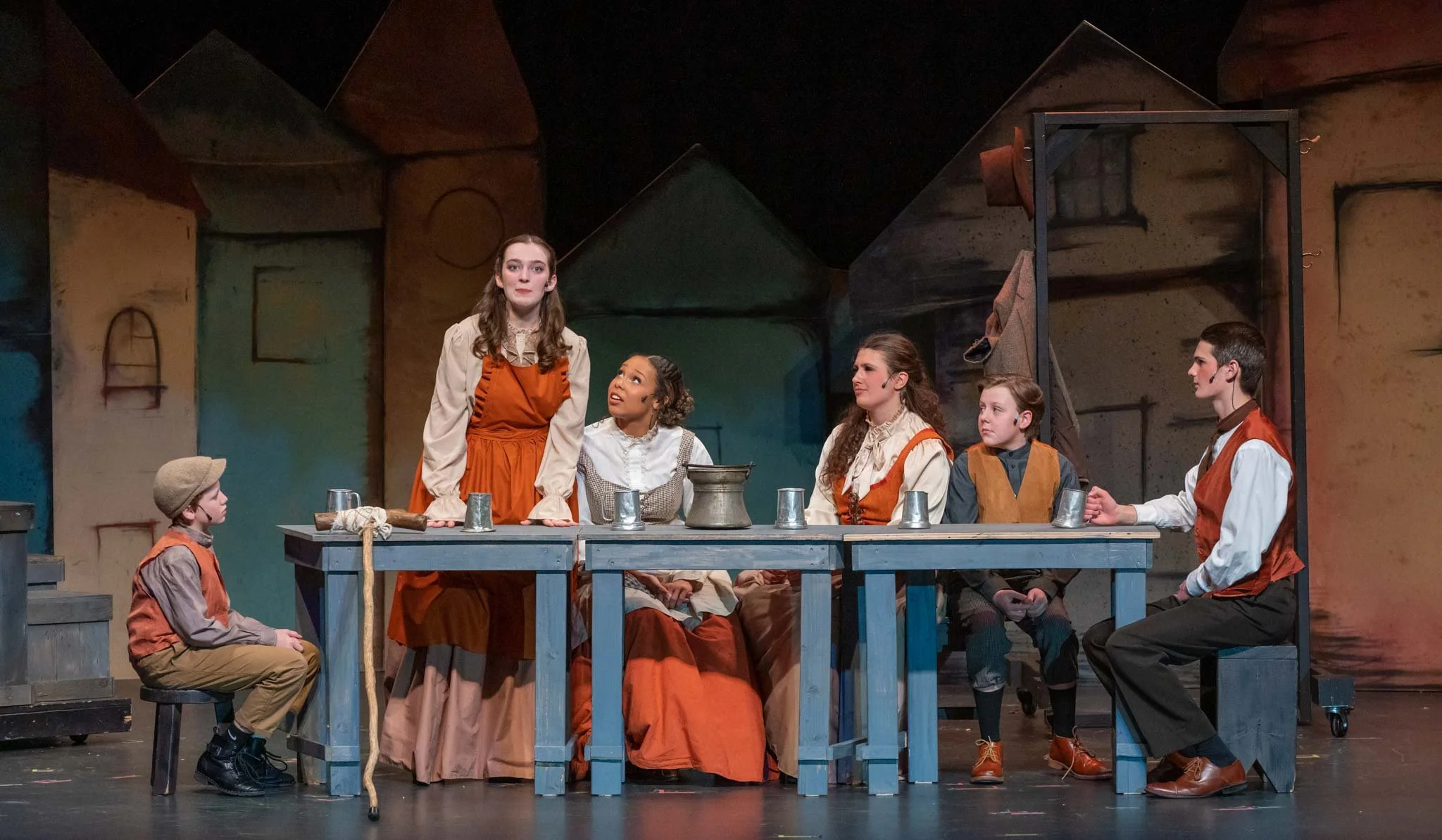 Theatrical scene with five young actors in period costumes on stage, one girl holding a cane and comforting a young boy, others seated or standing around a wooden table with metal cups in the background.