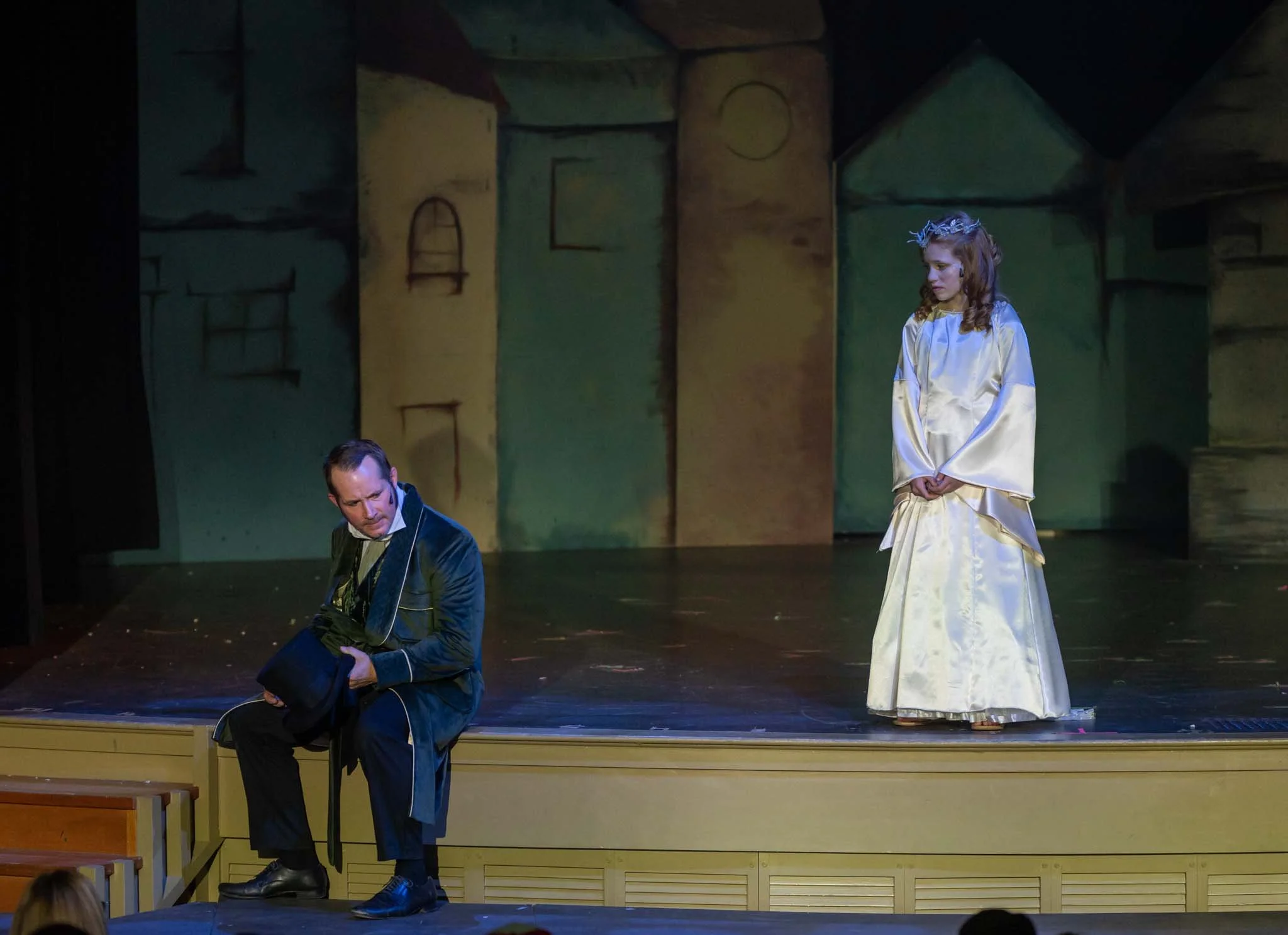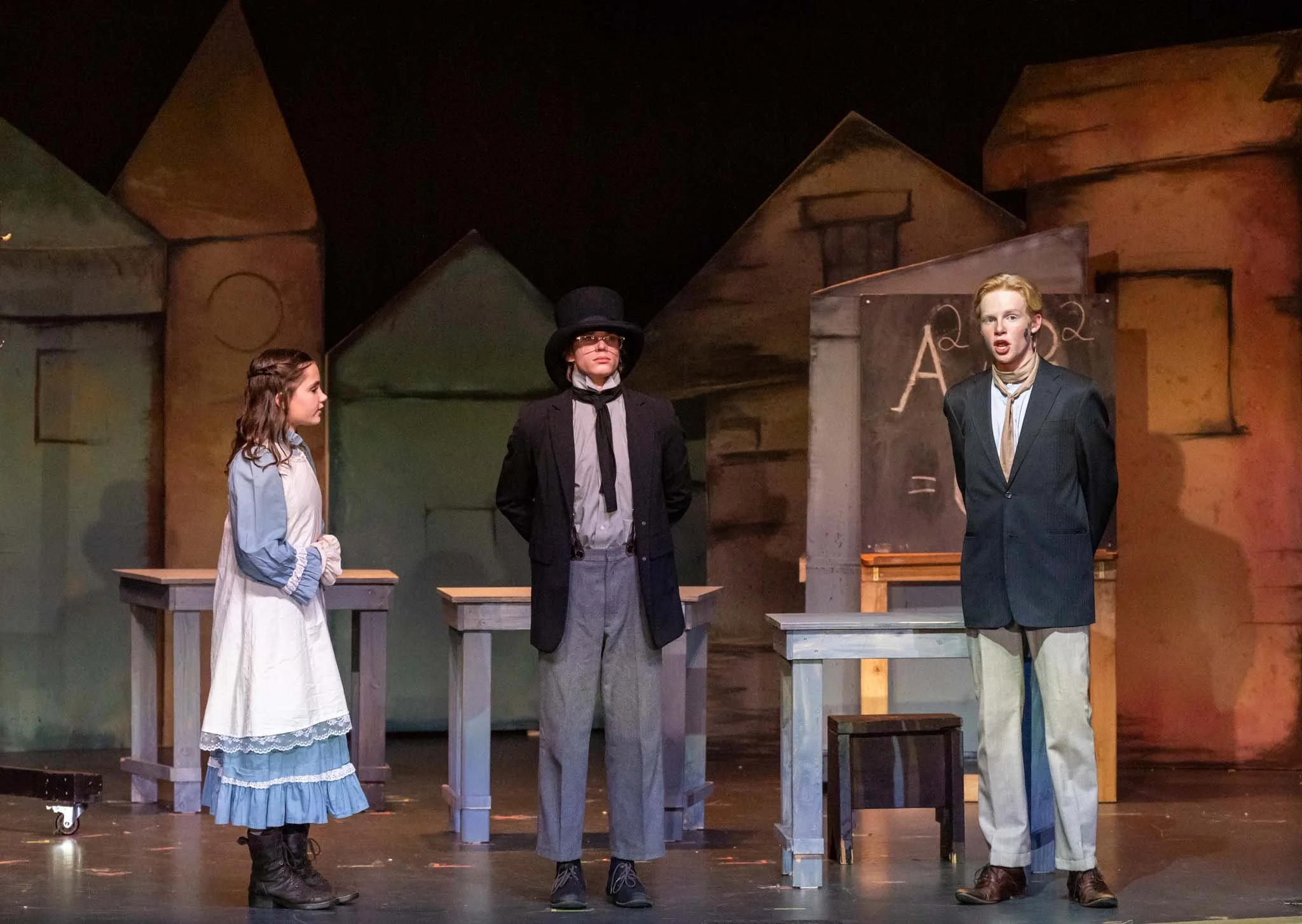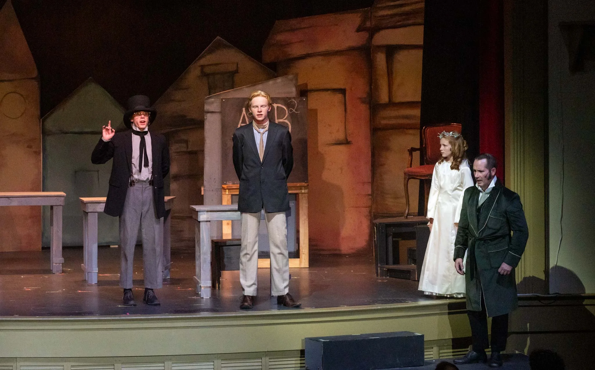 A theatrical stage scene with actors dressed in period costumes, including a man in a suit and hat, and children and teenagers dressed as townspeople, in front of painted backdrops of houses.