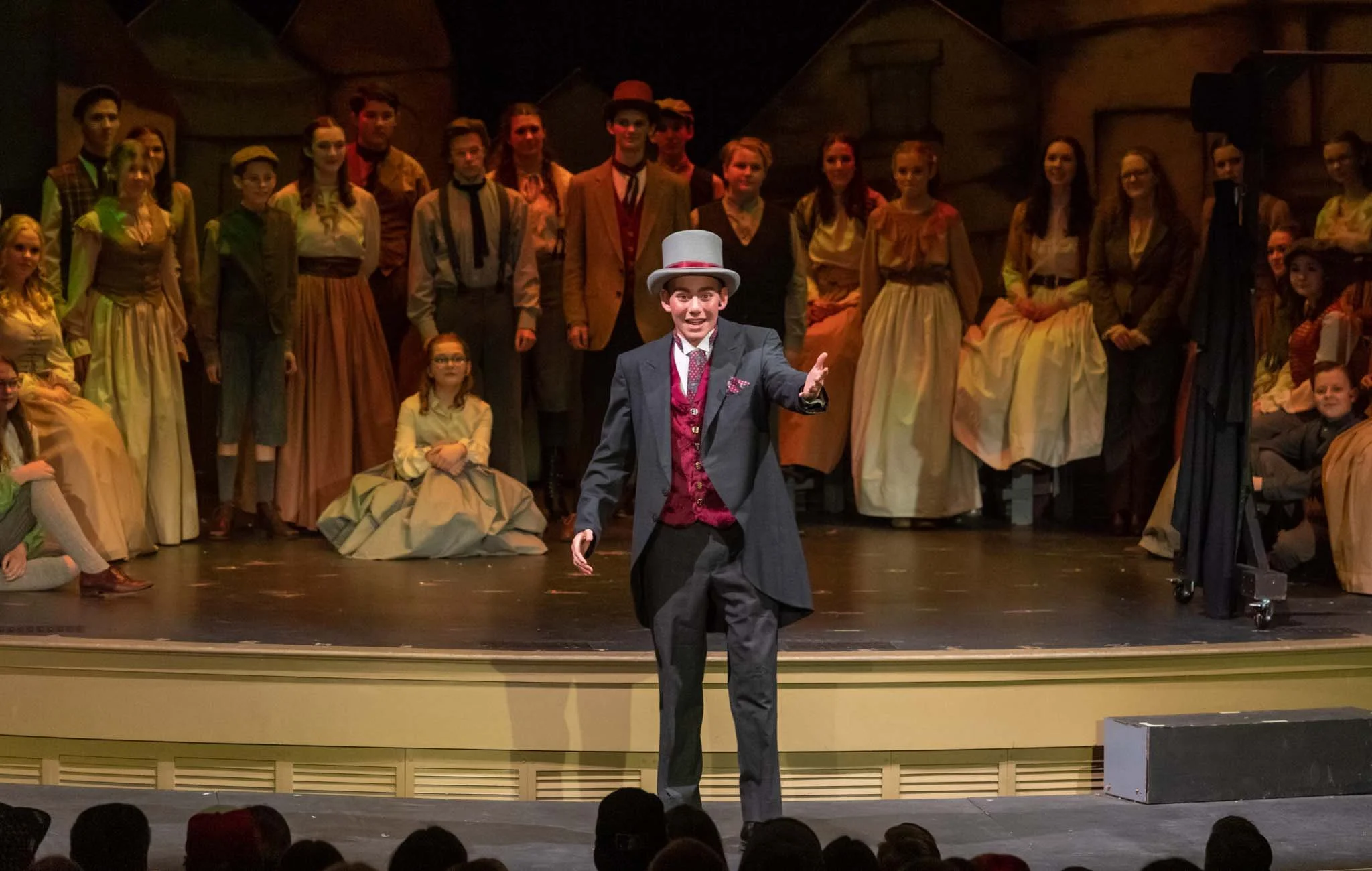 A young actor in a gray suit, red vest, and top hat performs on stage in front of a cast of performers dressed in 19th-century costumes; the scene appears to be from a theatrical production or musical.