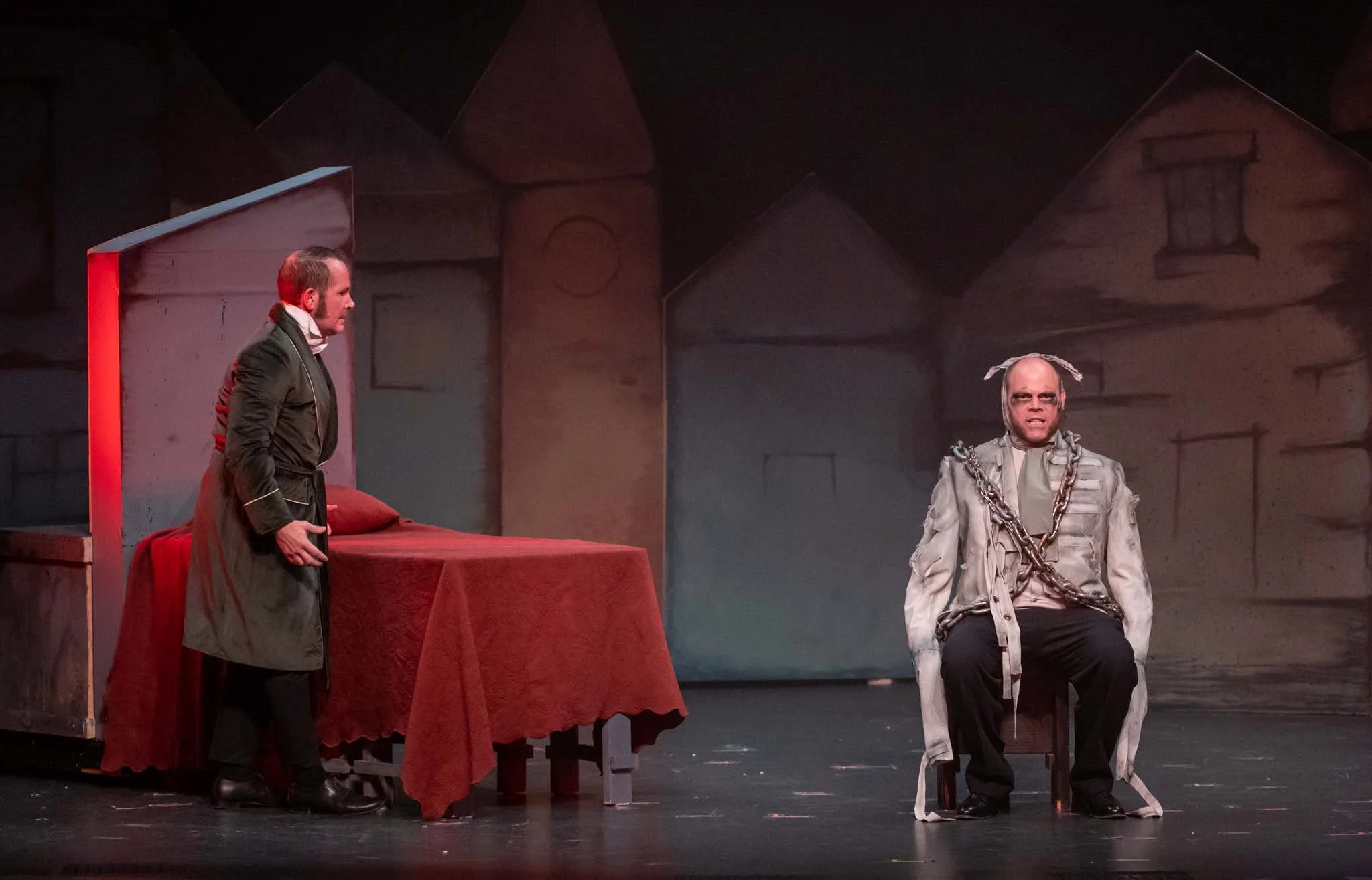 Two actors performing on stage in a theatrical play, with festive costumes and decoration suggesting a holiday theme.