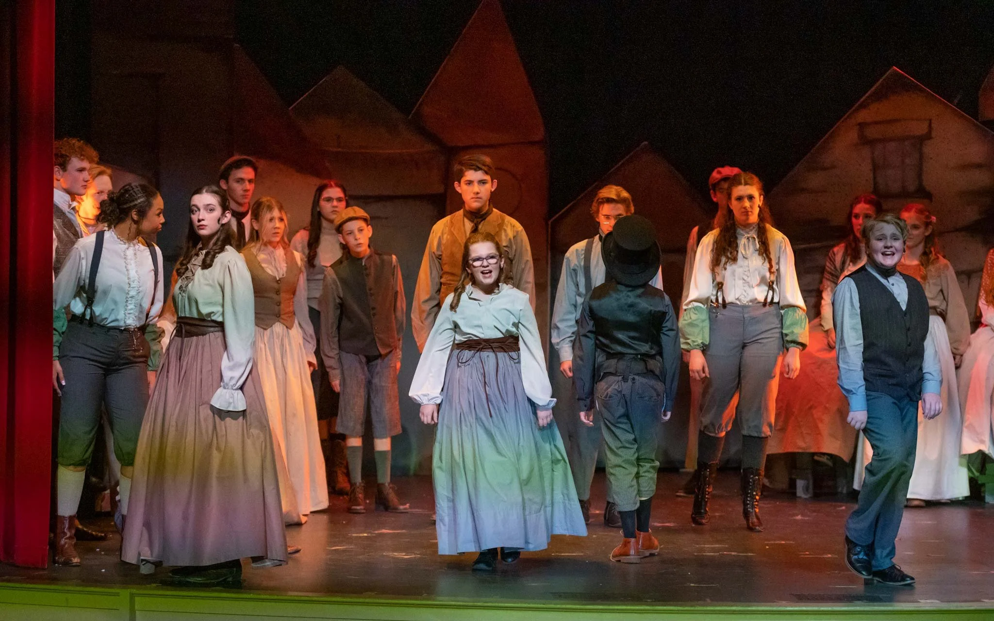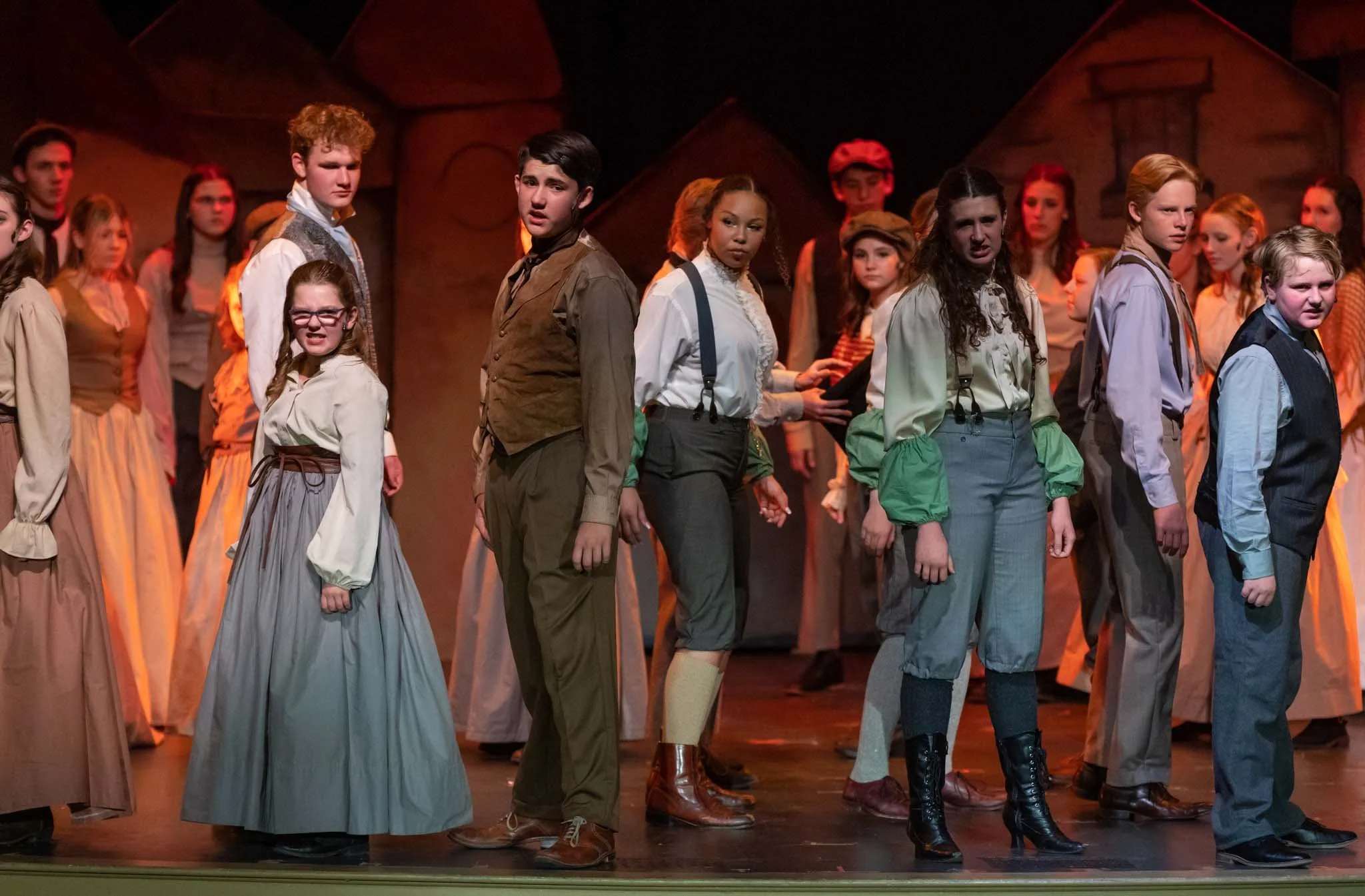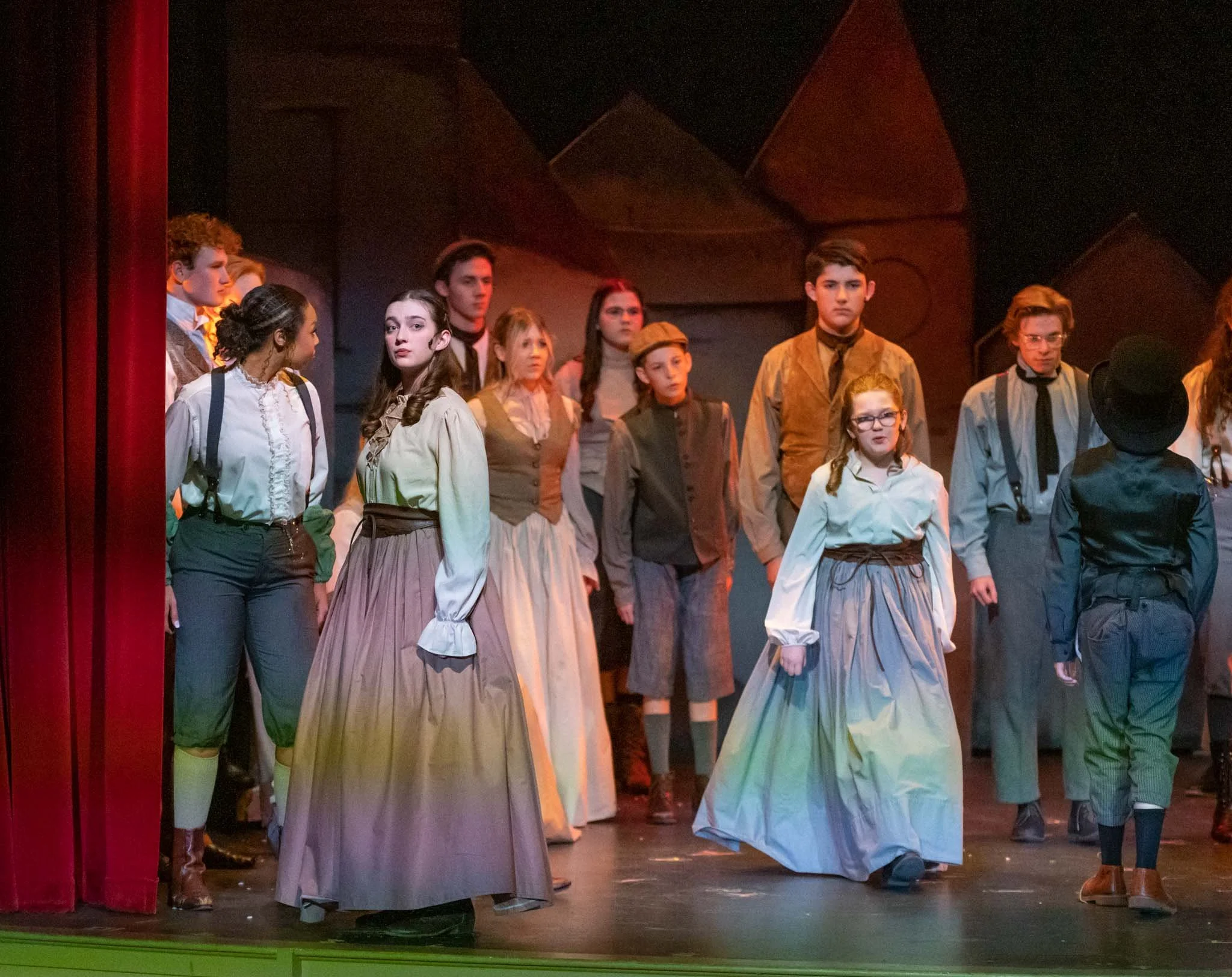 Group of young performers on stage in a theatrical production, dressed in period costumes, with a painted village backdrop and hanging lanterns.