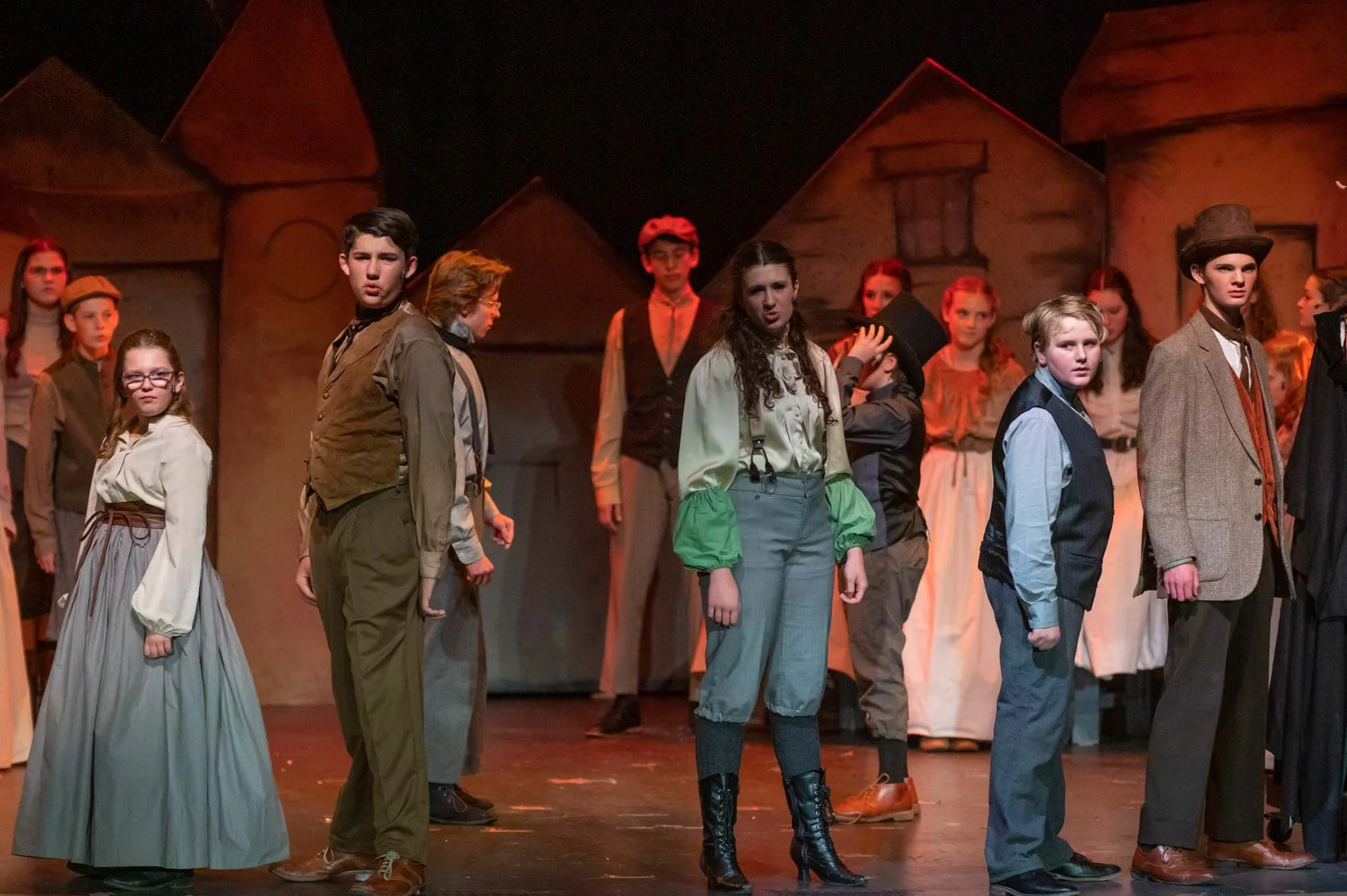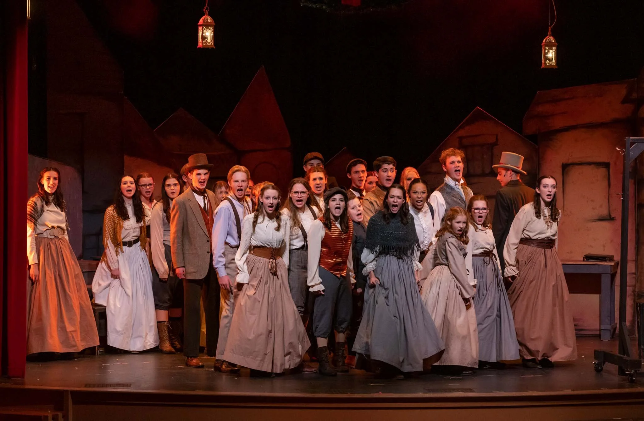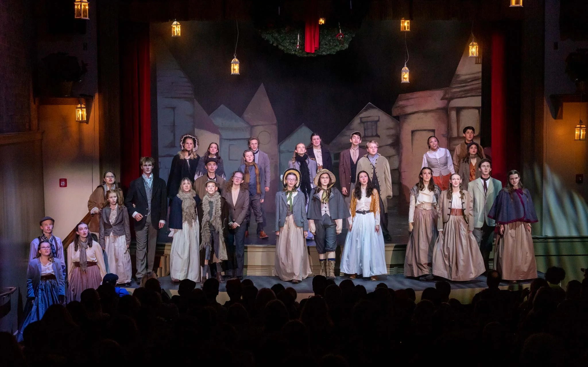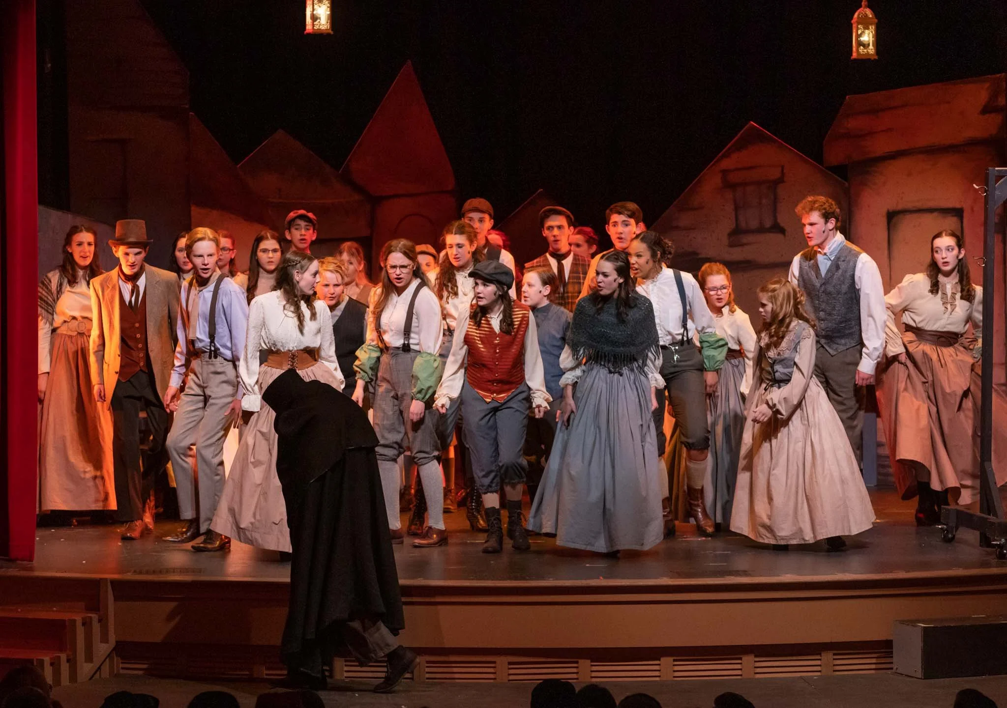 Group of young performers on stage in a theatrical production, dressed in period costumes, with a painted village backdrop and hanging lanterns.