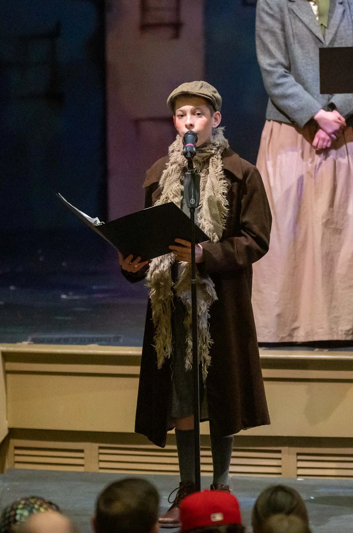 A young boy dressed in vintage costume with a cap, coat, and scarf, standing on stage at a microphone, holding a script, participating in a theatrical performance.