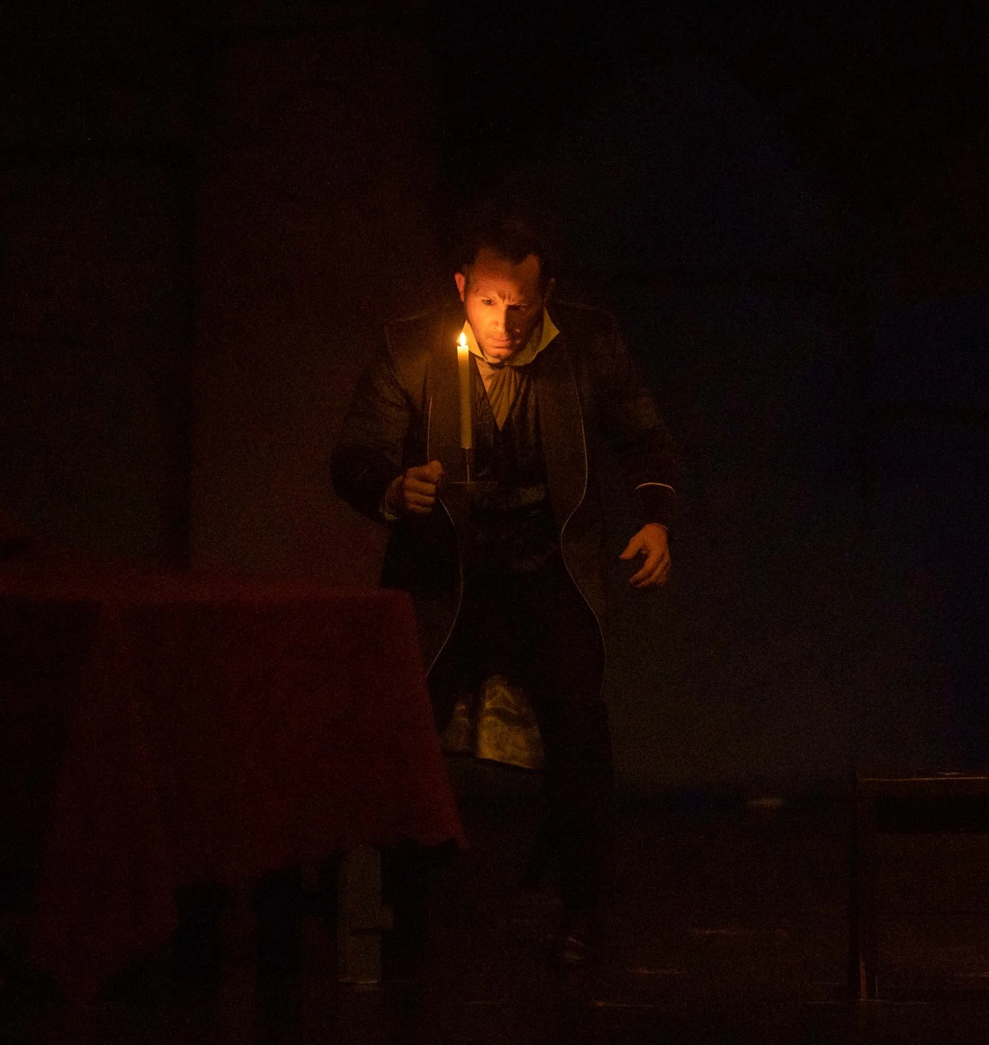 A theater stage with a person in costume, dressed in vintage clothing including a brown hat, red vest, beige blazer, and brown pants, standing against a painted backdrop of city buildings. Overhead, decorative lanterns and a wreath with hanging candl