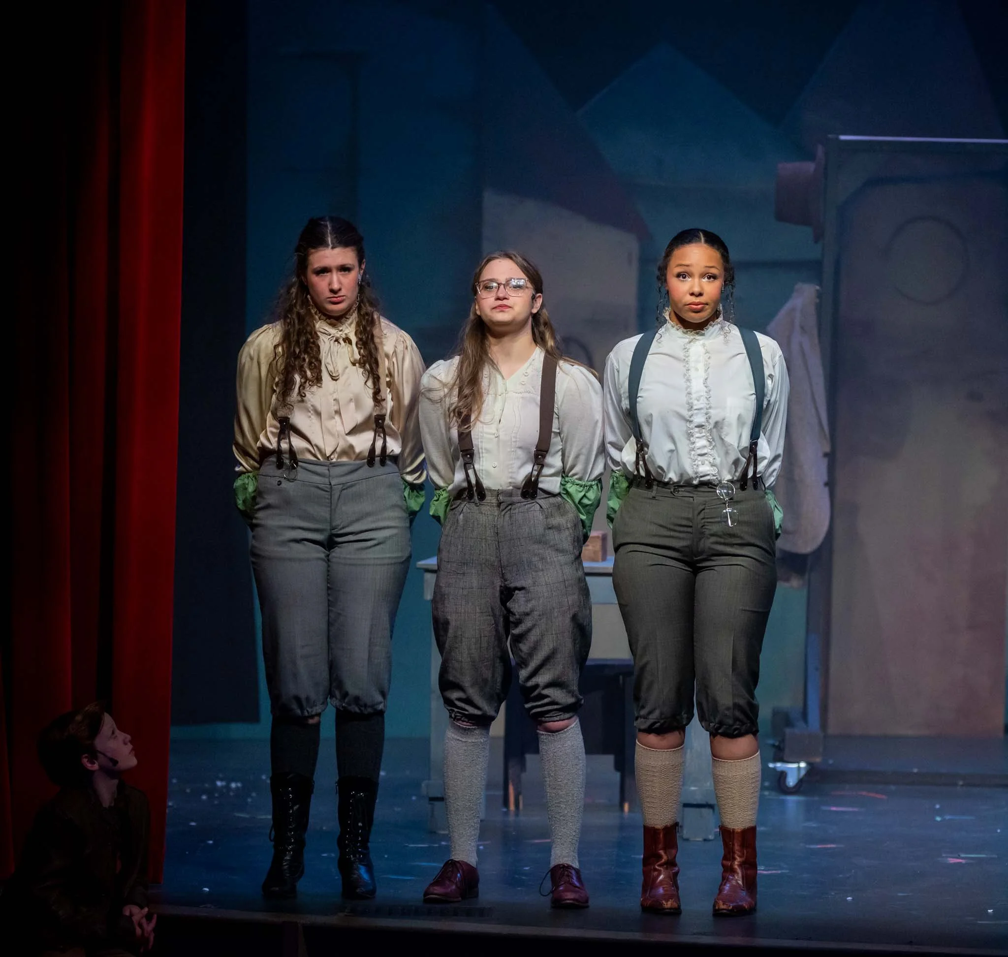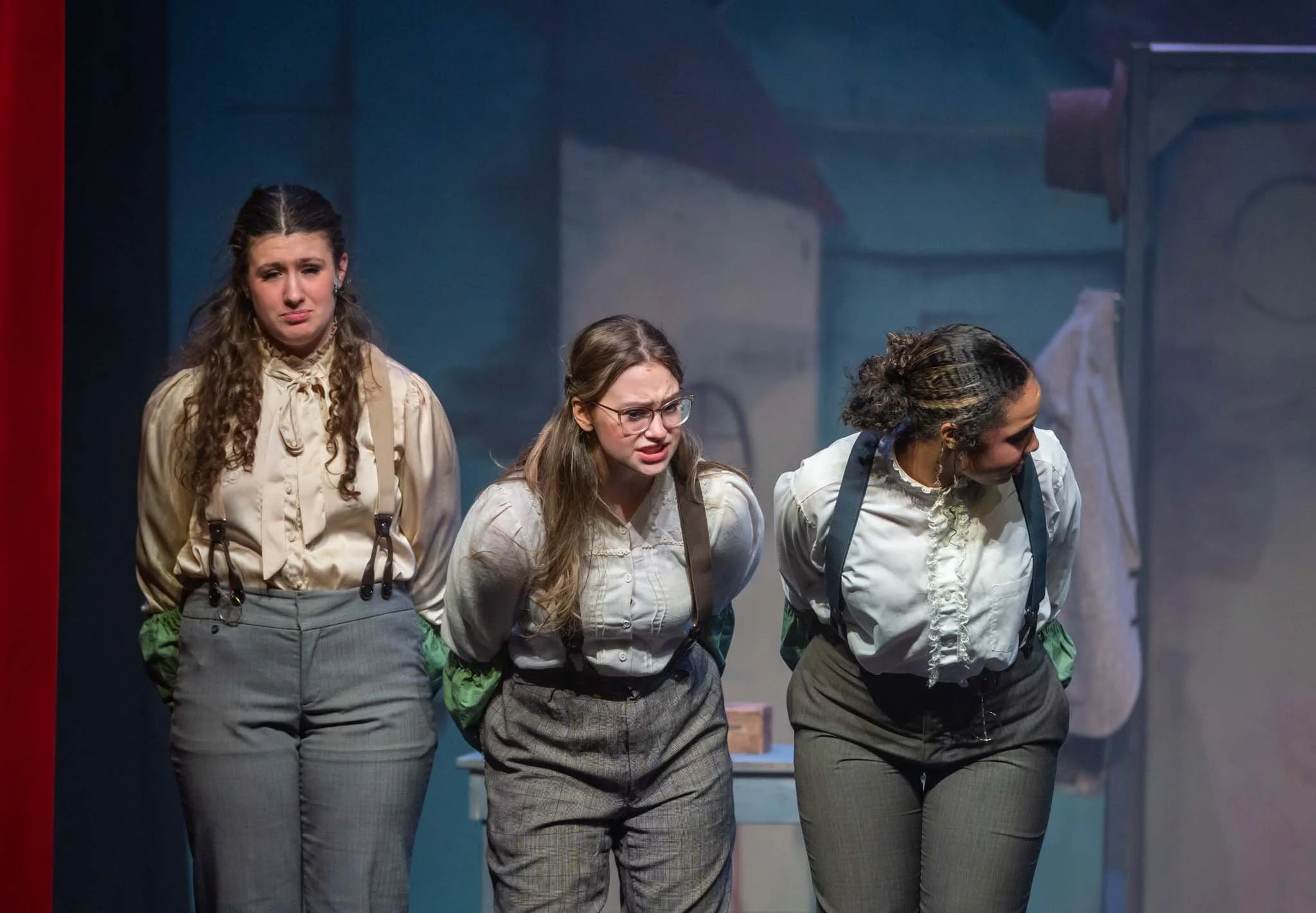 Three women standing on stage, wearing vintage-style outfits with suspenders and high-waisted pants, on a theater set with a painted backdrop.