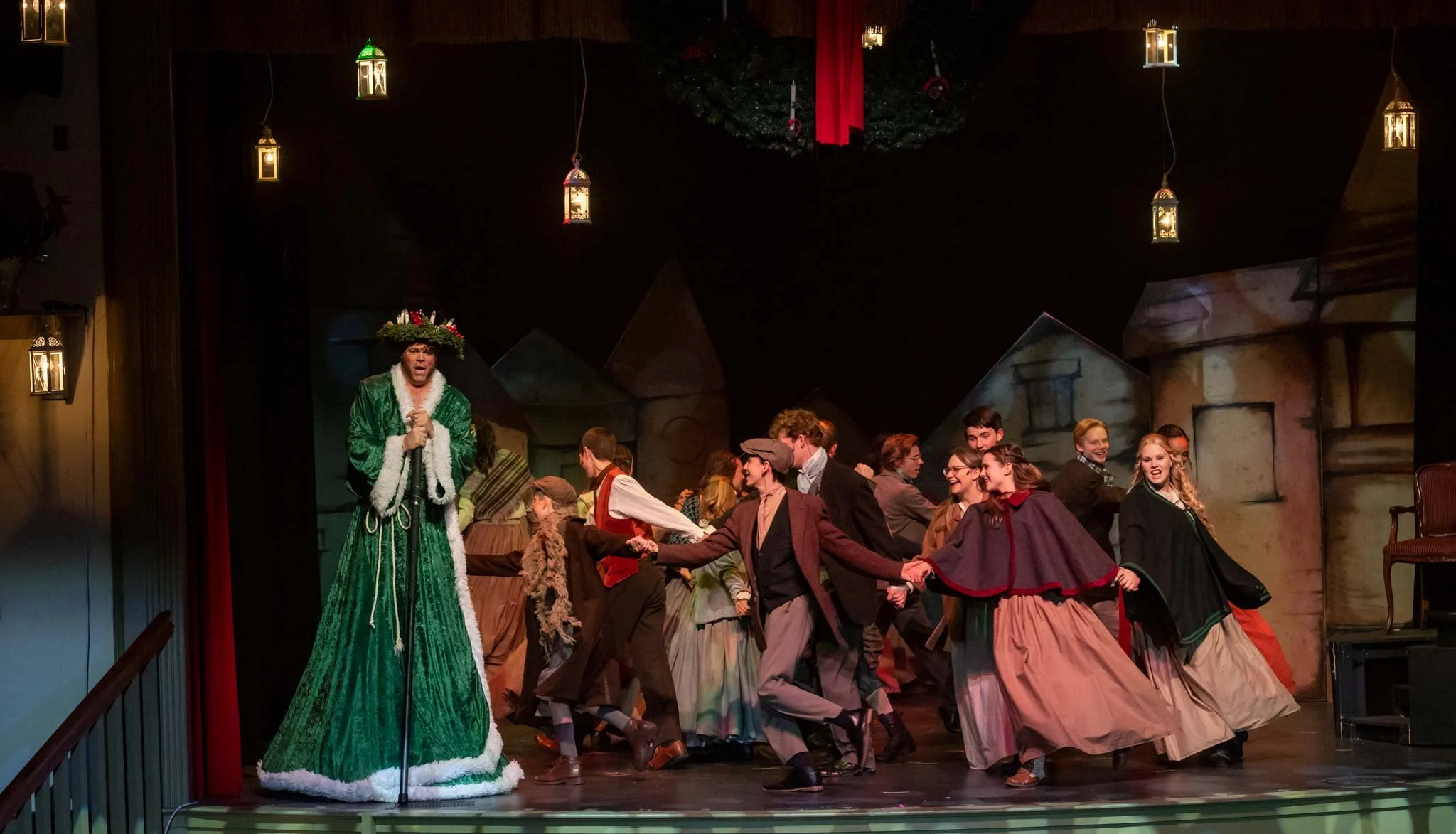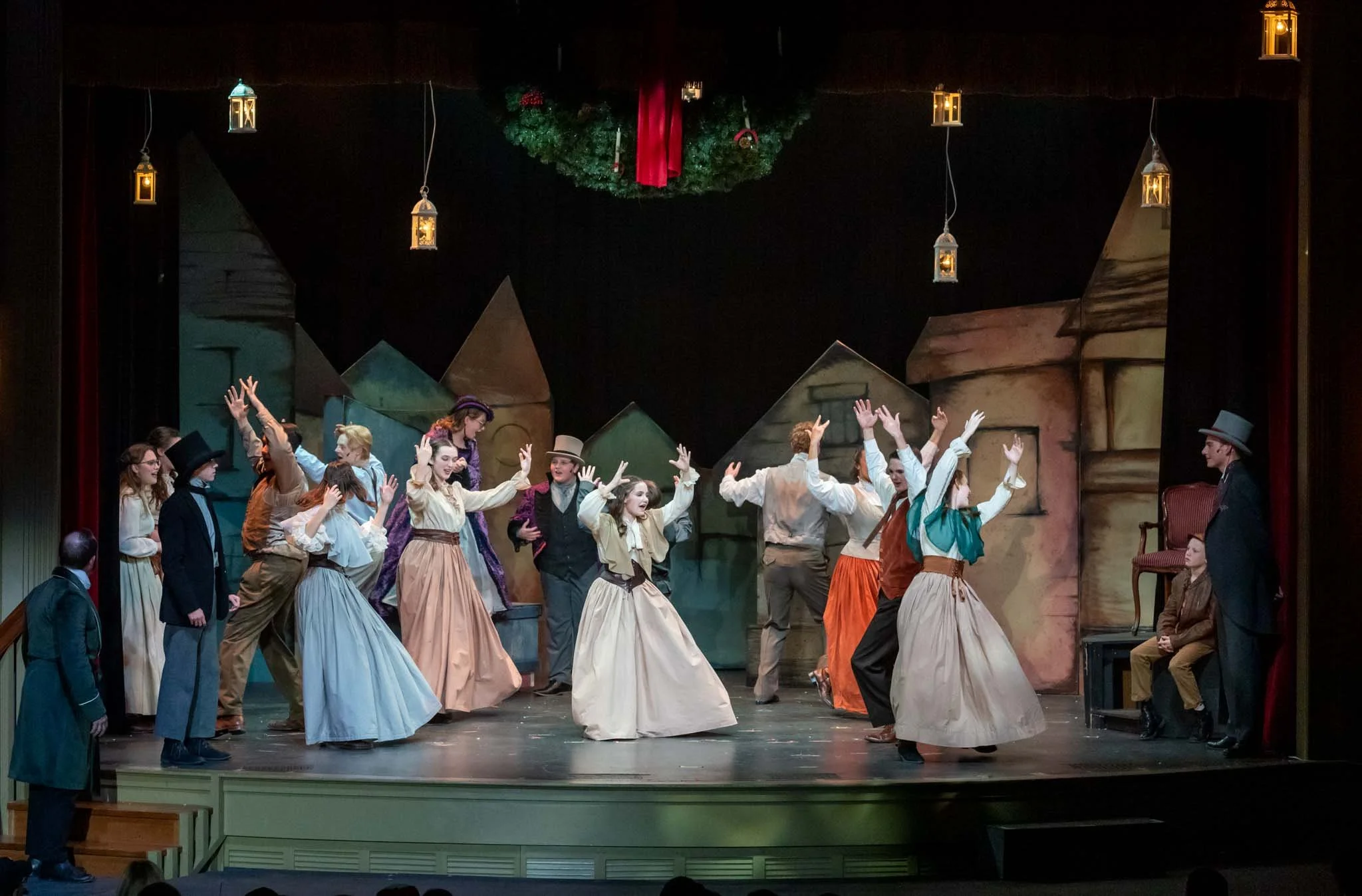 Theater stage scene with performers in historical costumes, one dressed as a Christmas tree, and others engaged in a lively musical number.