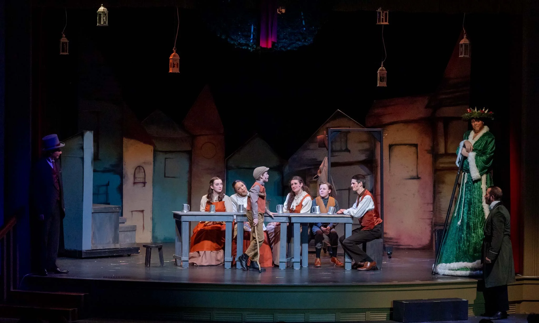 A theater scene with seven actors on stage, dressed in vintage costumes, participating in a play set in a quaint town. One actor in a green robe with a large crown of candles and greenery appears to be portraying Santa Claus or a similar figure, stan