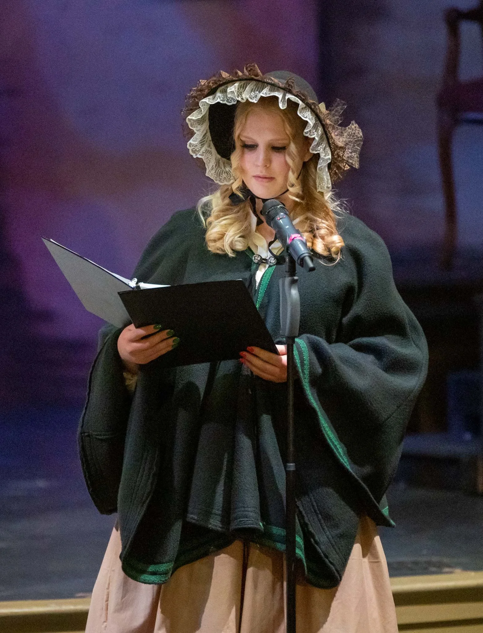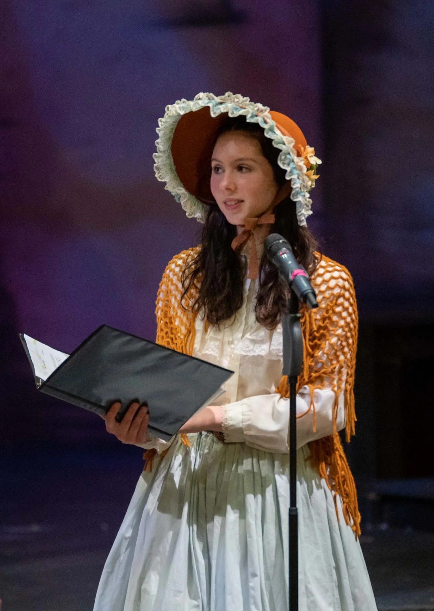 A young woman dressed in historical costume, including a bonnet and long skirt, is standing on a stage reading from a book into a microphone.
