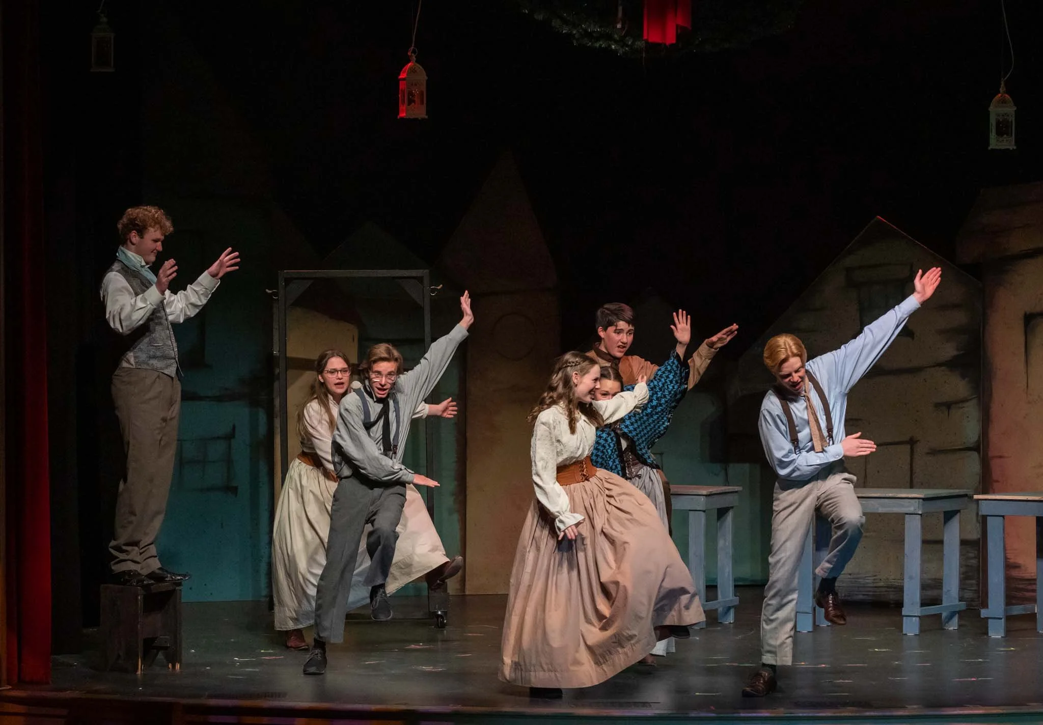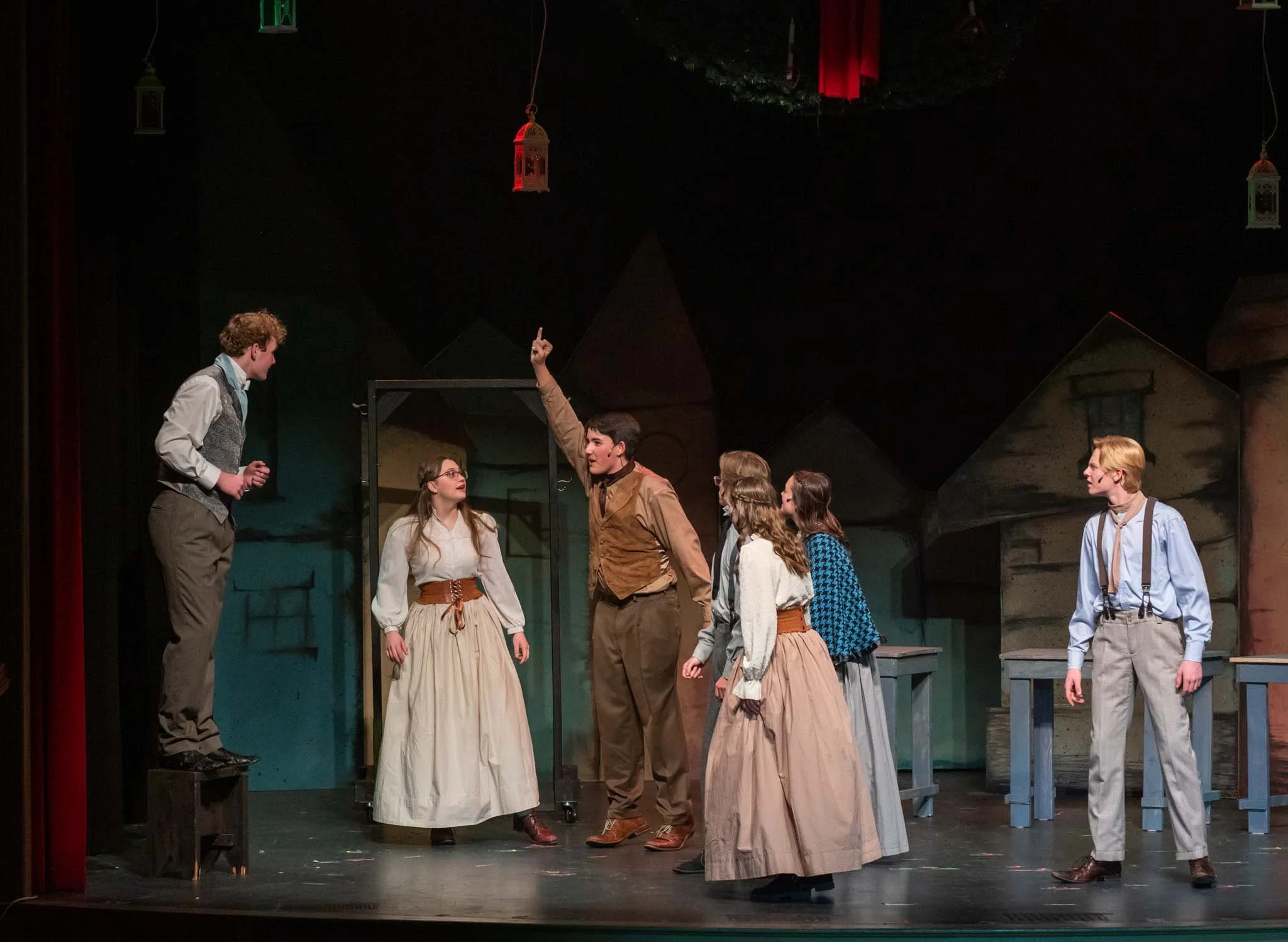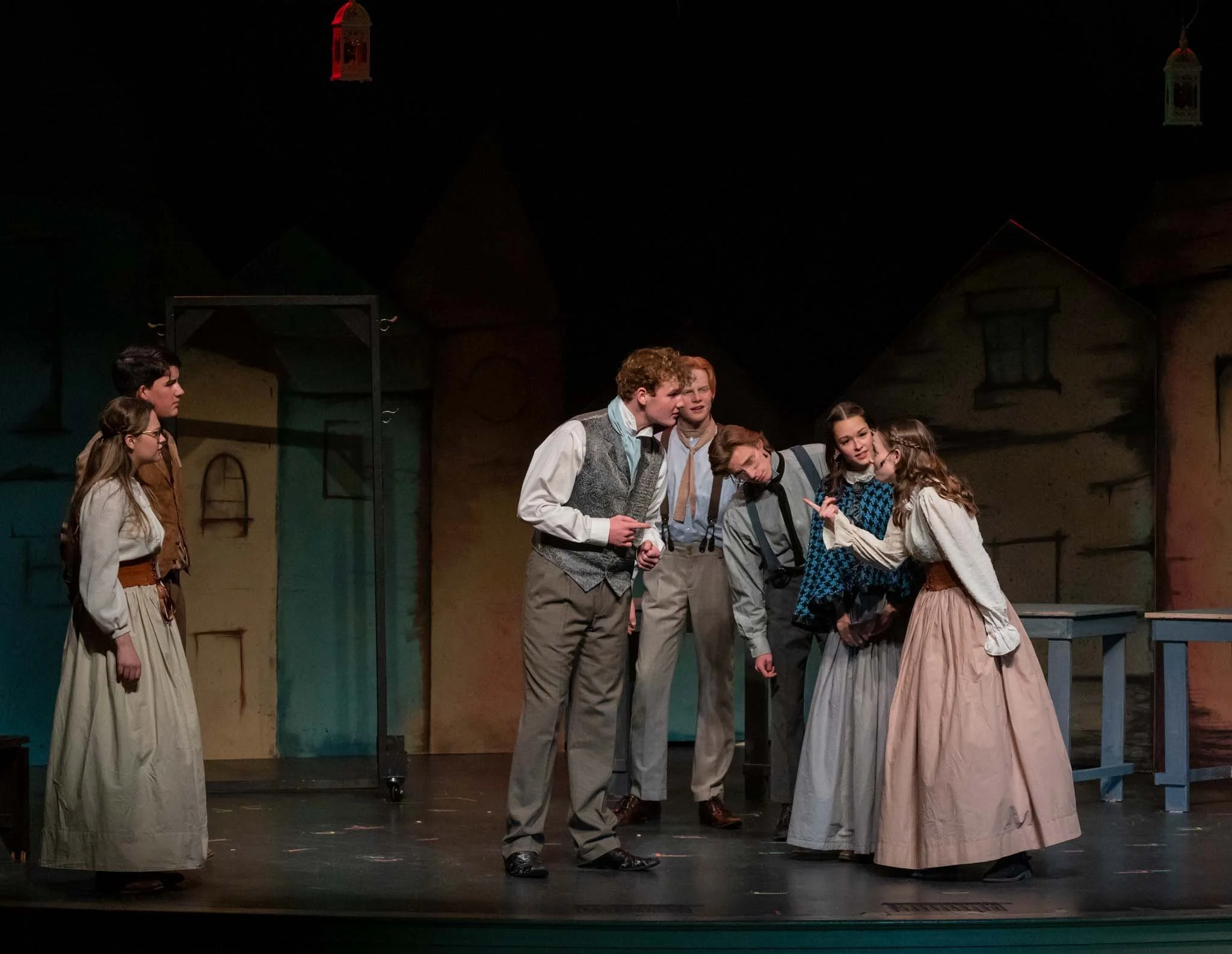 A theatrical stage scene with seven young actors performing in period costumes, with painted set pieces resembling a village and hanging lantern decorations overhead.
