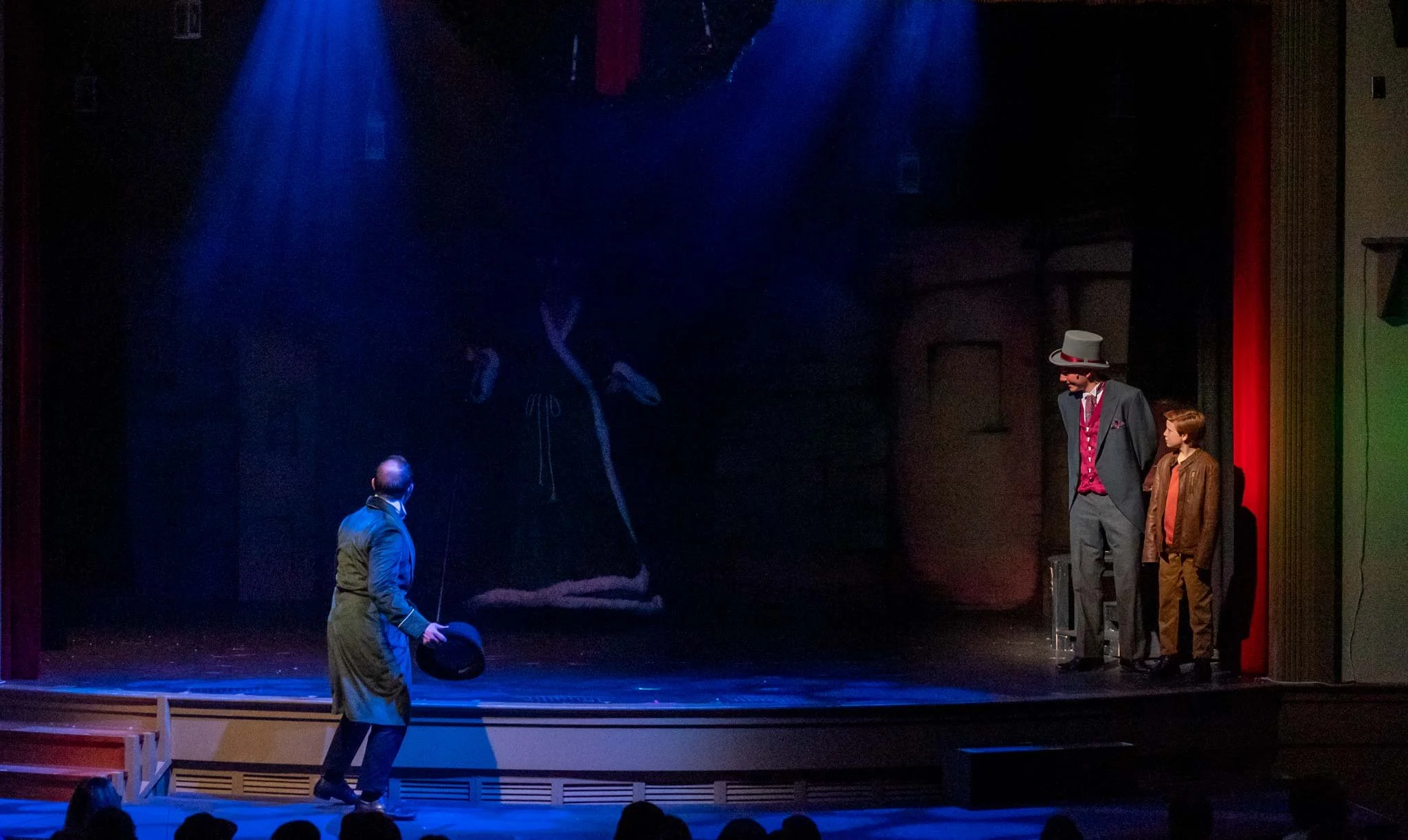 Three actors performing on a dimly lit stage with blue and warm lighting. One actor is sitting on the left, touching a hat, while two actors on the right stand near a red curtain, with one older man wearing a top hat and a young boy in a leather jack