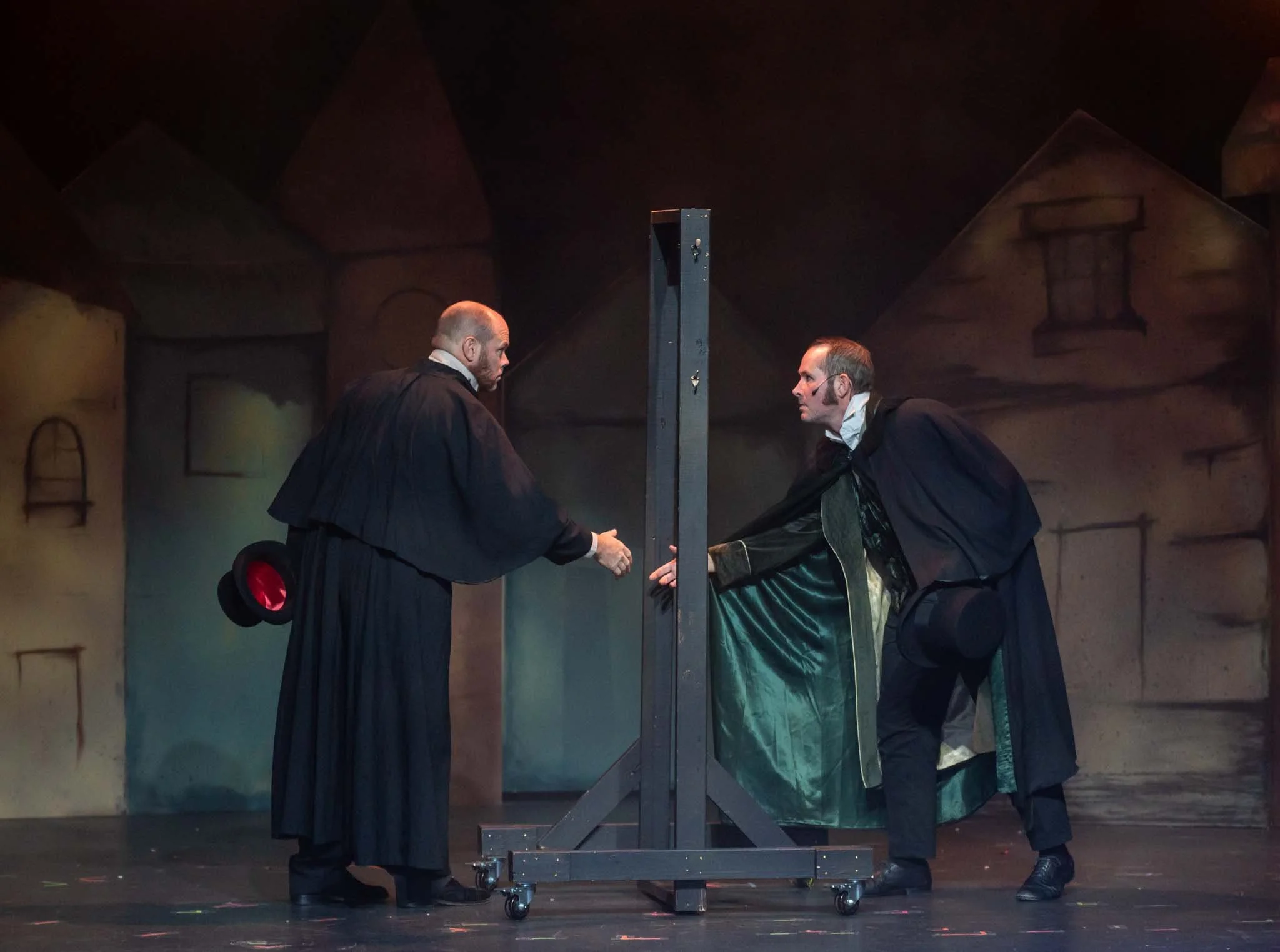 The cast of a theatrical production on stage, dressed in period costumes, performing with expressive gestures and voices, with a set depicting buildings in the background.